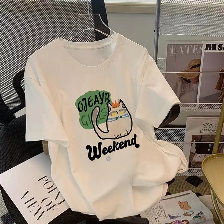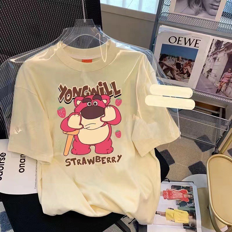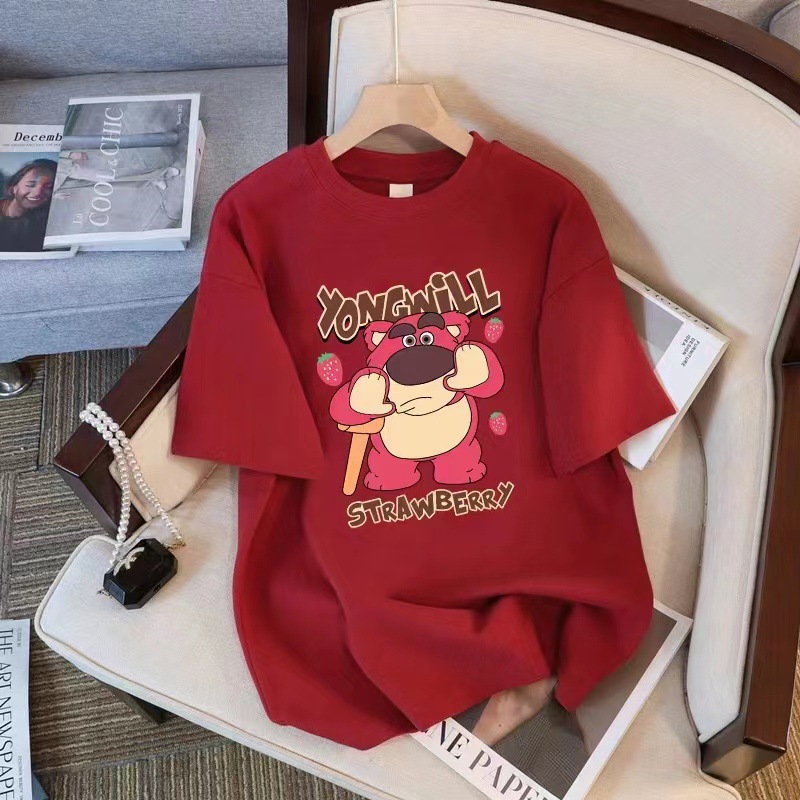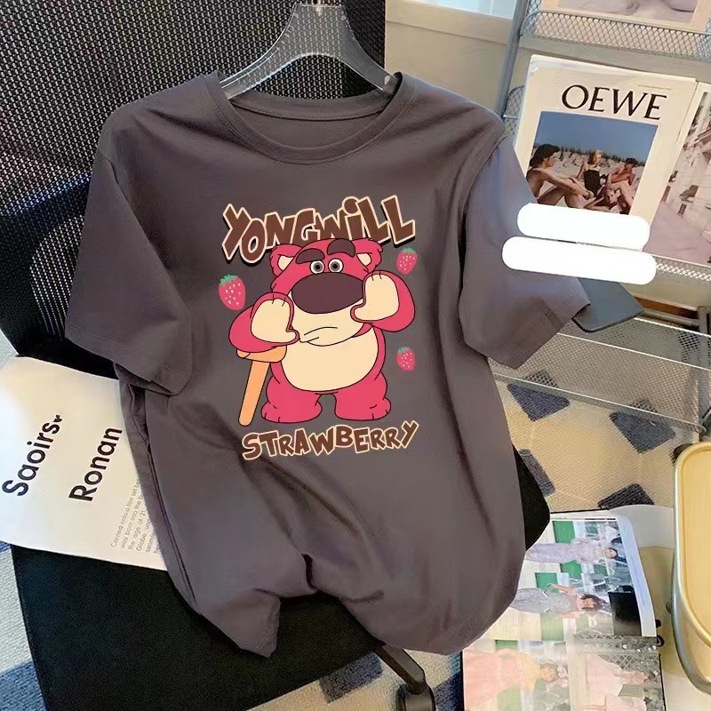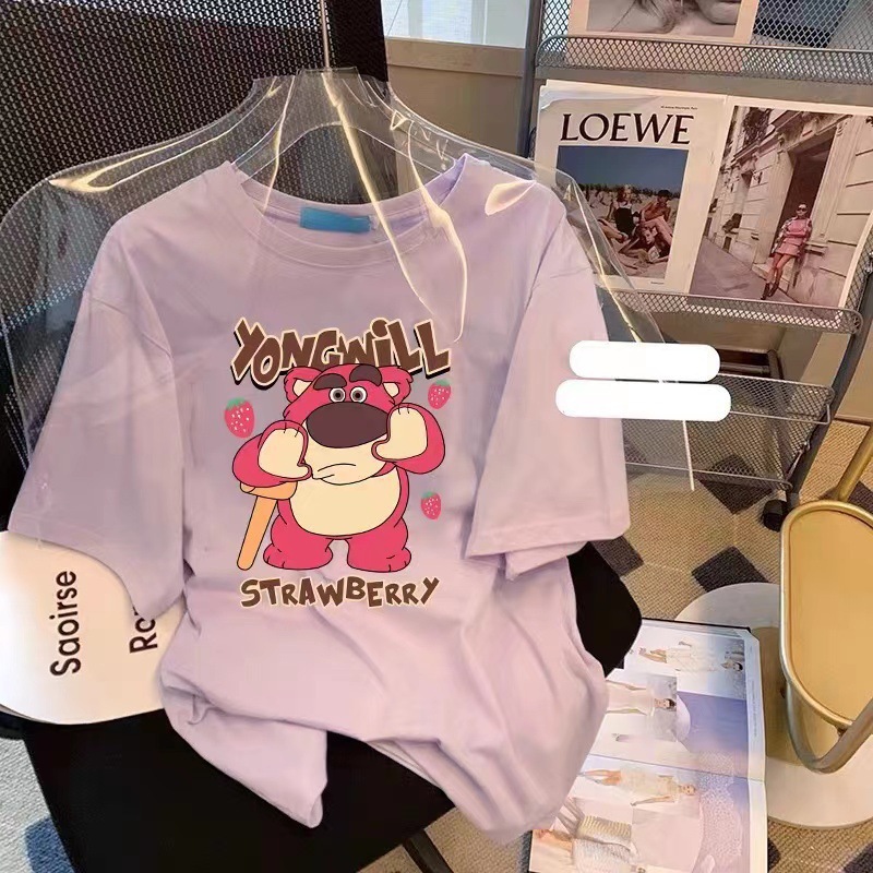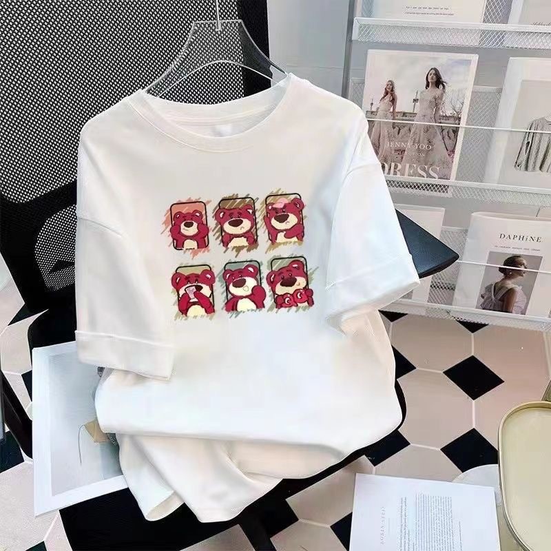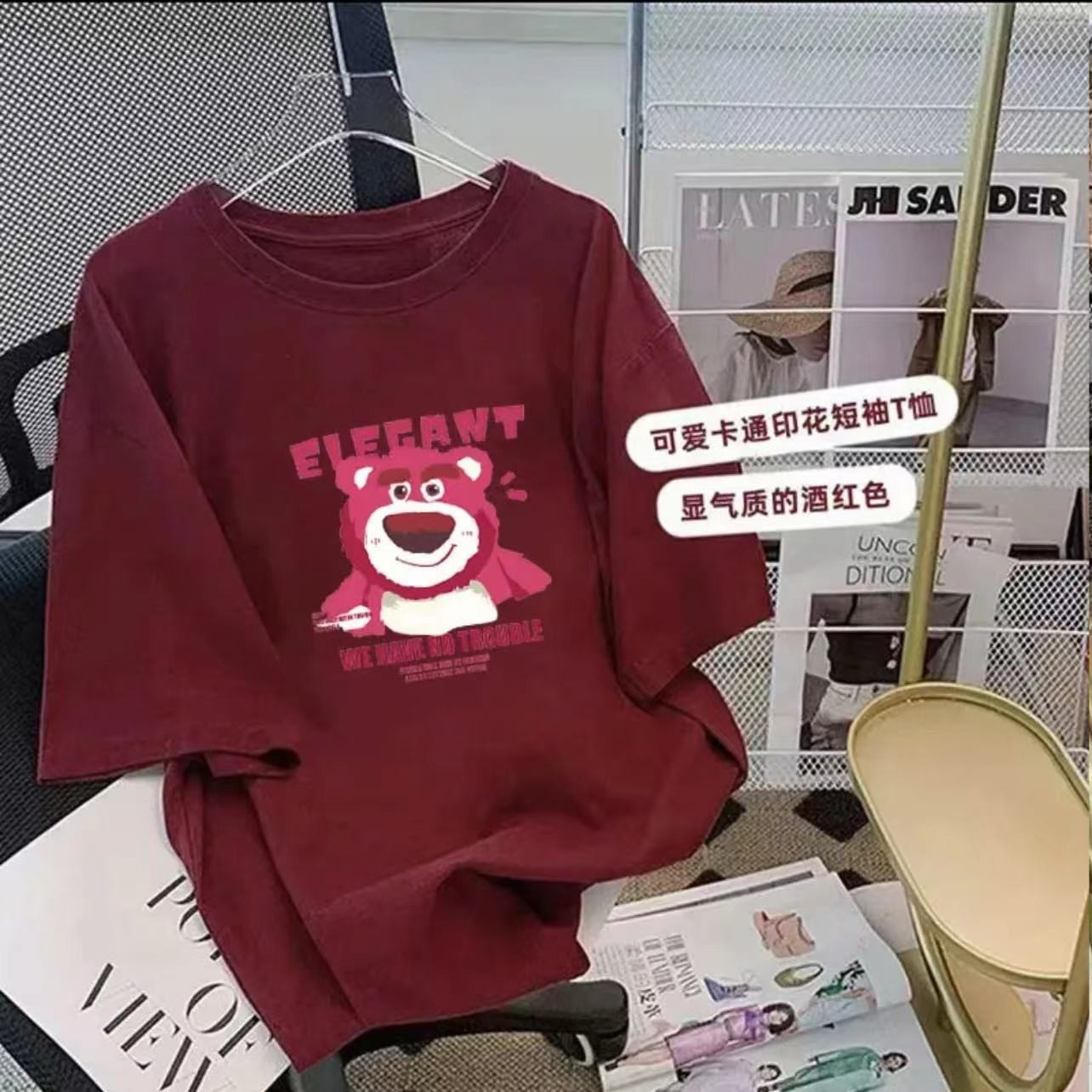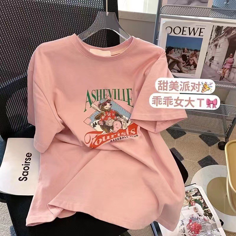 Kaus lengan pendek wanita, kaus kerah tas katun wanita motif kartun, atasan longgar panjang menengah kasual Semua cocok Musim Panas 2024