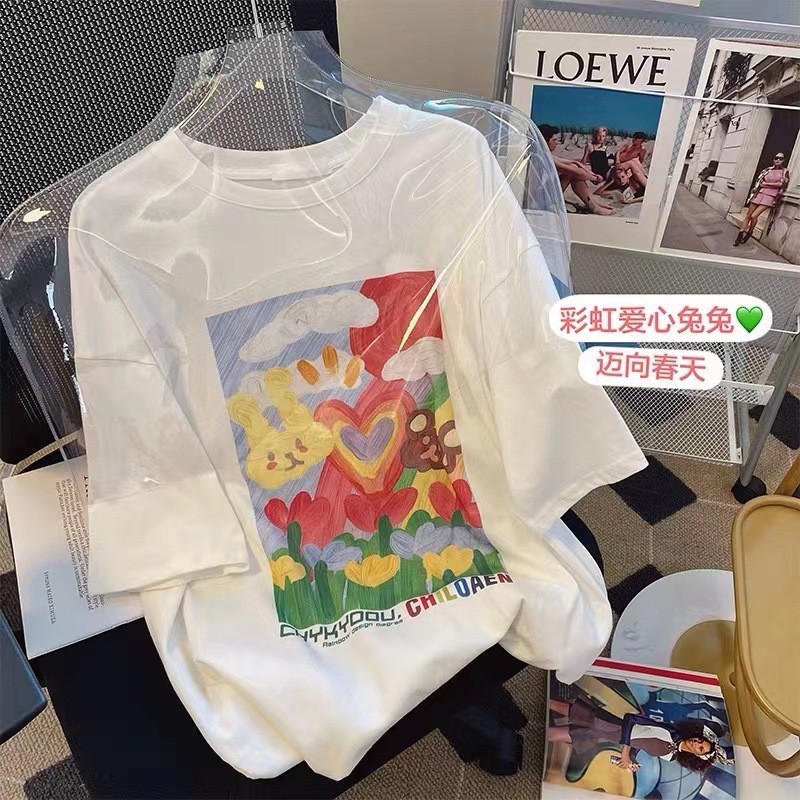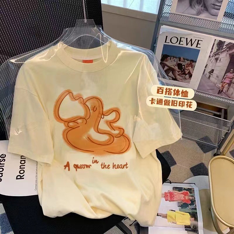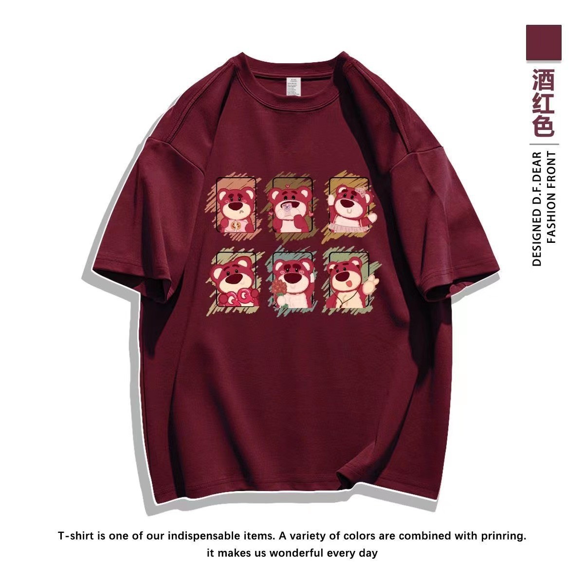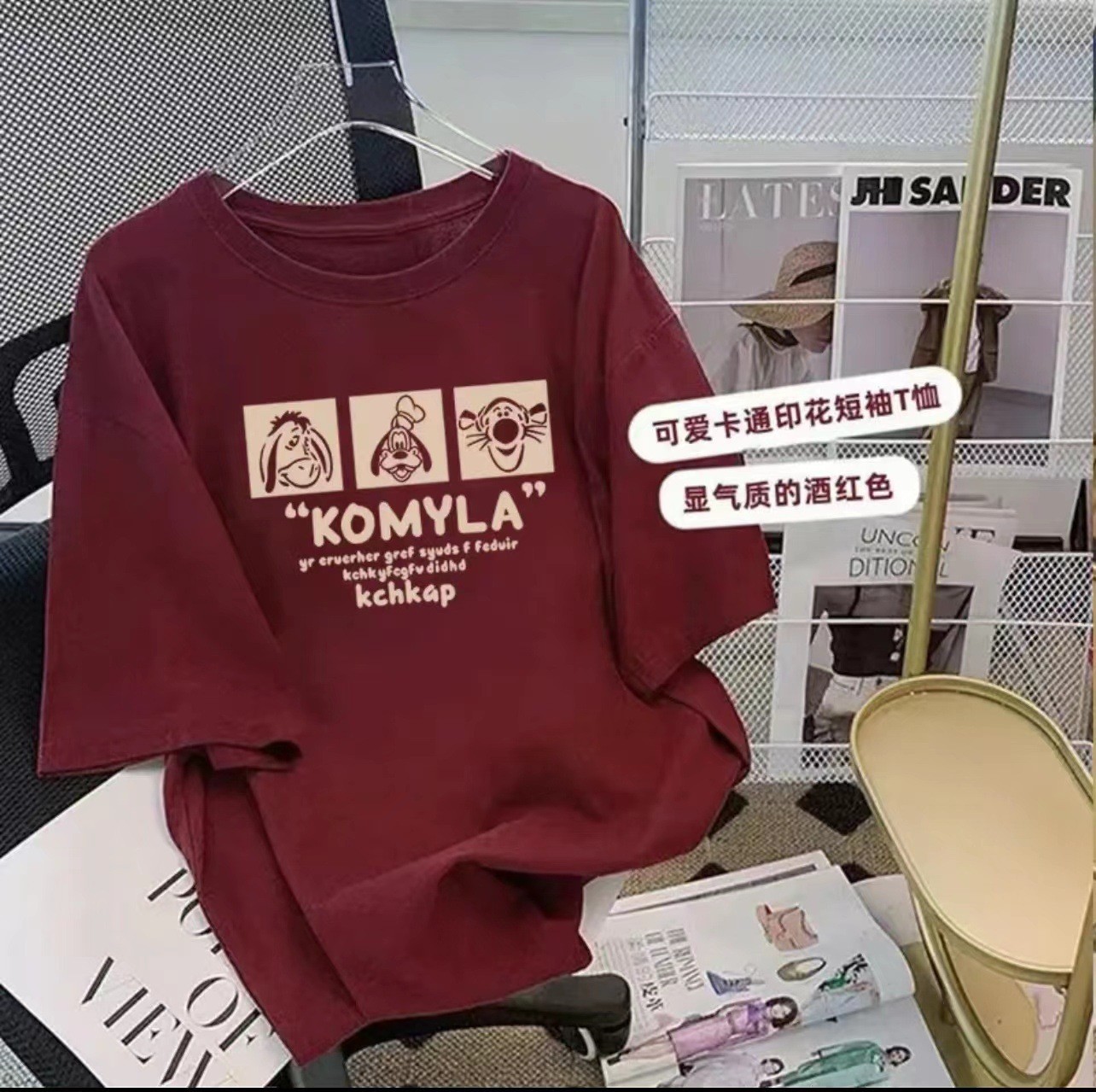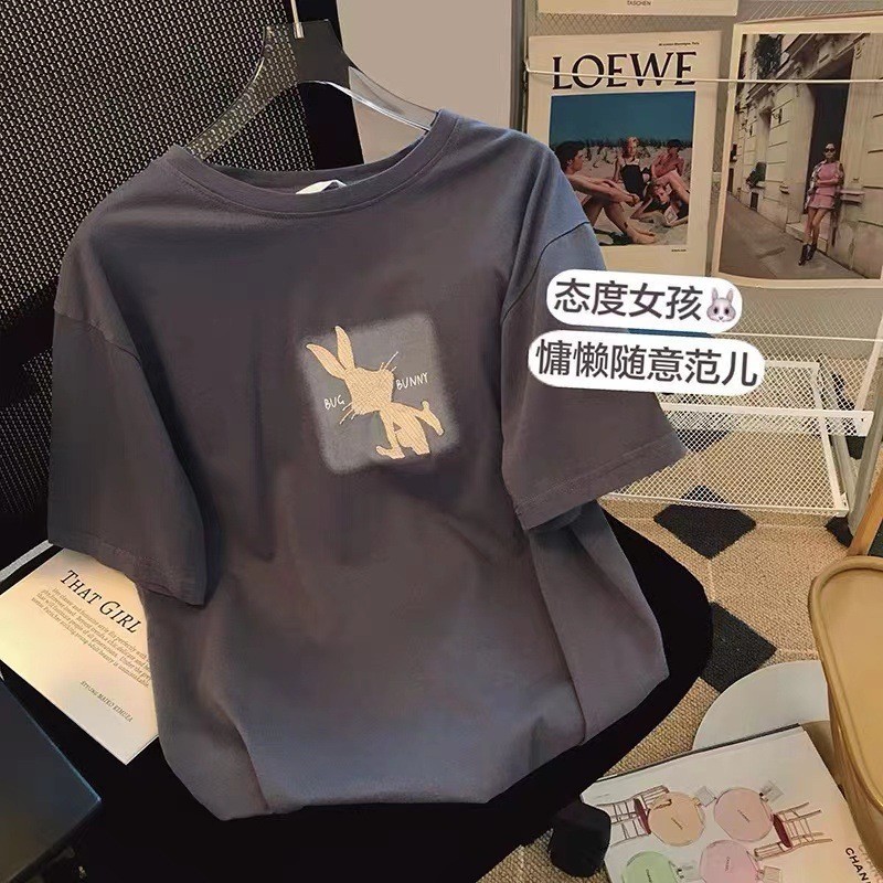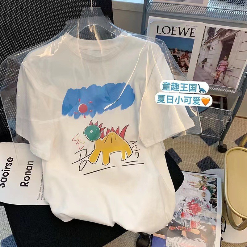 Kaus lengan pendek wanita, kaus kerah tas katun wanita motif kartun, atasan longgar panjang menengah kasual Semua cocok Musim Panas 2024
