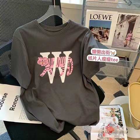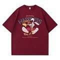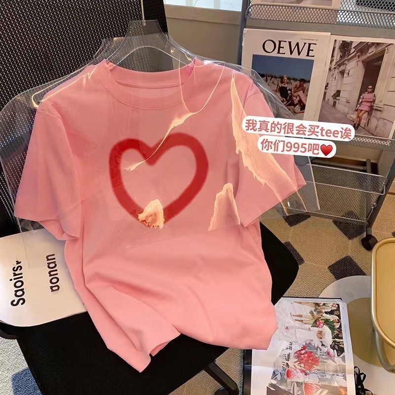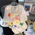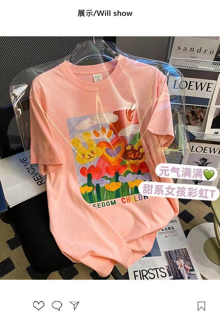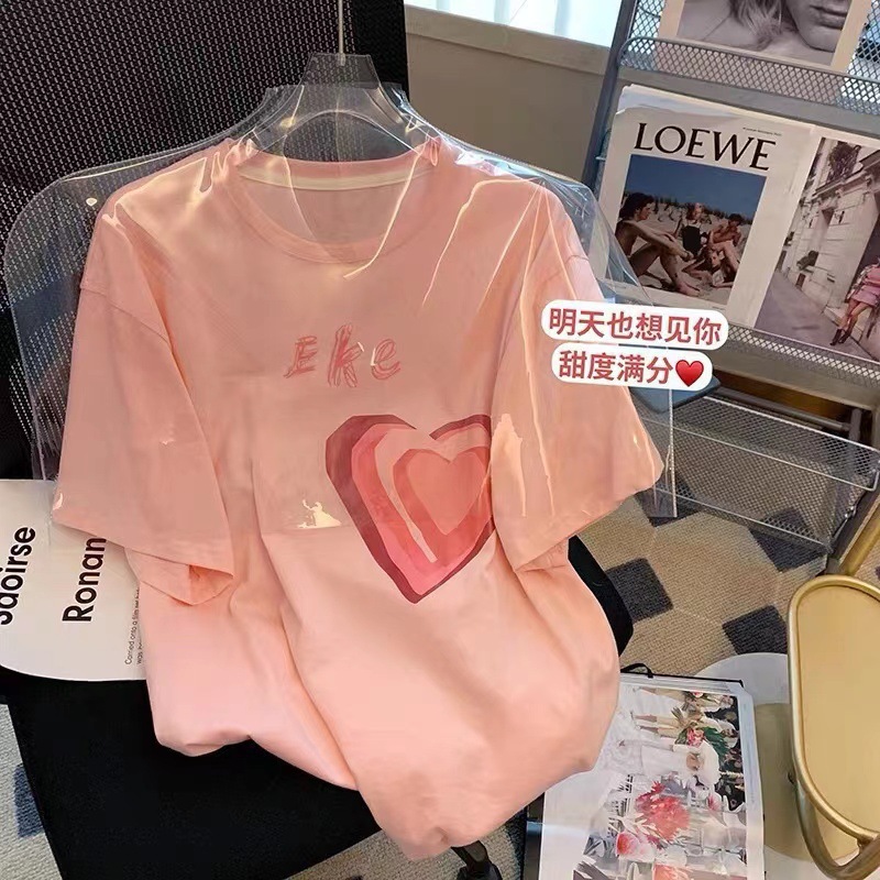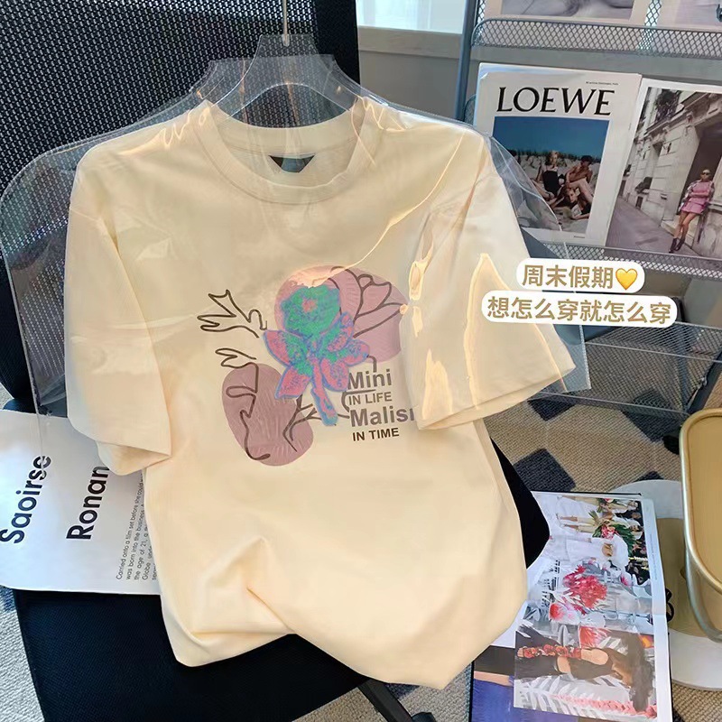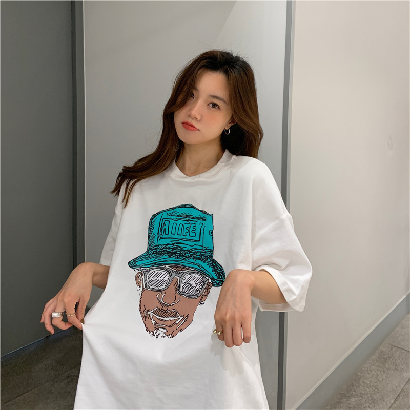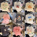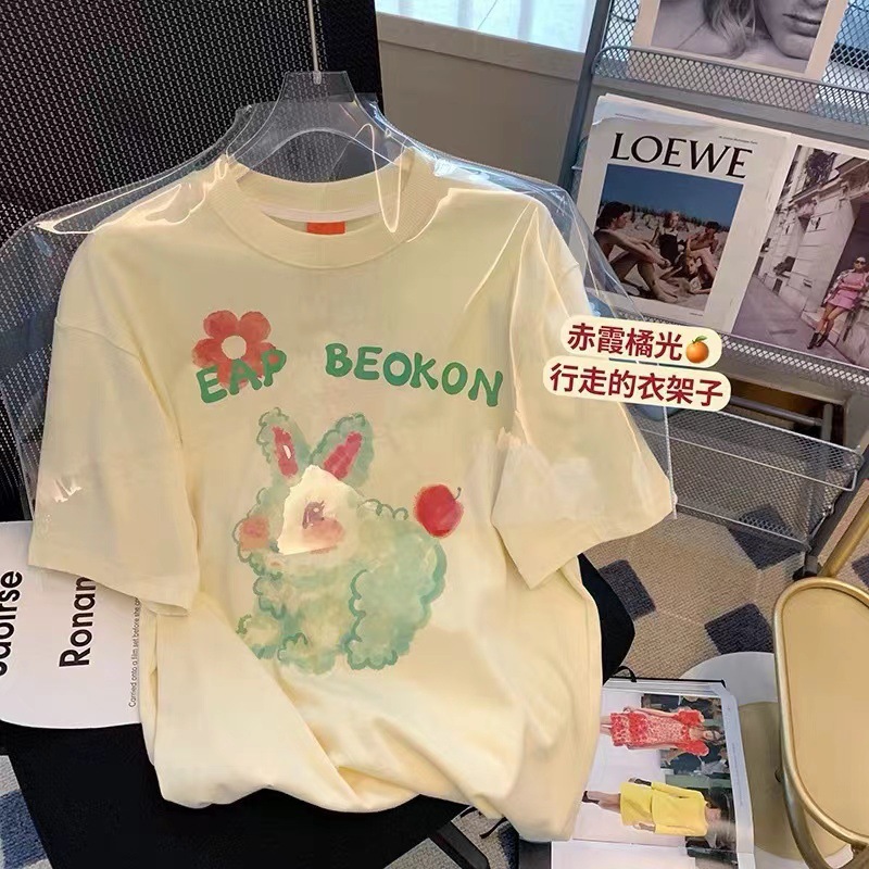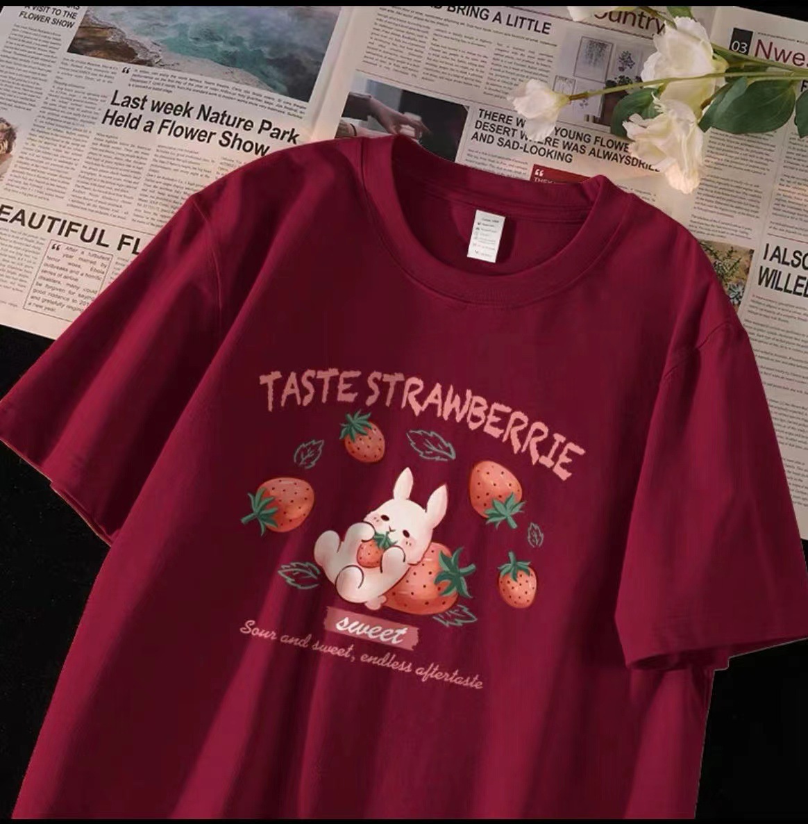 Kaus lengan pendek wanita, kaus kerah tas katun wanita motif kartun, atasan longgar panjang menengah kasual Semua cocok Musim Panas 2024