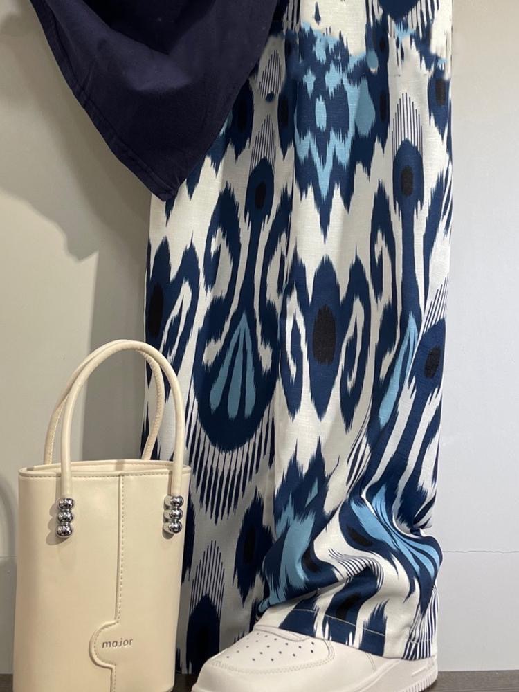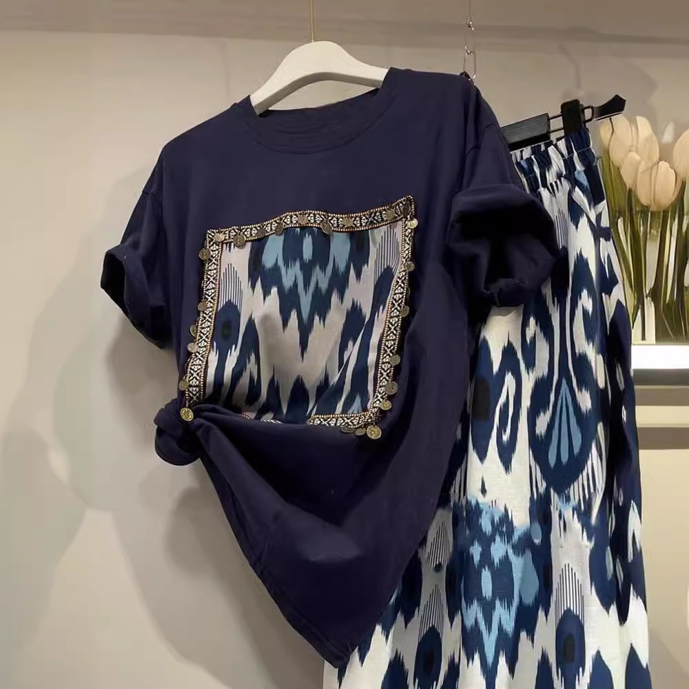 Kaus lengan pendek motif antik + celana panjang tirai pinggang tinggi kaki lebar baru T-shirt wanita musim panas kasual modis setelan dua potong