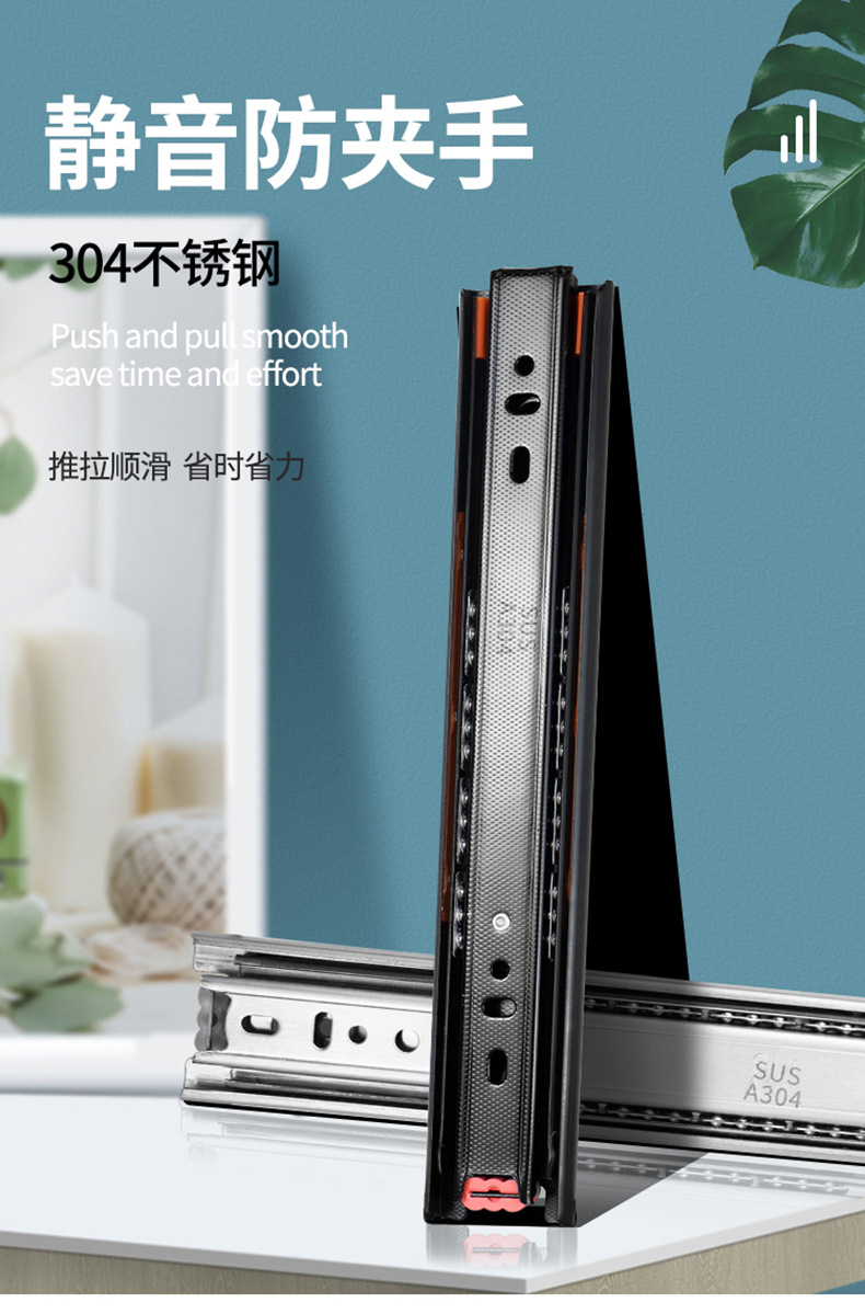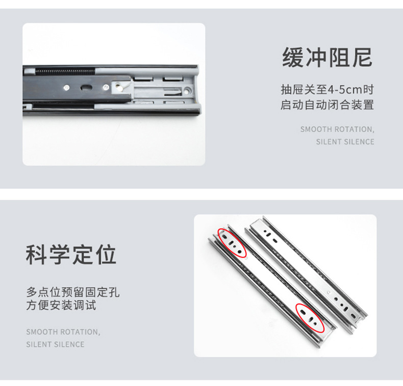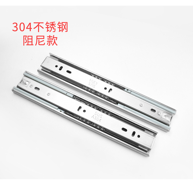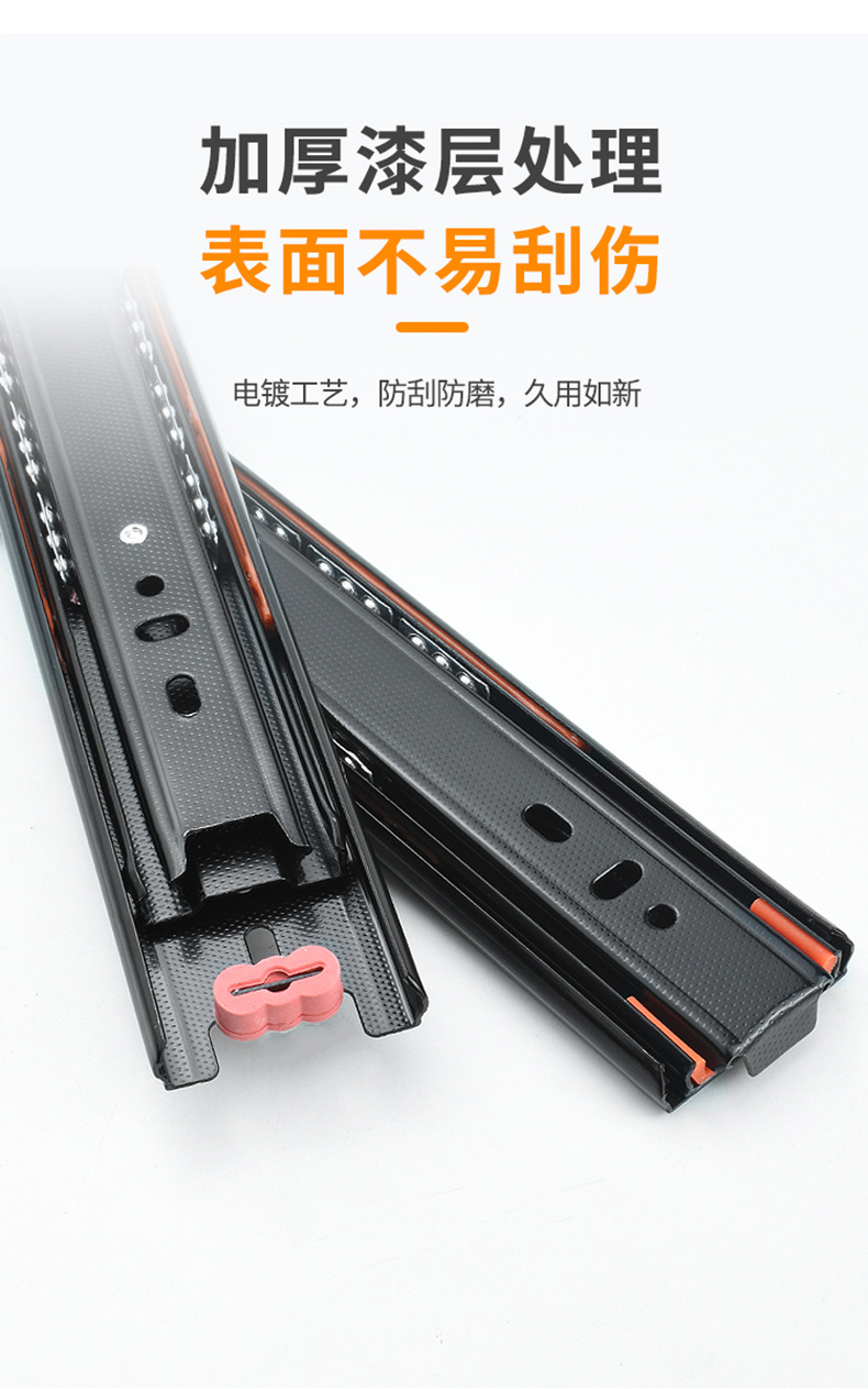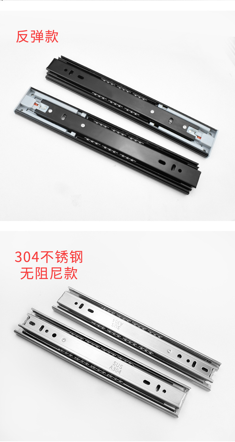 Rel geser tiga bagian industri dengan peredam senyap bola baja, rel pemandu tiga bagian untuk laci, perangkat keras keranjang tarik, aksesori rumah tangga.