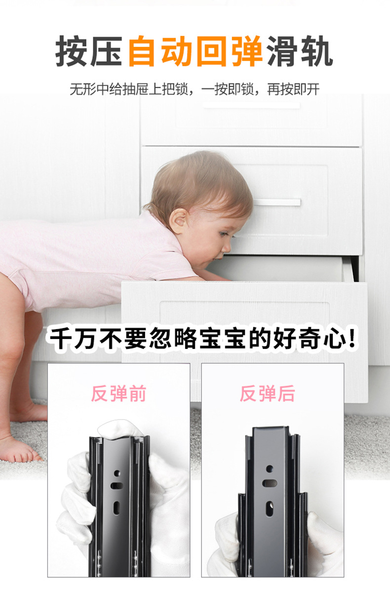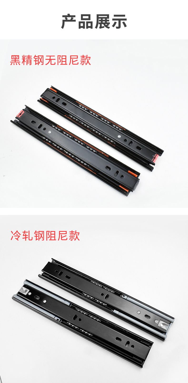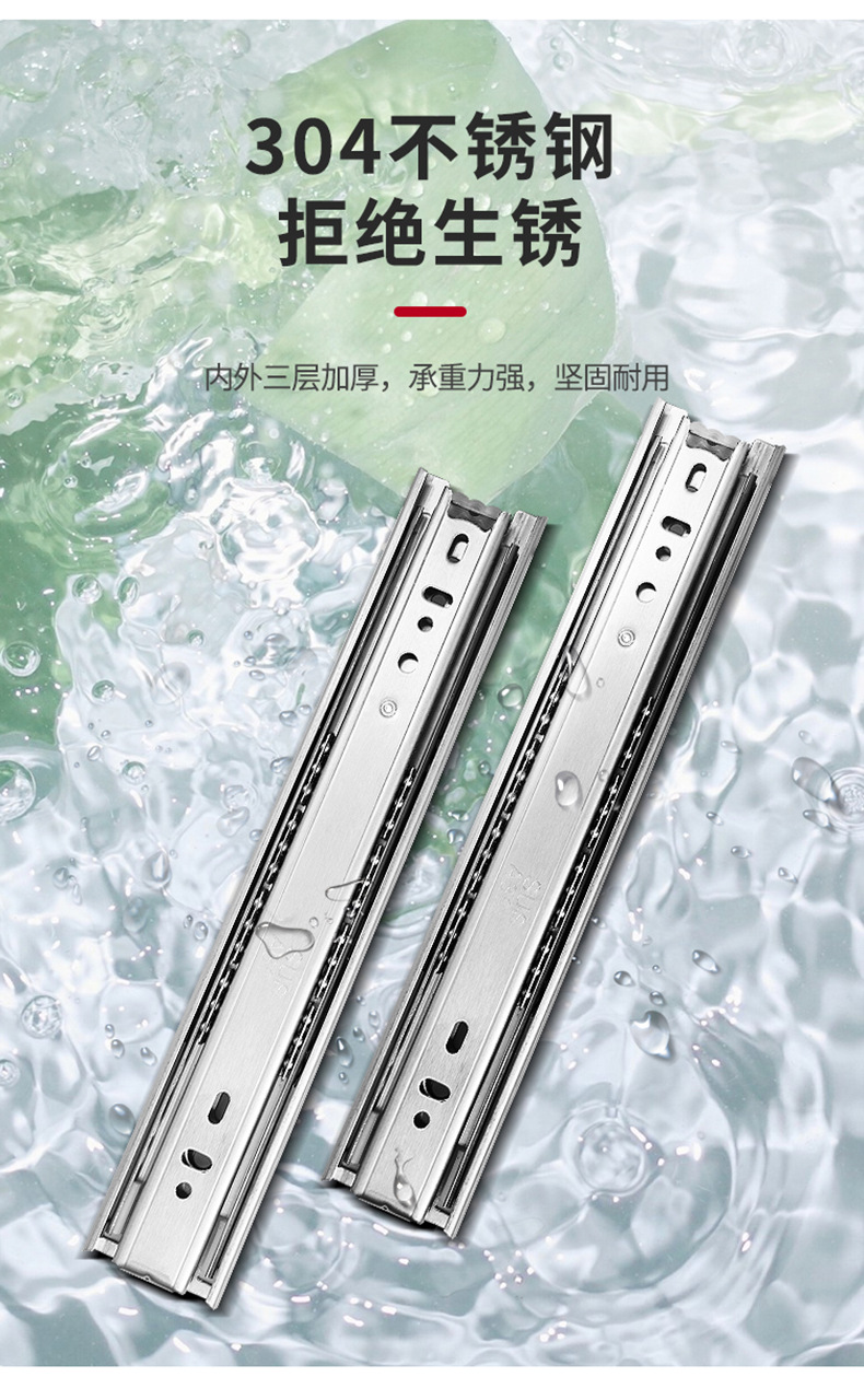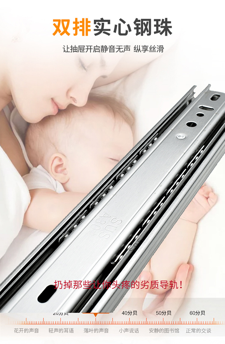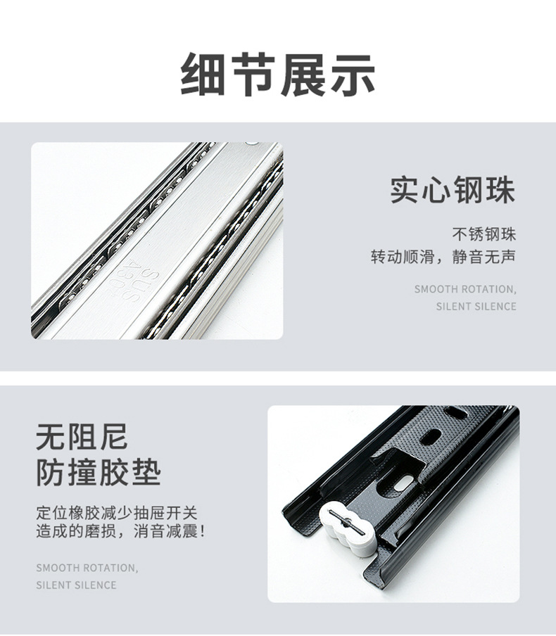 Rel geser tiga bagian industri dengan peredam senyap bola baja, rel pemandu tiga bagian untuk laci, perangkat keras keranjang tarik, aksesori rumah tangga.