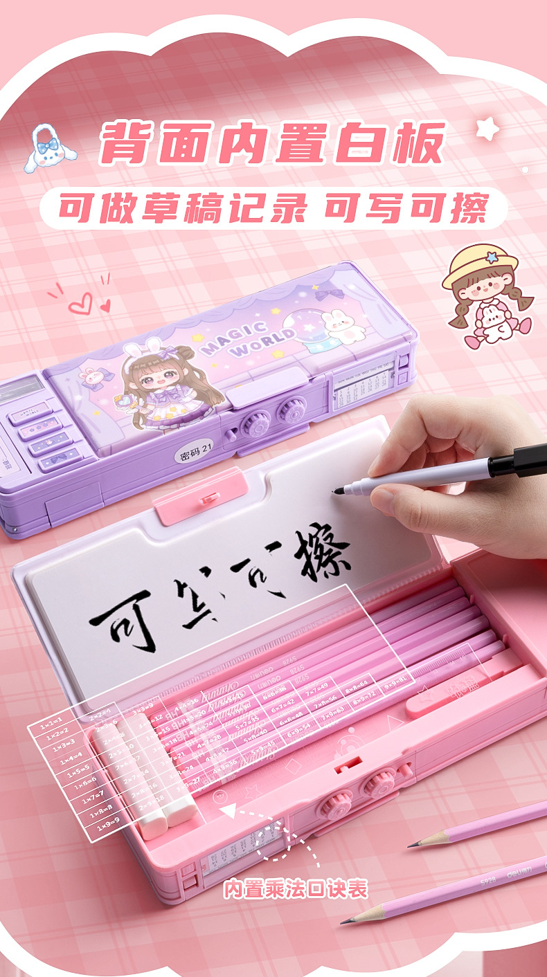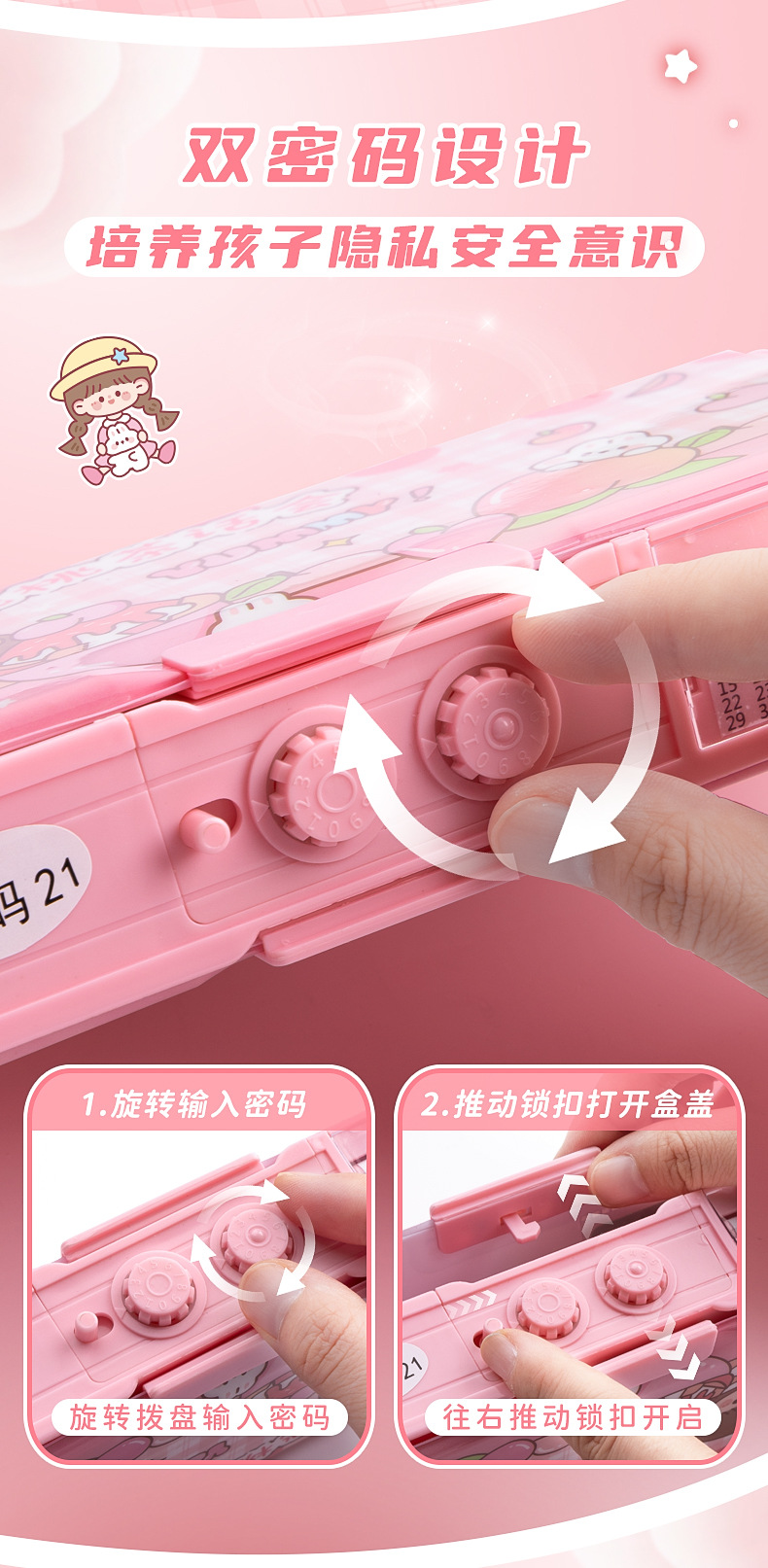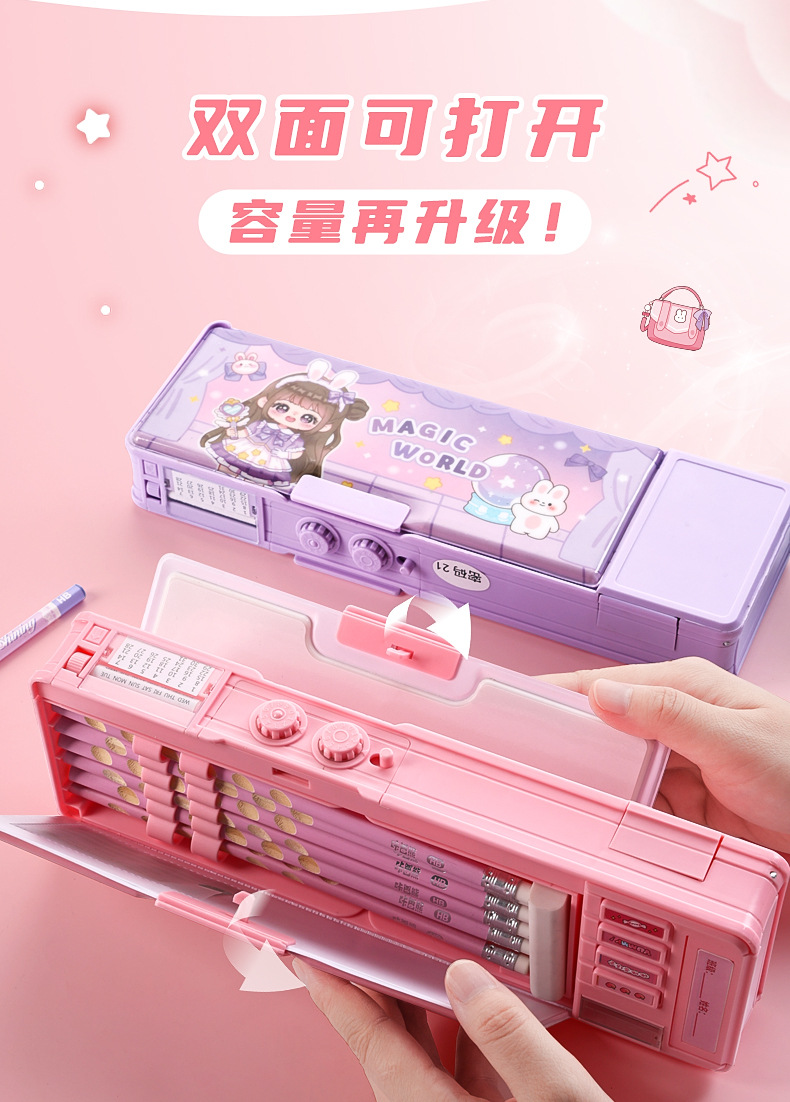 Kotak mekanik kotak alat tulis kotak pensil kotak pensil kartun pintar kotak penyimpanan dua lapis anak-anak dengan kunci sandi kapasitas besar.