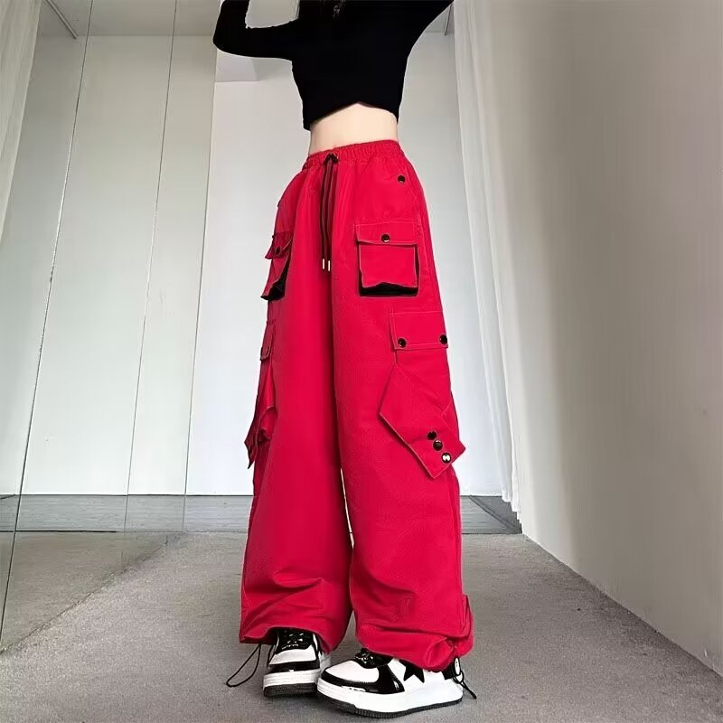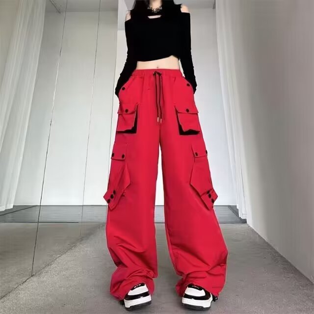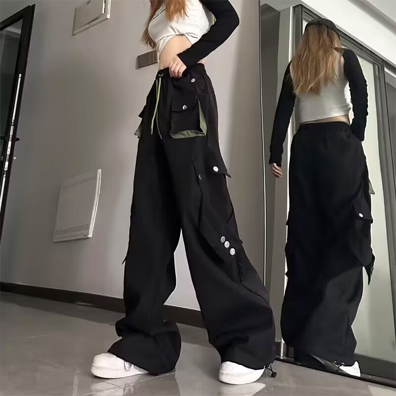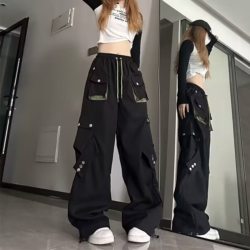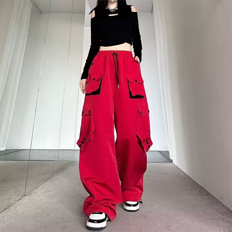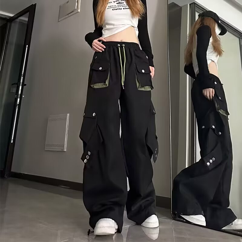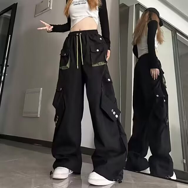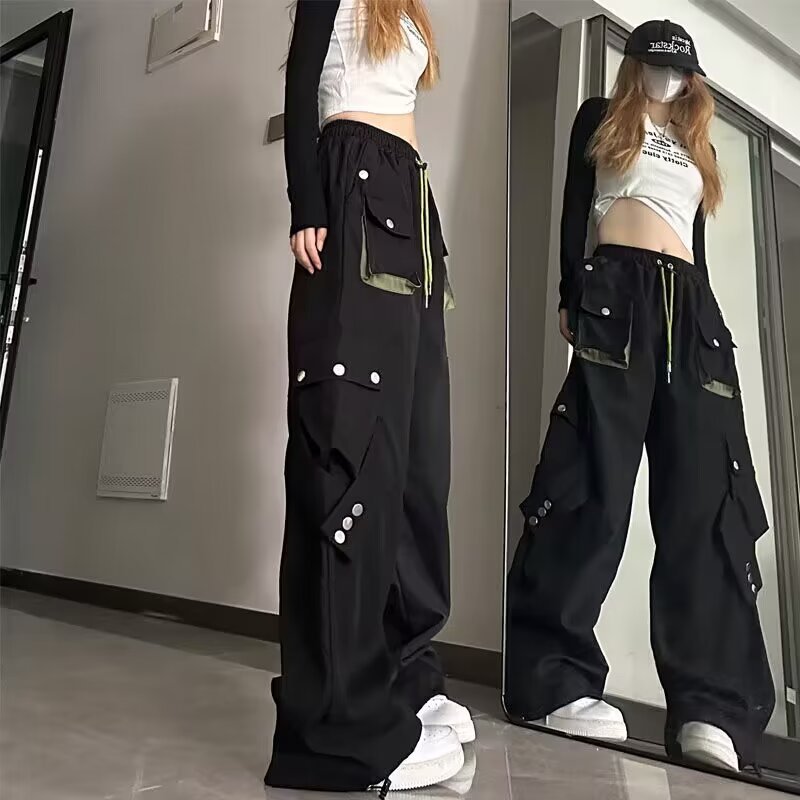 Celana panjang kasual gaya jalanan Amerika celana panjang lurus wanita warna kontras longgar musim gugur celana panjang kaki lebar ikat pergelangan kaki lurus bersaku