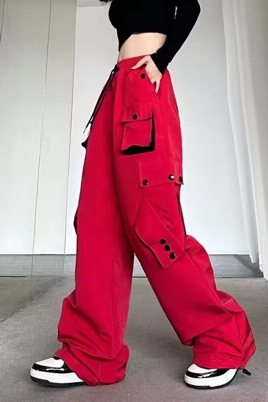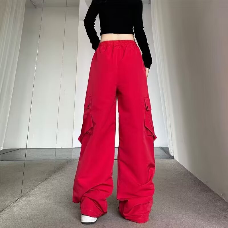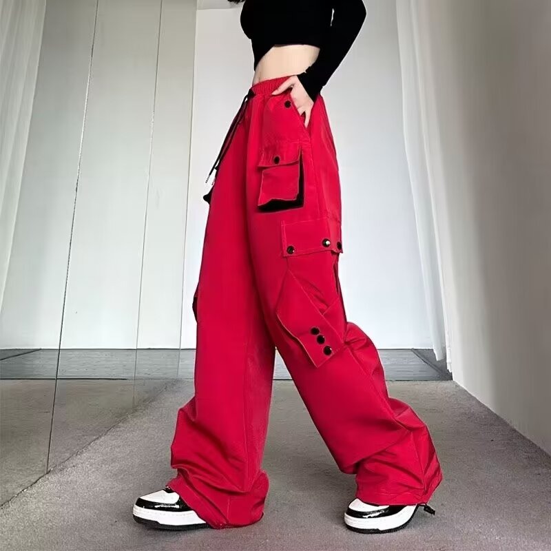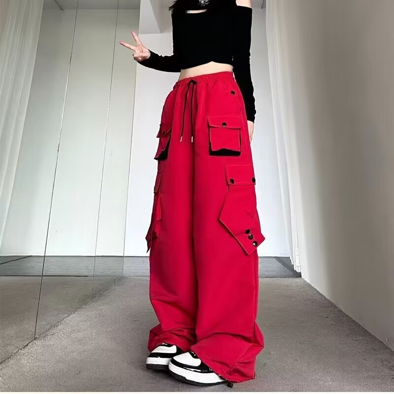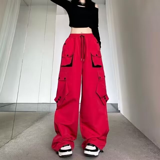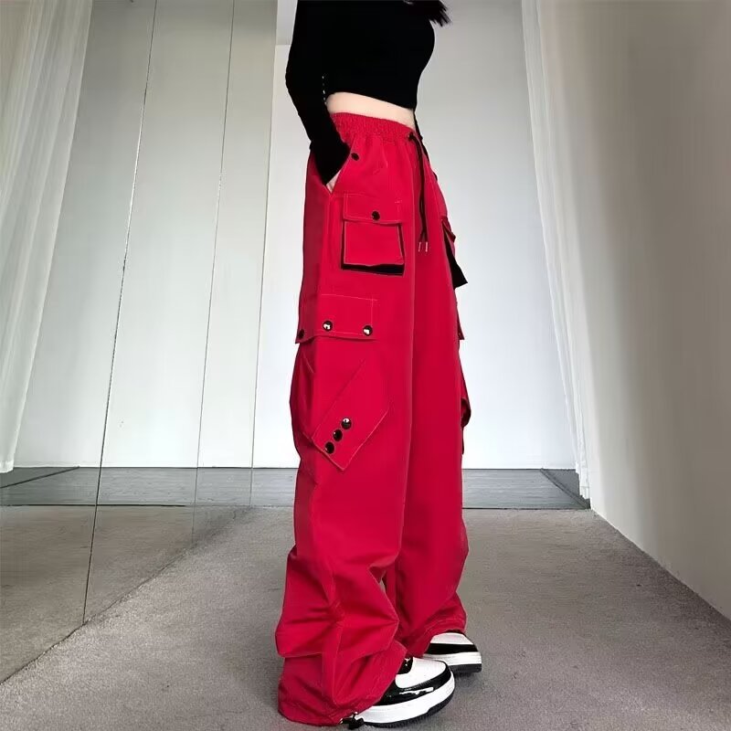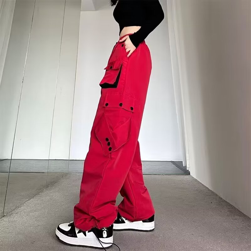 Celana panjang kasual gaya jalanan Amerika celana panjang lurus wanita warna kontras longgar musim gugur celana panjang kaki lebar ikat pergelangan kaki lurus bersaku