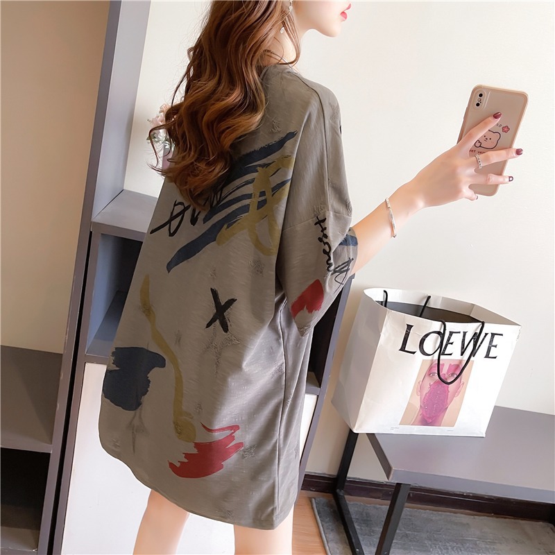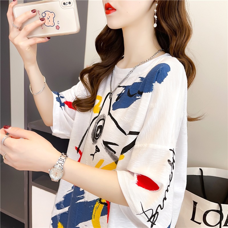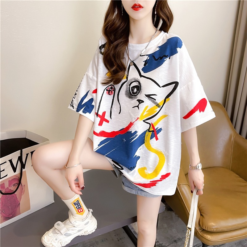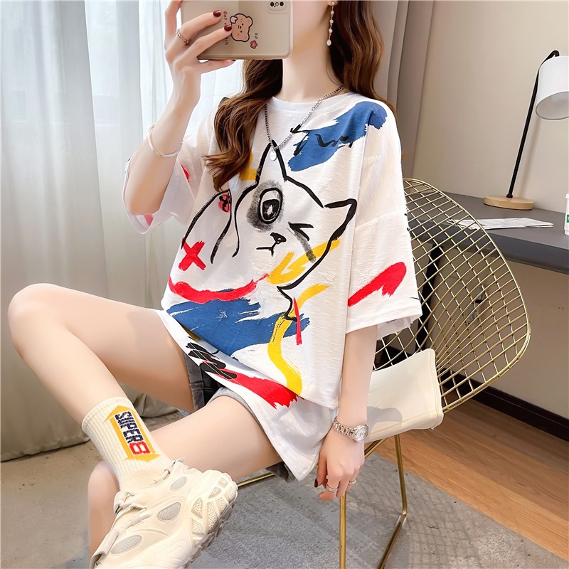 Kaus lengan pendek grafiti wanita, atasan mahasiswa kartun gaya Korea longgar ukuran besar musim panas untuk perempuan