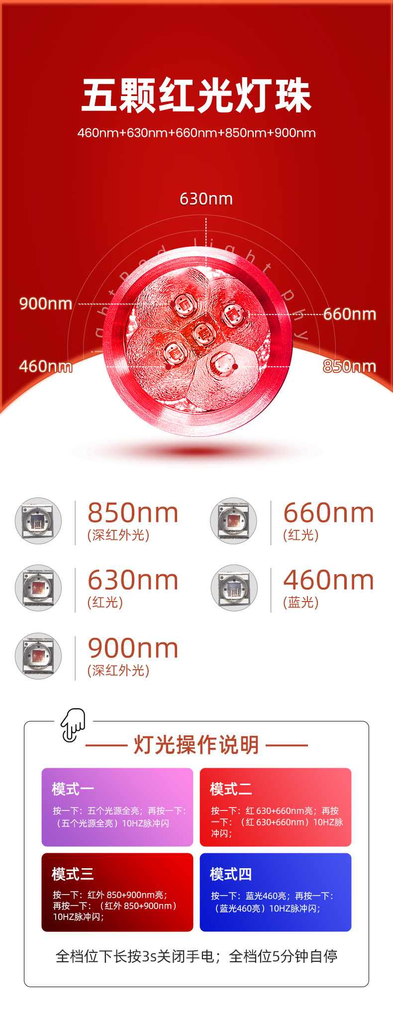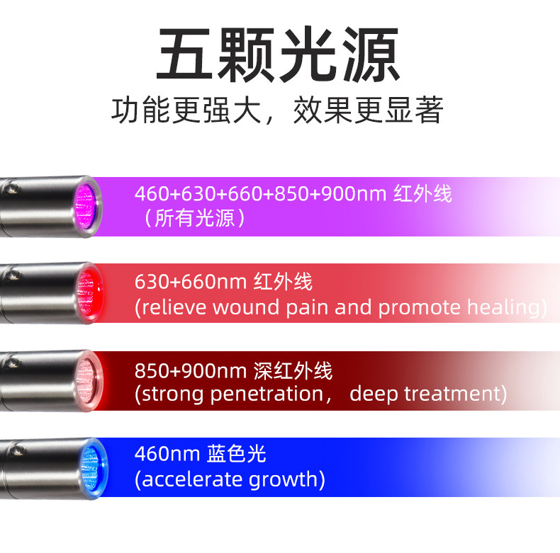 光源:红光630nm+660nm+红外850nm+900nm+蓝光460nm