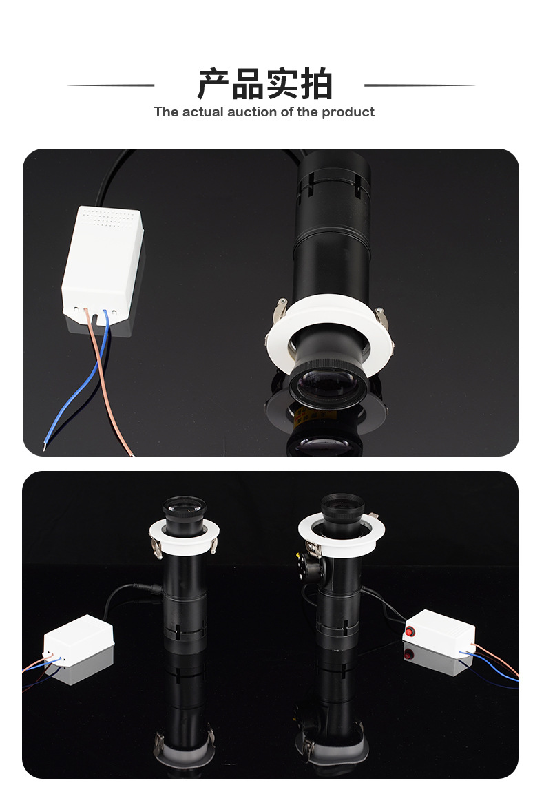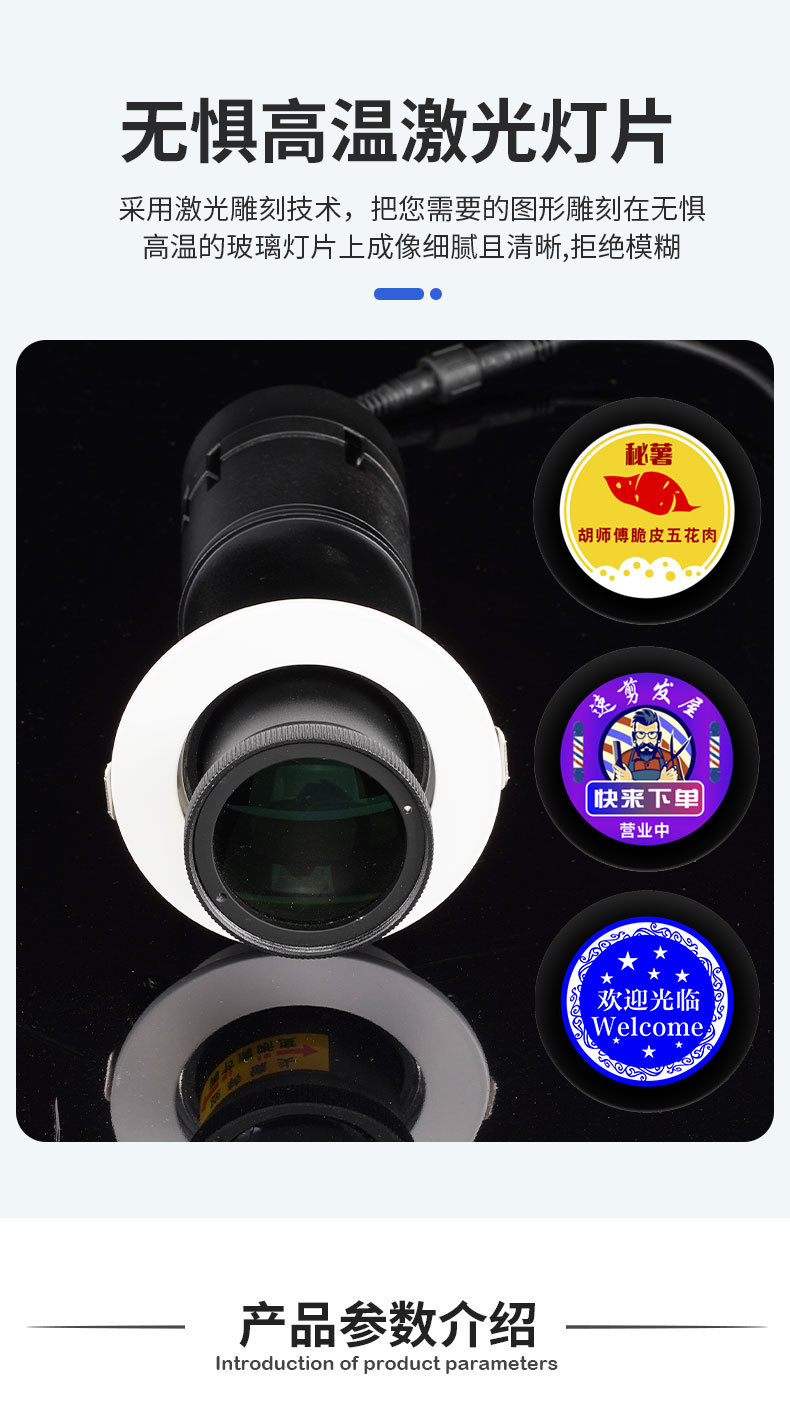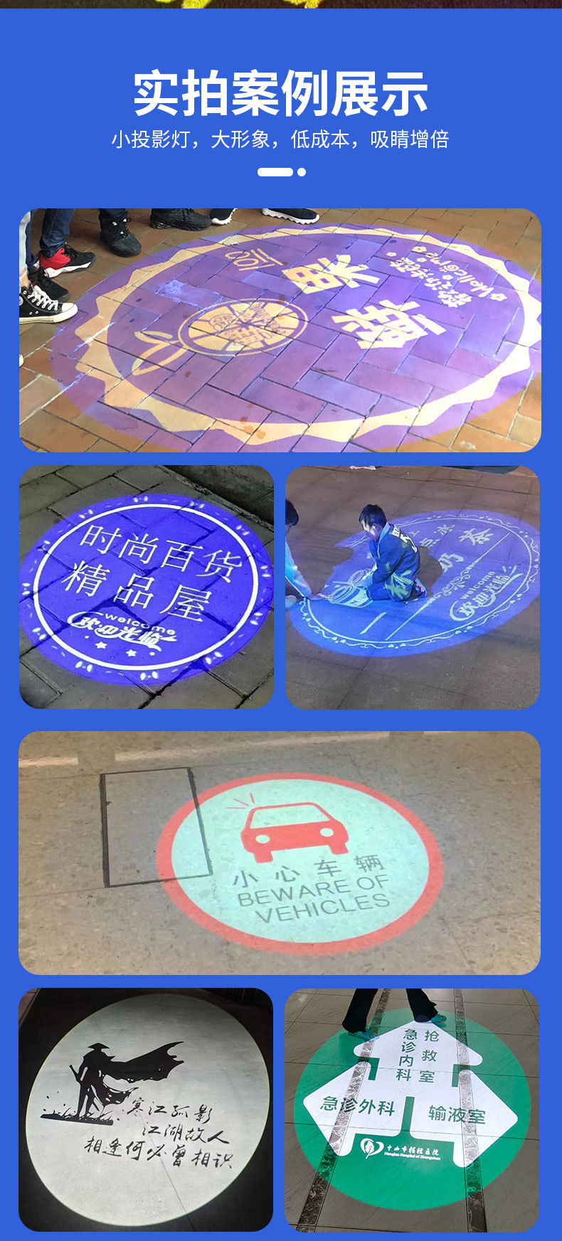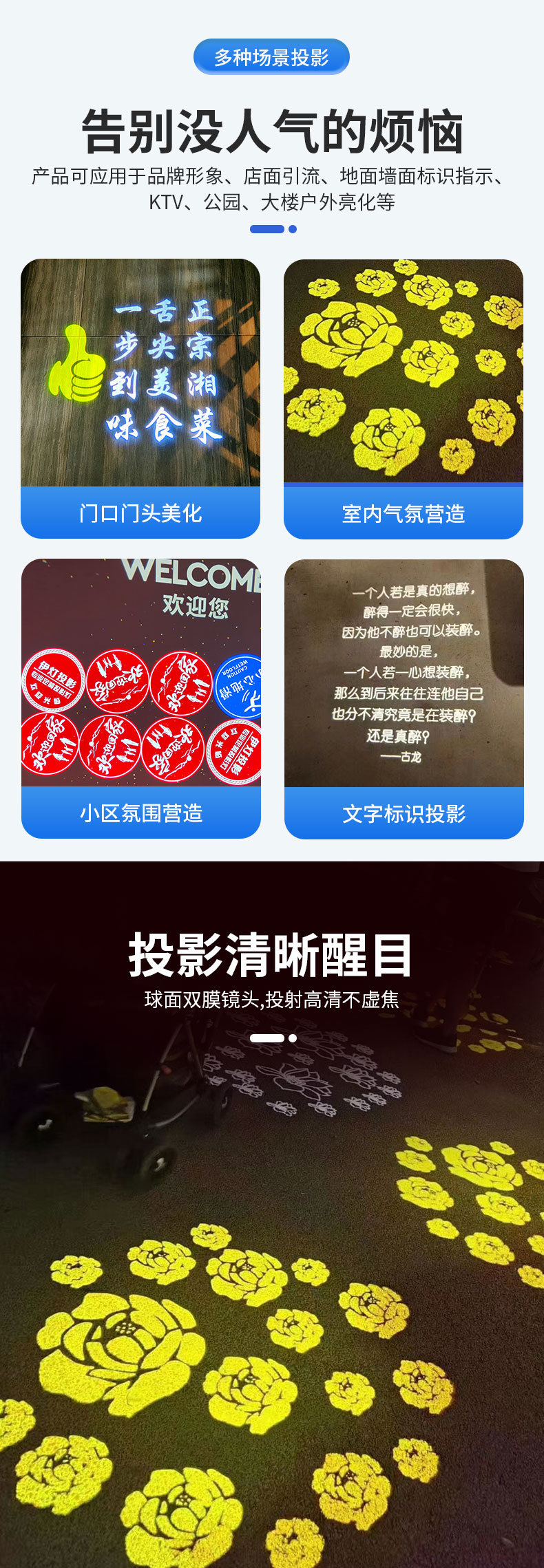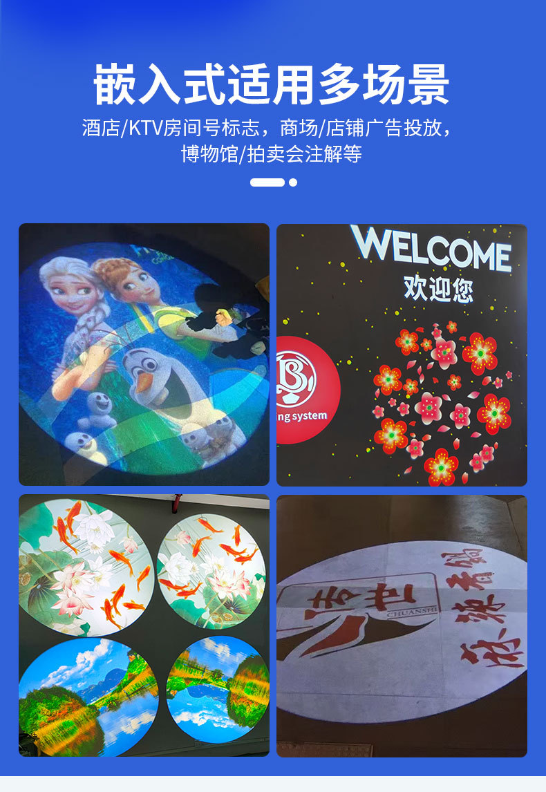 Lampu proyeksi langit-langit tersembunyi untuk iklan, lampu proyeksi logo berputar di foyer pintu masuk, lampu proyeksi teks di koridor.