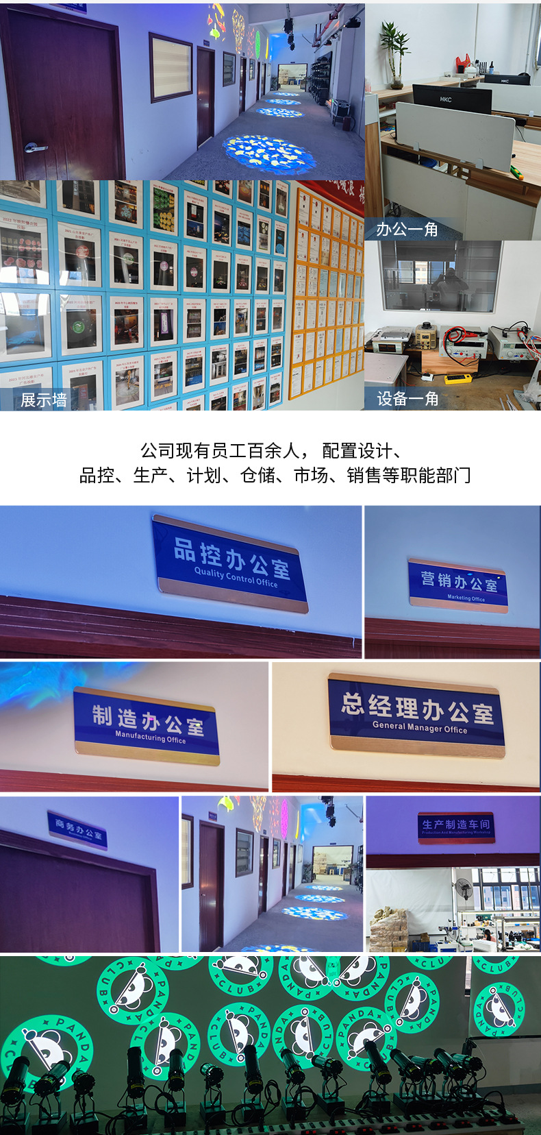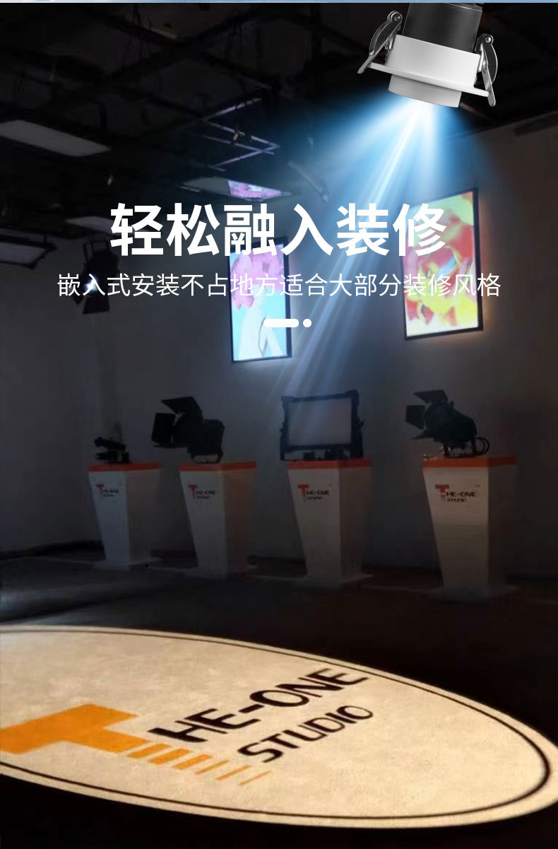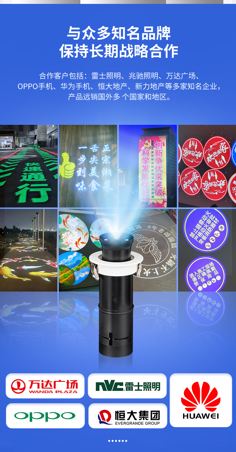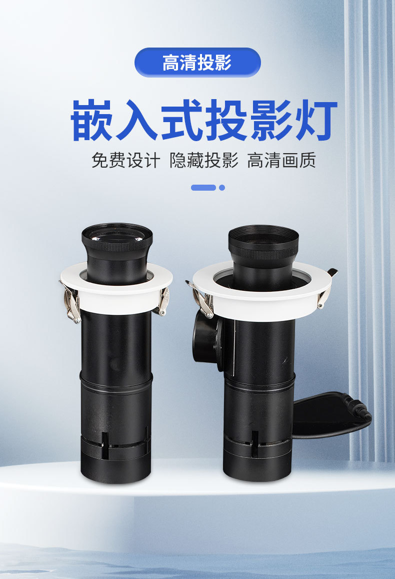 Lampu proyeksi langit-langit tersembunyi untuk iklan, lampu proyeksi logo berputar di foyer pintu masuk, lampu proyeksi teks di koridor.