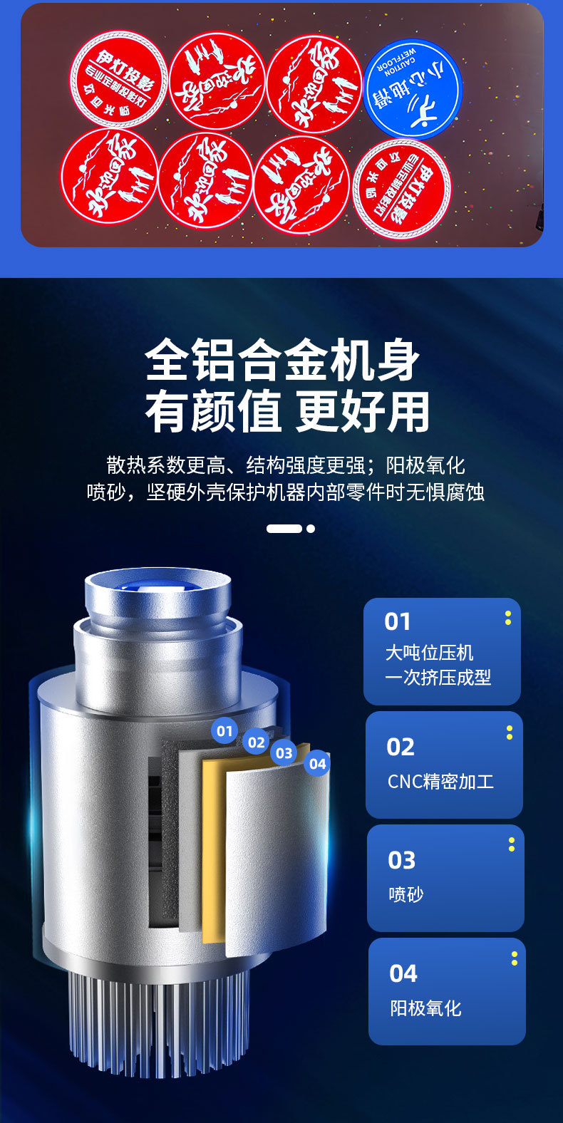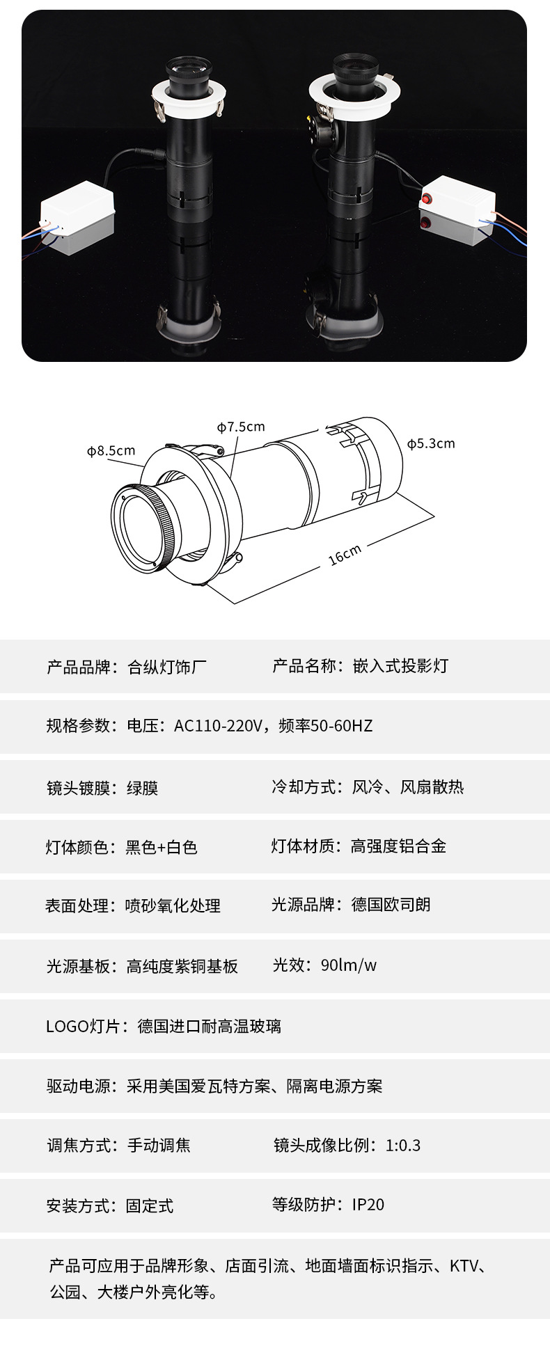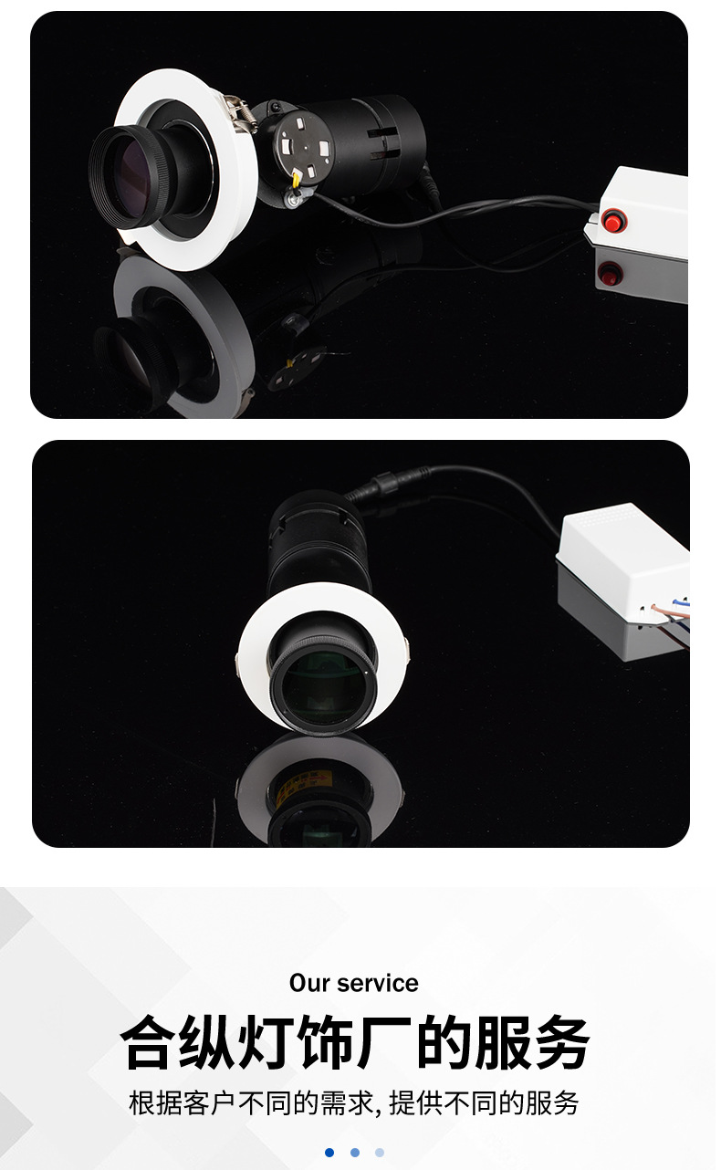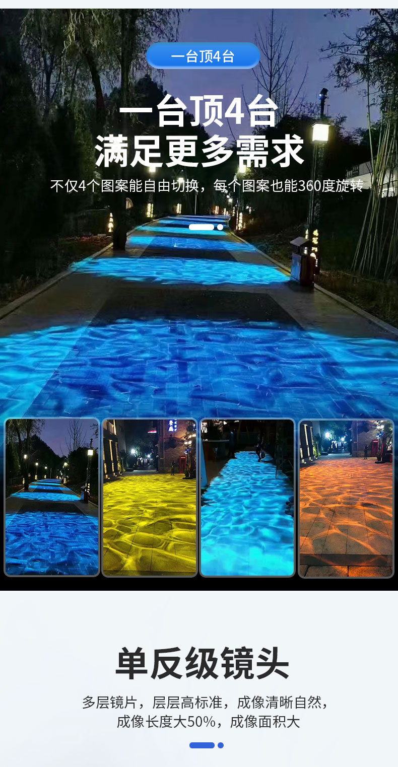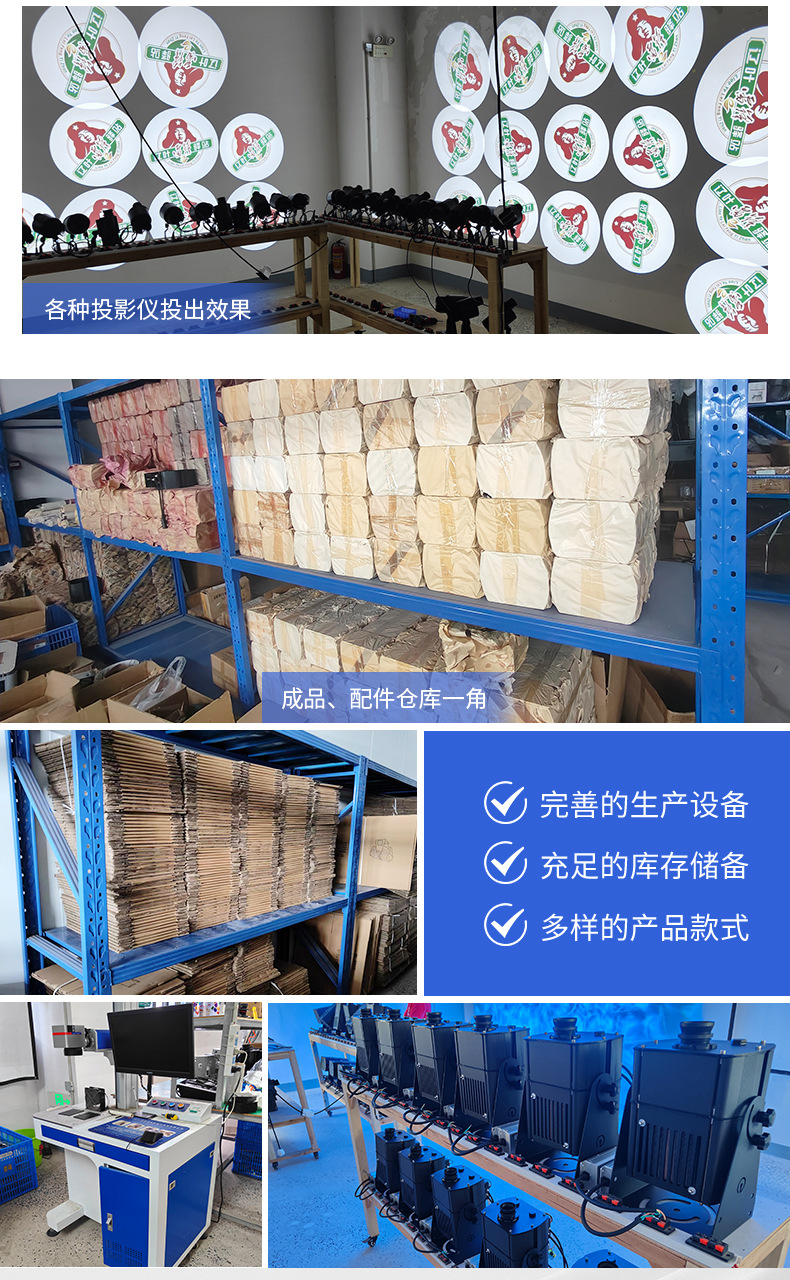 Lampu proyeksi langit-langit tersembunyi untuk iklan, lampu proyeksi logo berputar di foyer pintu masuk, lampu proyeksi teks di koridor.