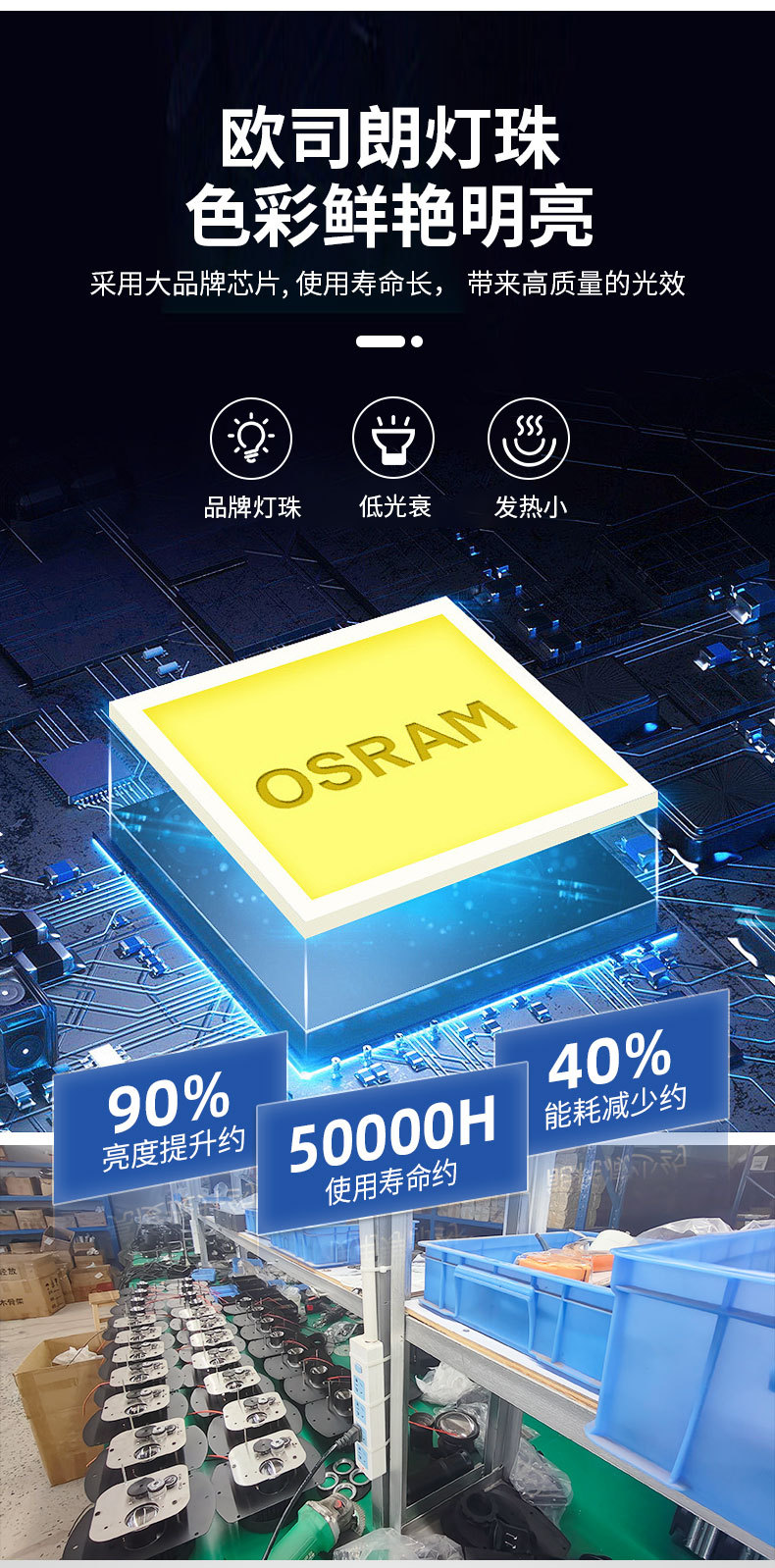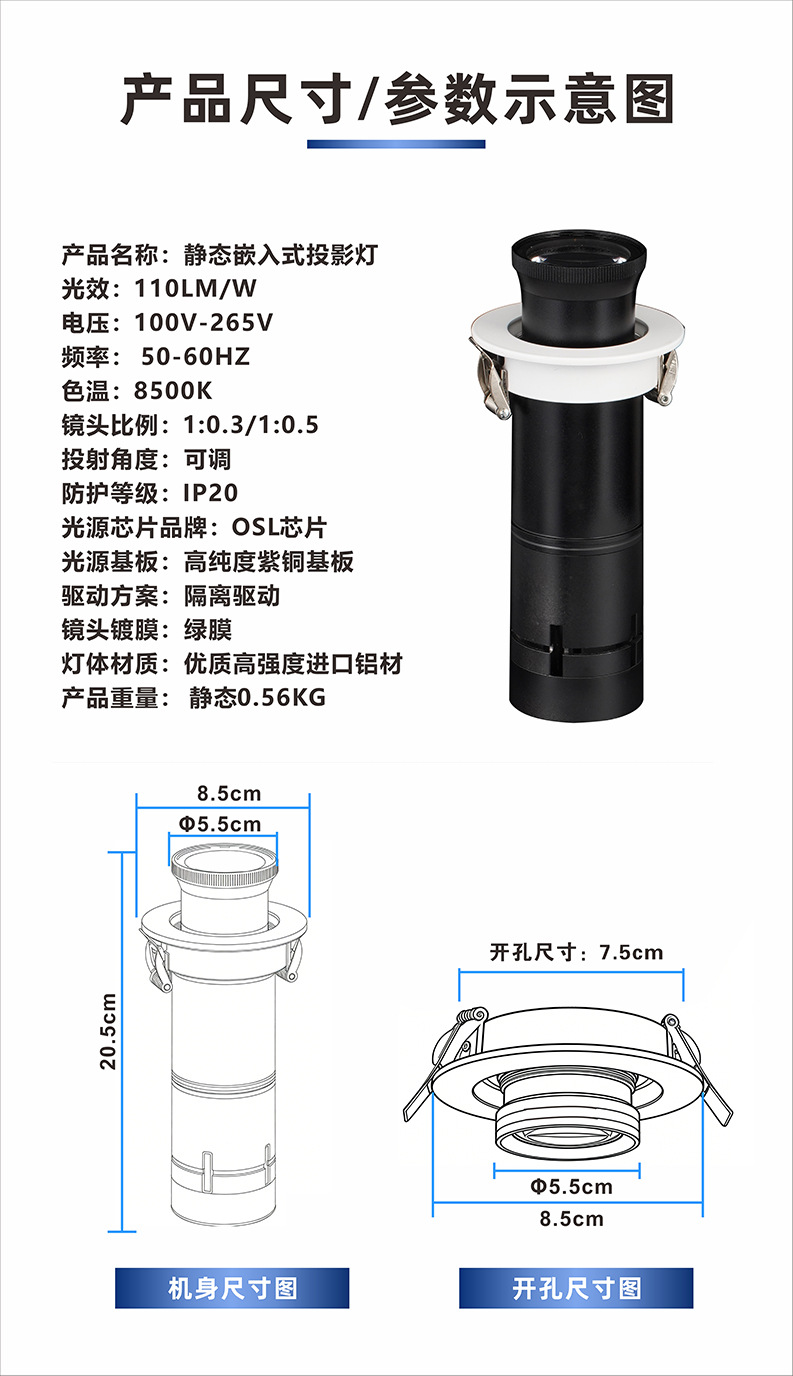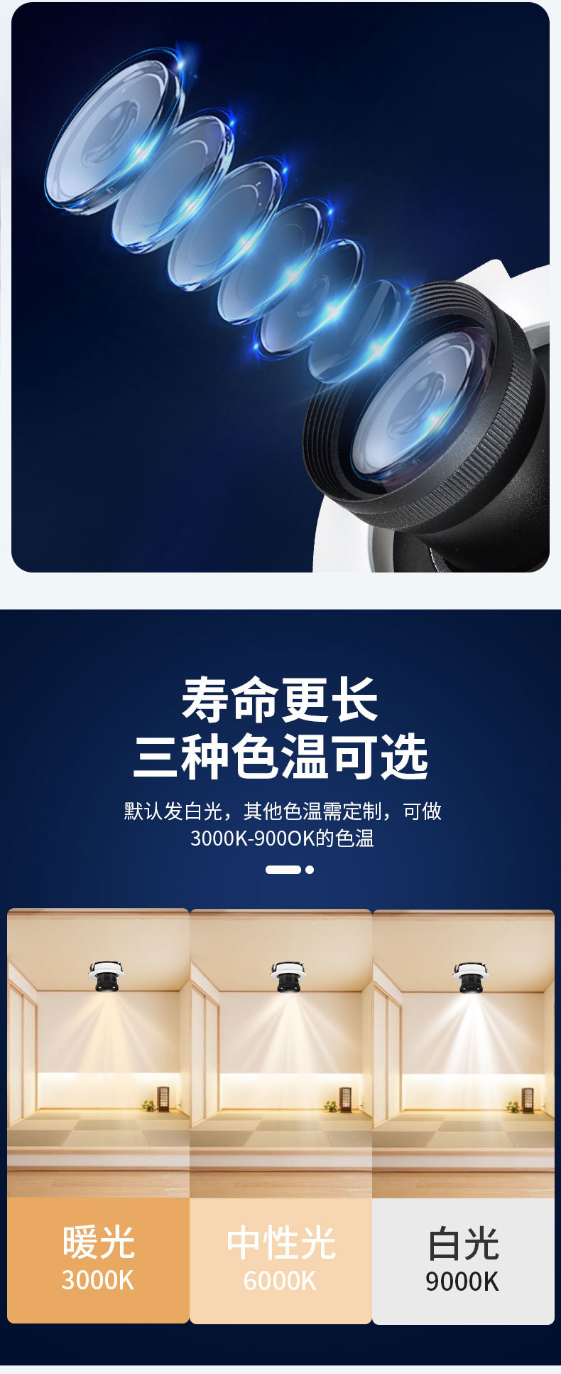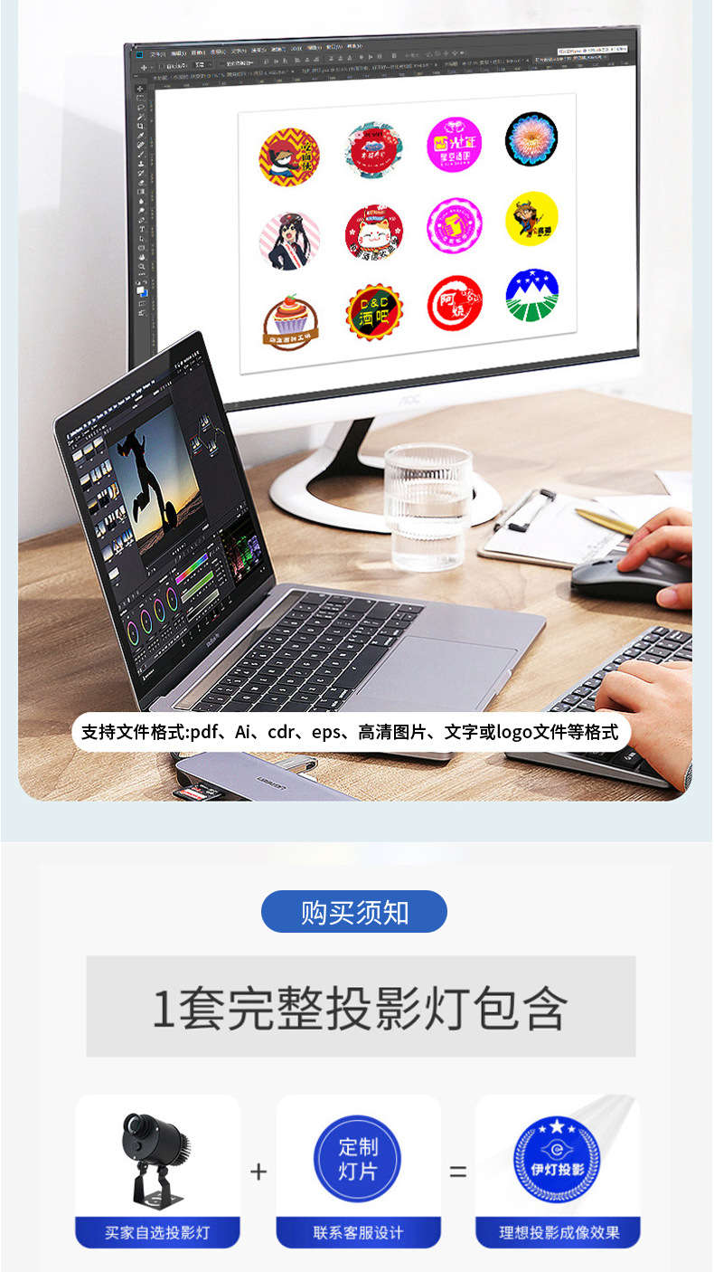Lampu proyeksi langit-langit tersembunyi untuk iklan, lampu proyeksi logo berputar di foyer pintu masuk, lampu proyeksi teks di koridor.