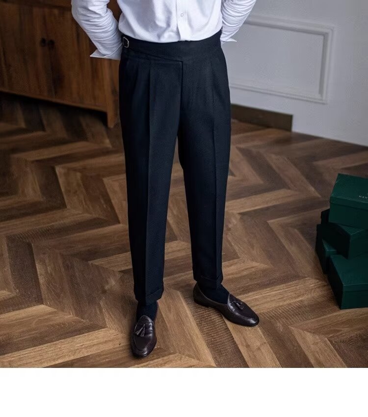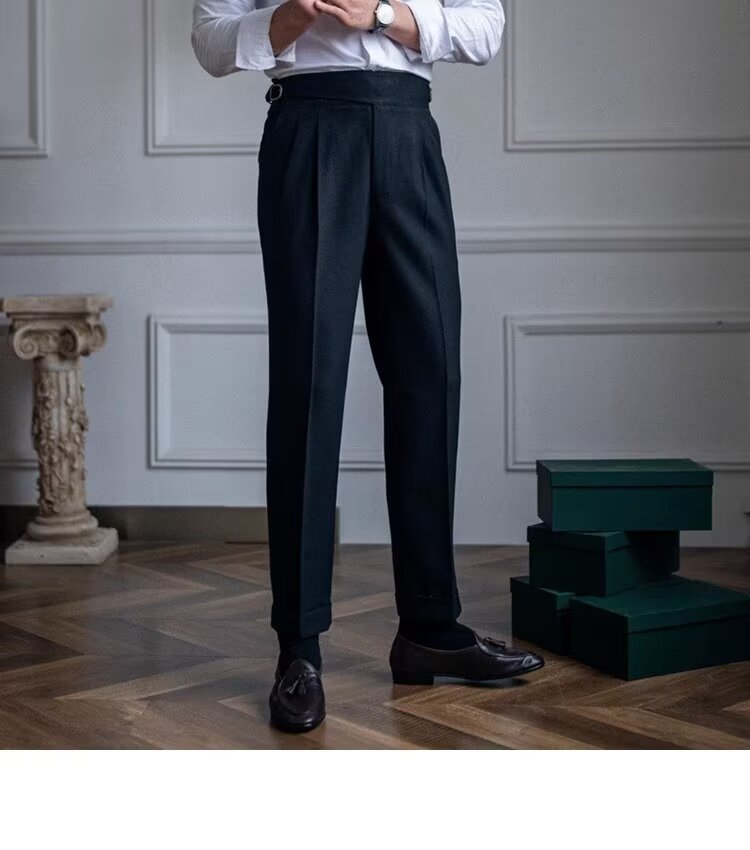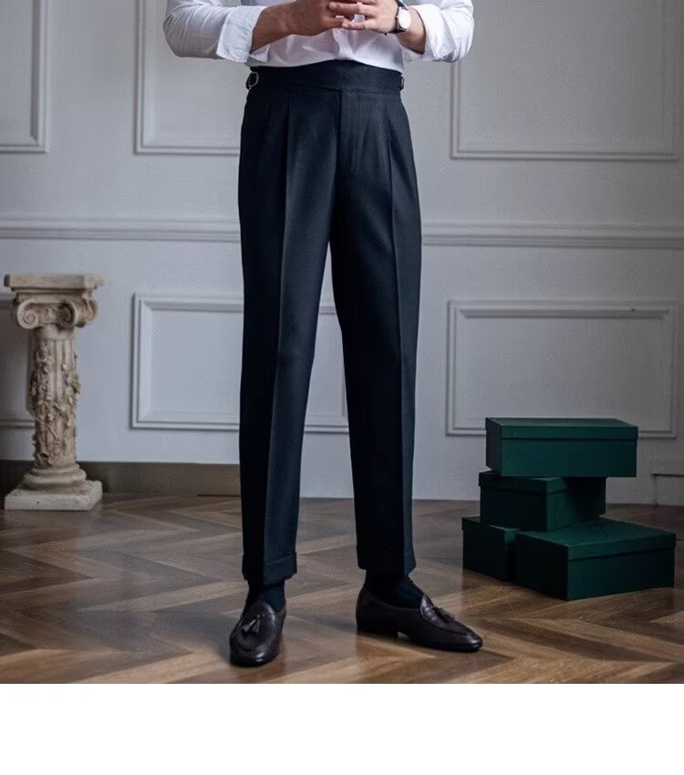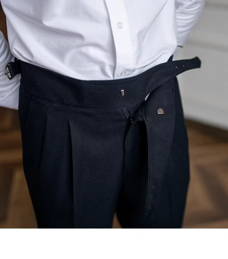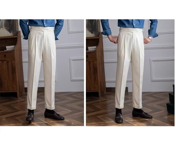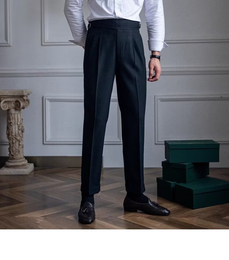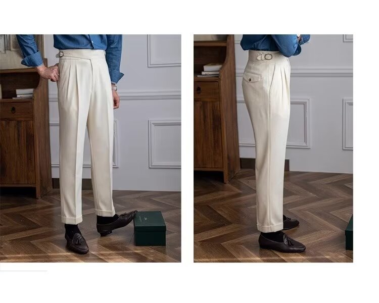 Celana setelan pinggang tinggi pria, setelan jas lurus pinggang tinggi, celana gantung Naples, celana gesper, celana bisnis, retro Paris, musim gugur