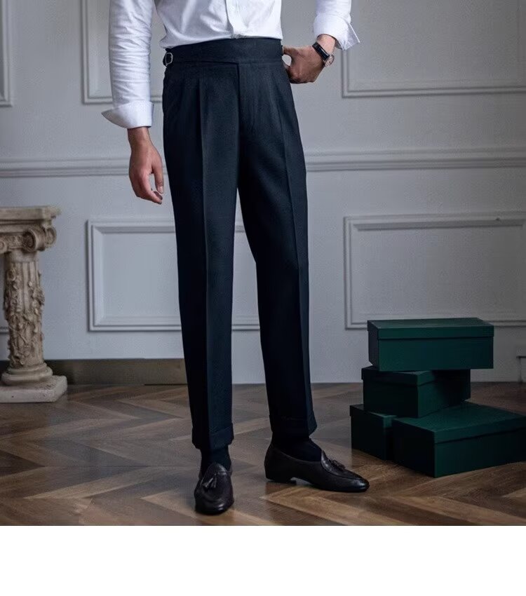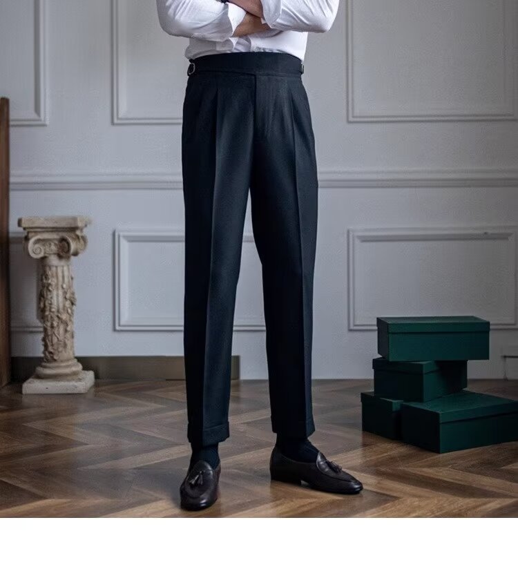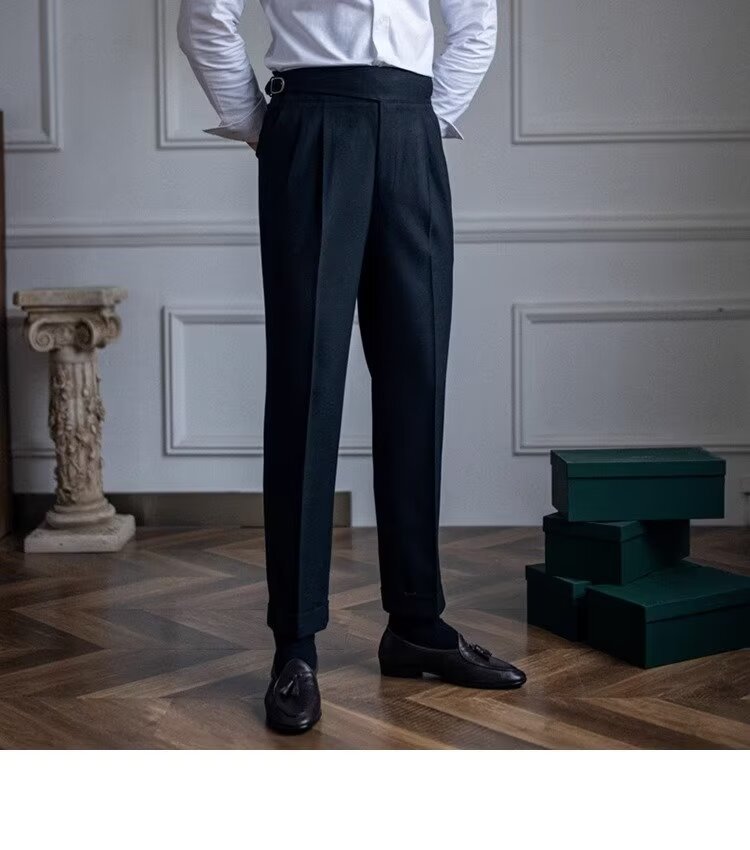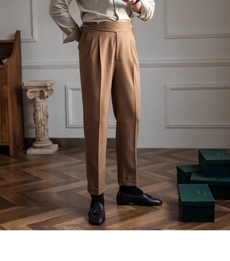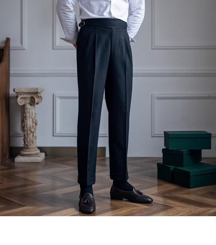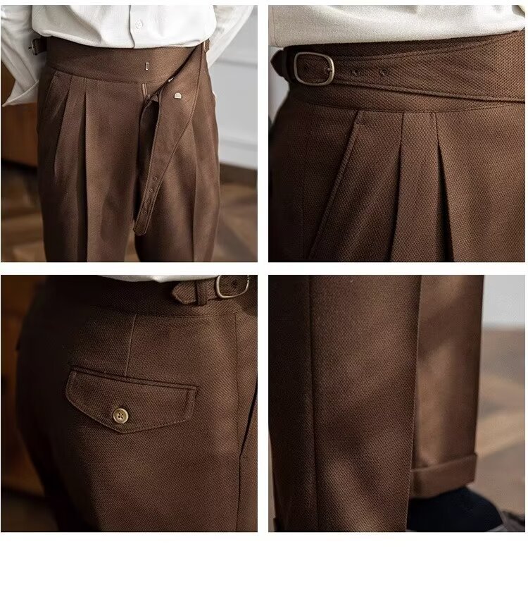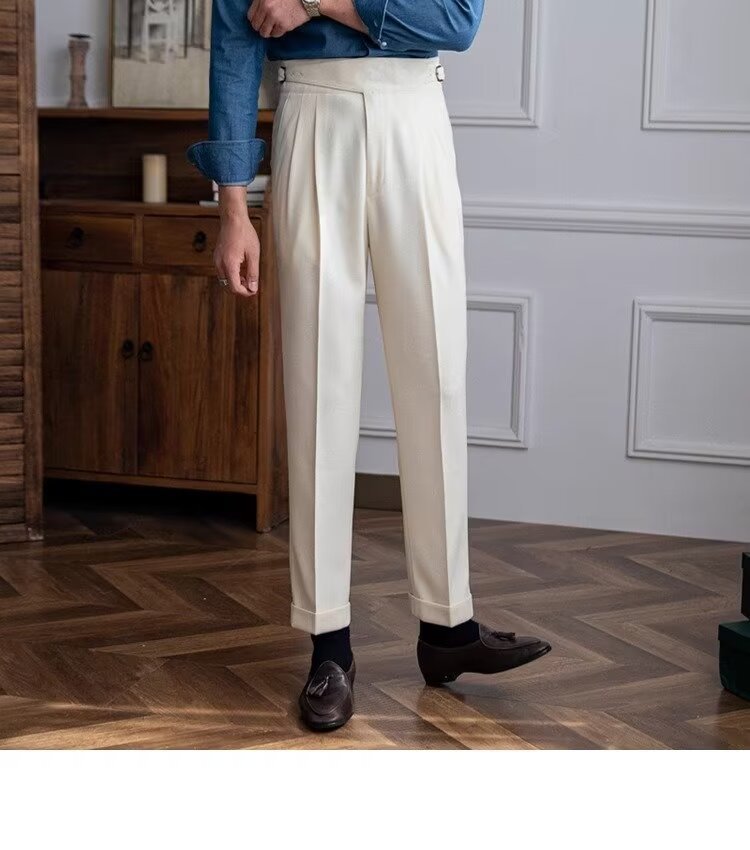 Celana setelan pinggang tinggi pria, setelan jas lurus pinggang tinggi, celana gantung Naples, celana gesper, celana bisnis, retro Paris, musim gugur