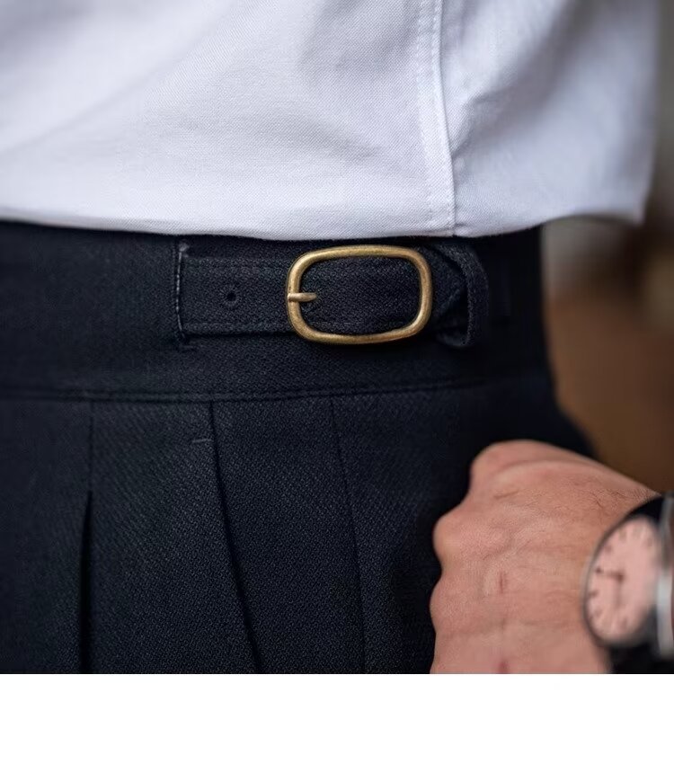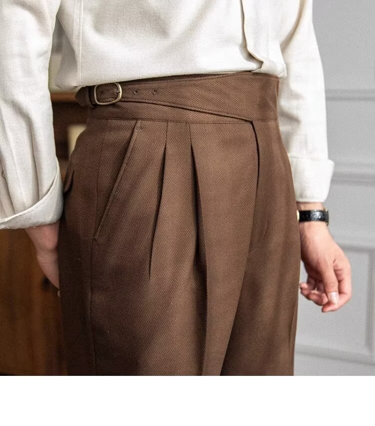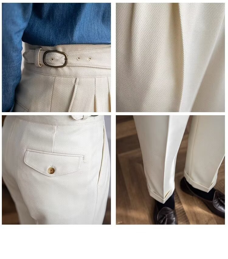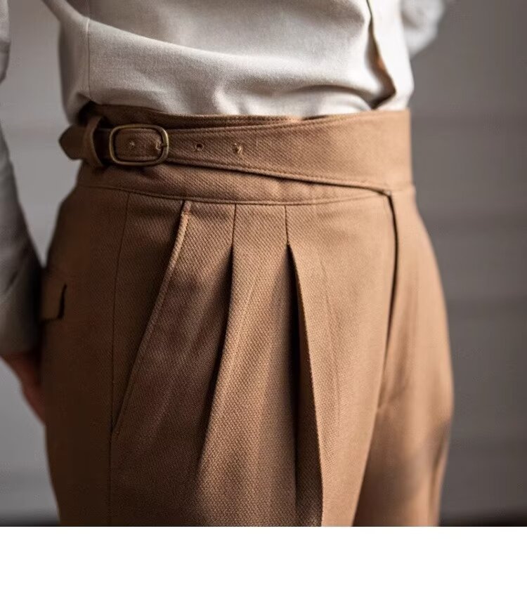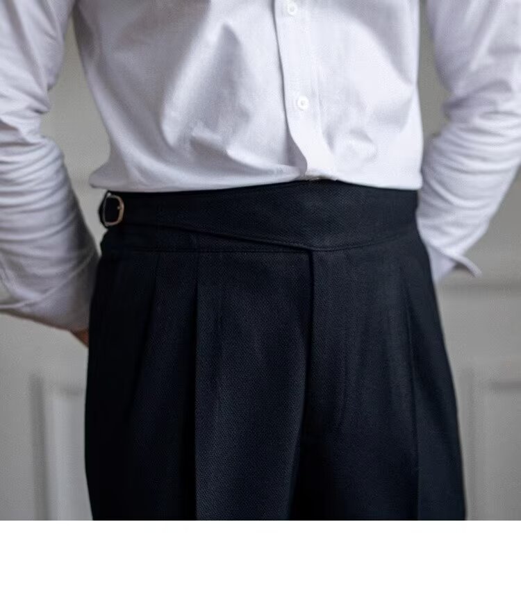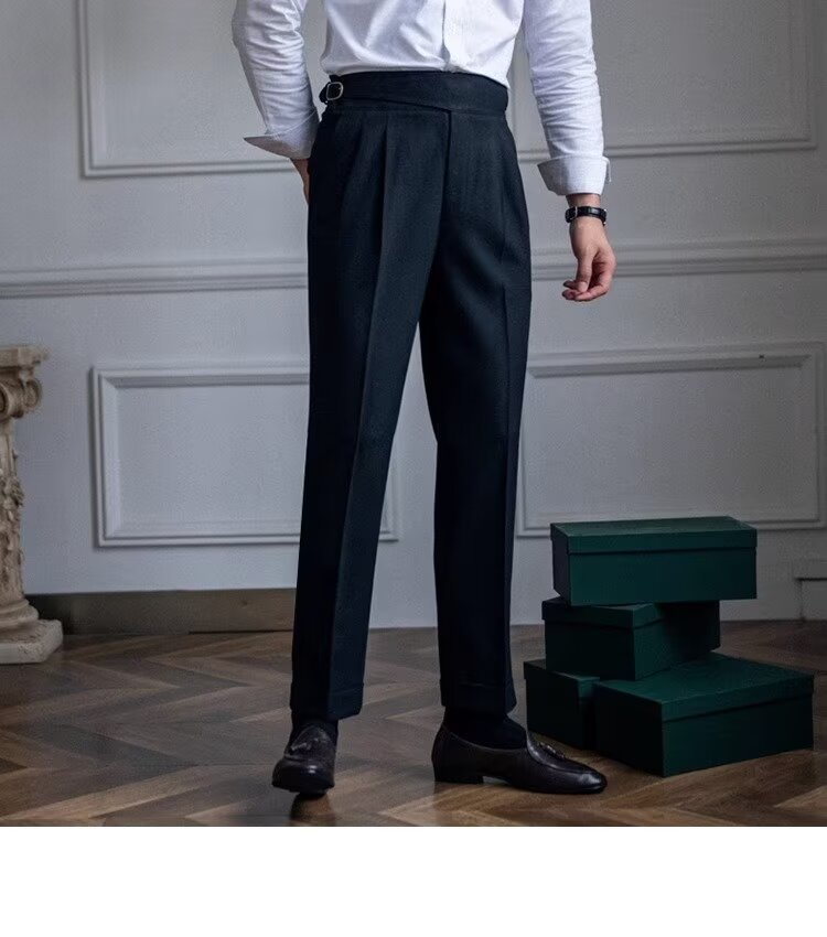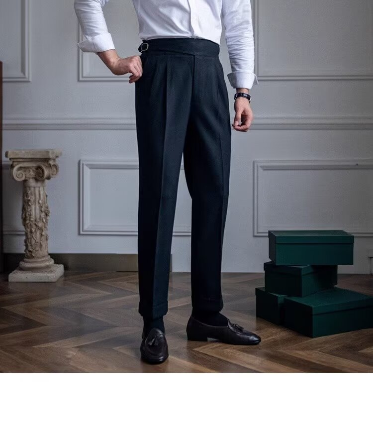 Celana setelan pinggang tinggi pria, setelan jas lurus pinggang tinggi, celana gantung Naples, celana gesper, celana bisnis, retro Paris, musim gugur