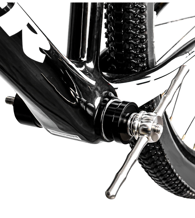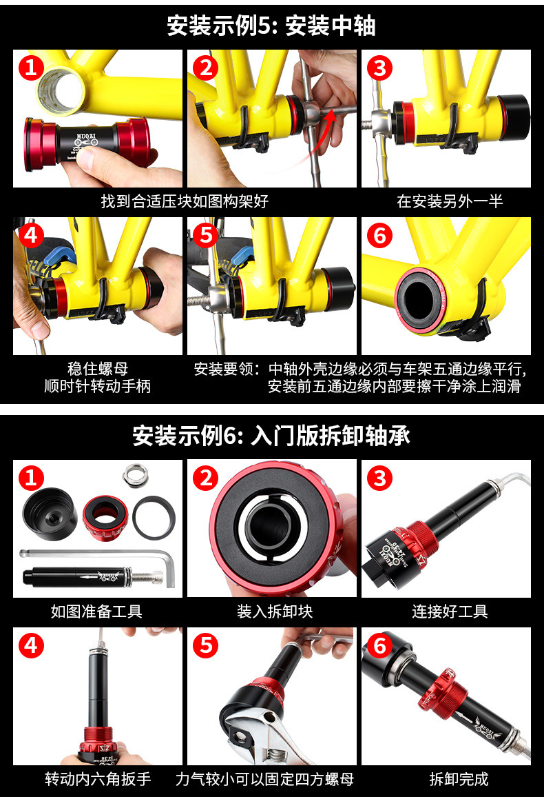 部分铝套压入式的中轴,拆卸的时候可能存在只能拆卸中轴轴承的问题,因为工具的作用力是在轴承上,所以铝套中轴可能会导致轴承先出来,而铝套还咬死在车架上,另外中轴外侧边缘和车架五通边缘平行的,因为工具无法固定在五通处,所以也无法使用静压工具
