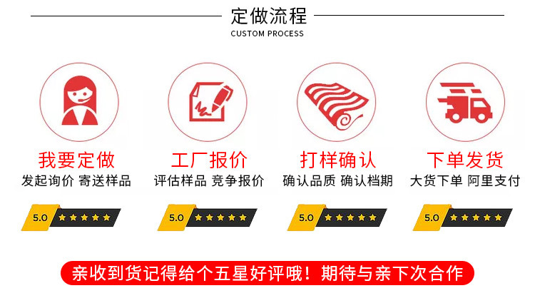 1.客户定做样品,材料尺寸确认后,客户支付打样费用我司安排打样并寄出样品(样品费可在下单后返还)。如需开模定做,客户需支付模具费用,模具费用可在大货订单中抵扣 返还。