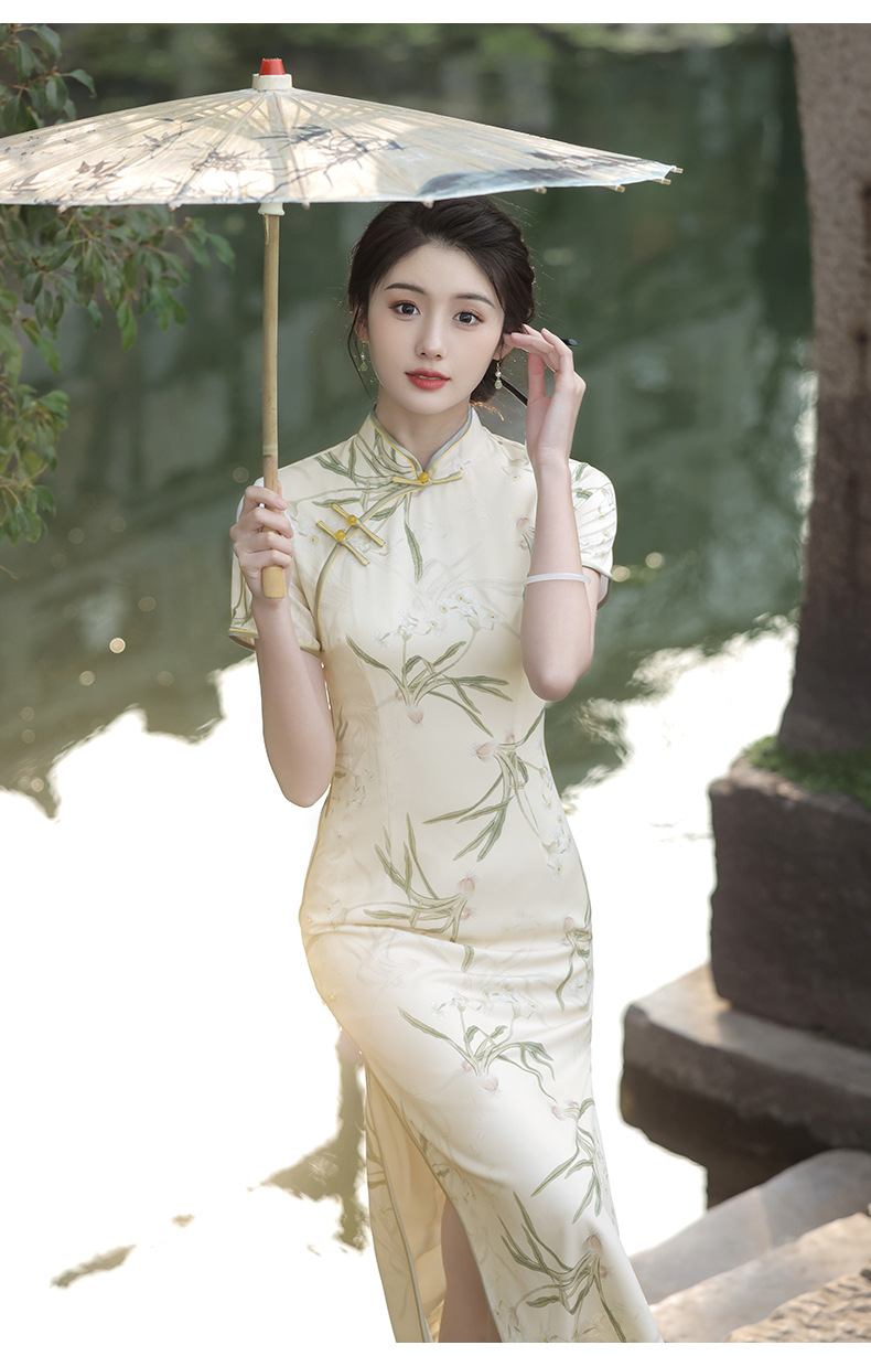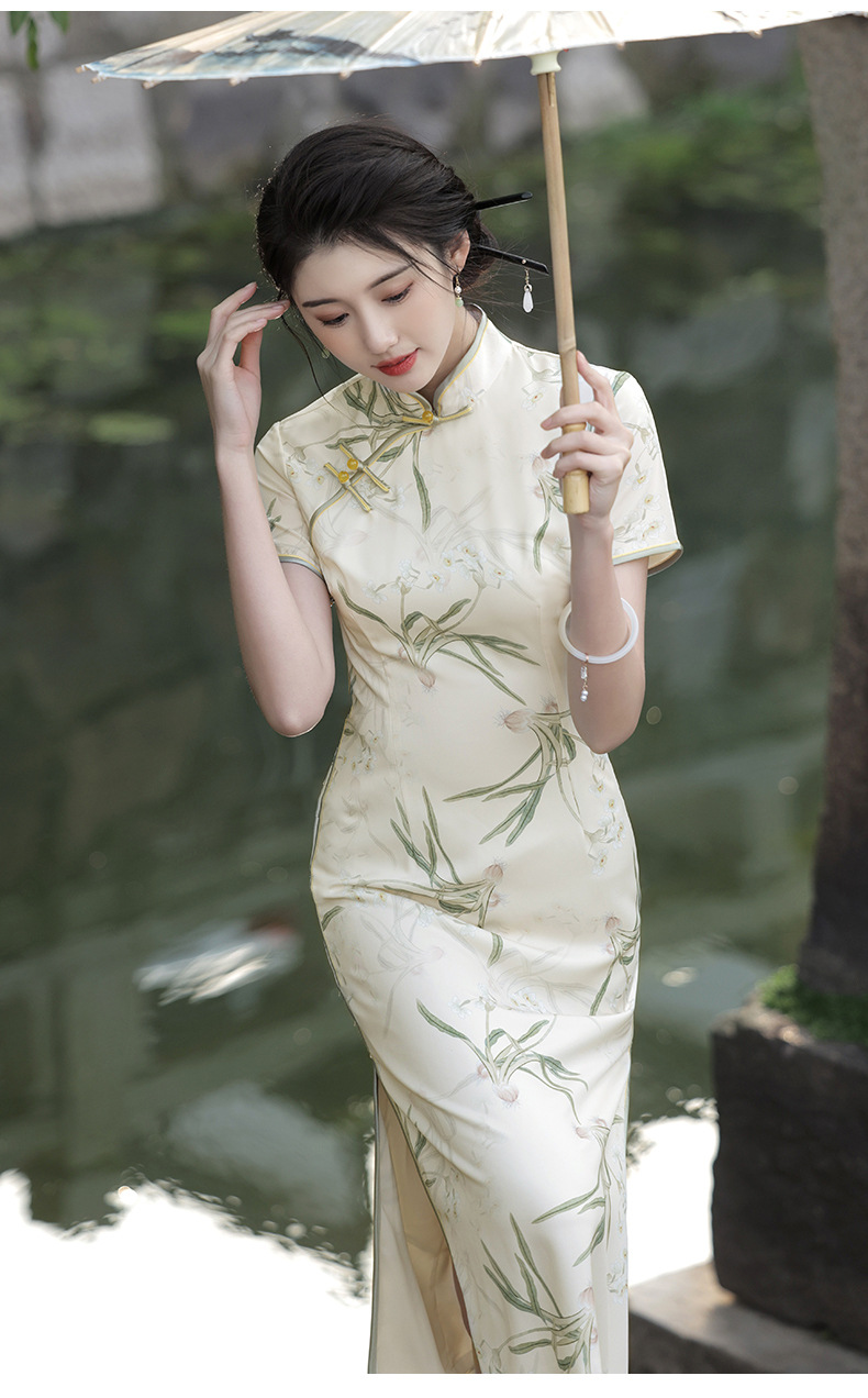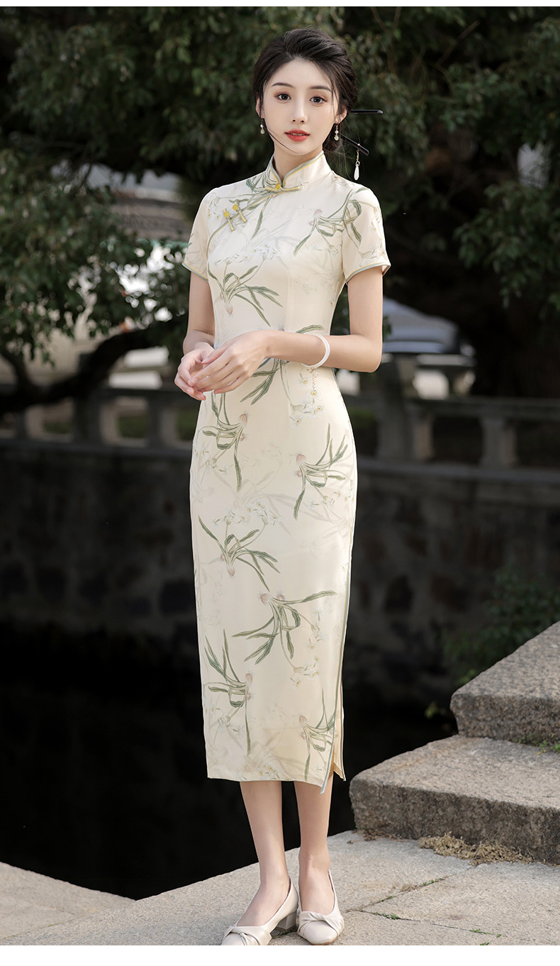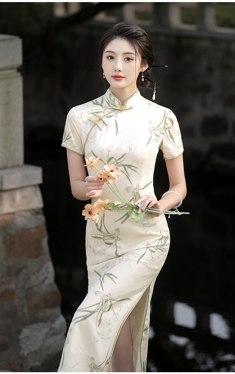 Dress panjang setengah lengan pendek, gaun cheongsam baru Cina elegan ramping bercetak ditingkatkan Musim Panas 2024