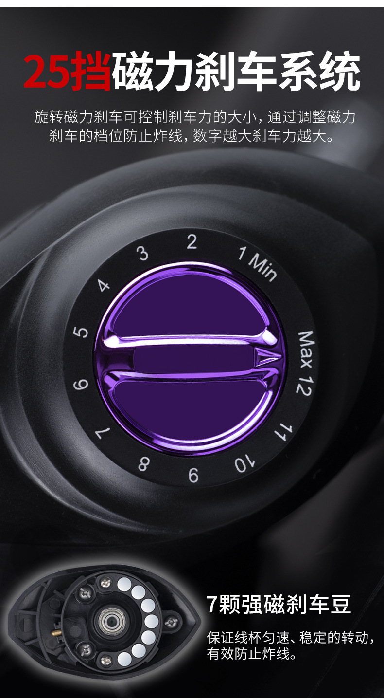 产品特点:25档磁力刹车系统,通过调整磁力刹车的档位防止炸线,数字越大刹车力越大。广角出线口,出现顺畅不伤线。