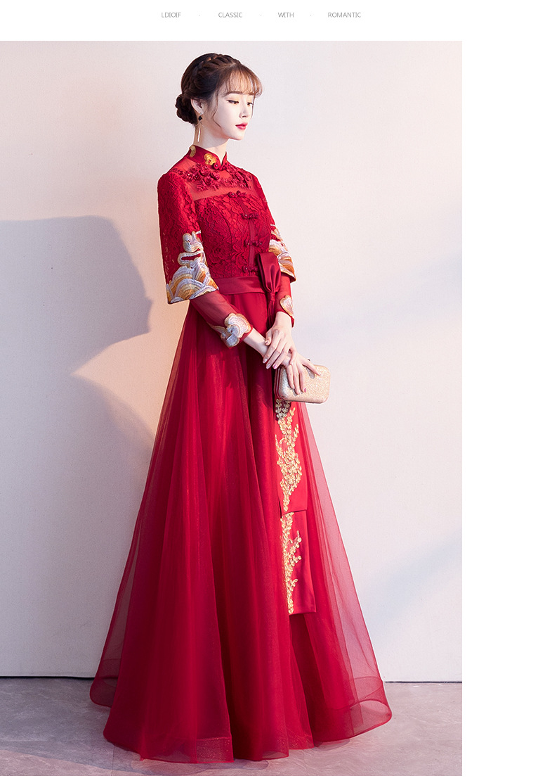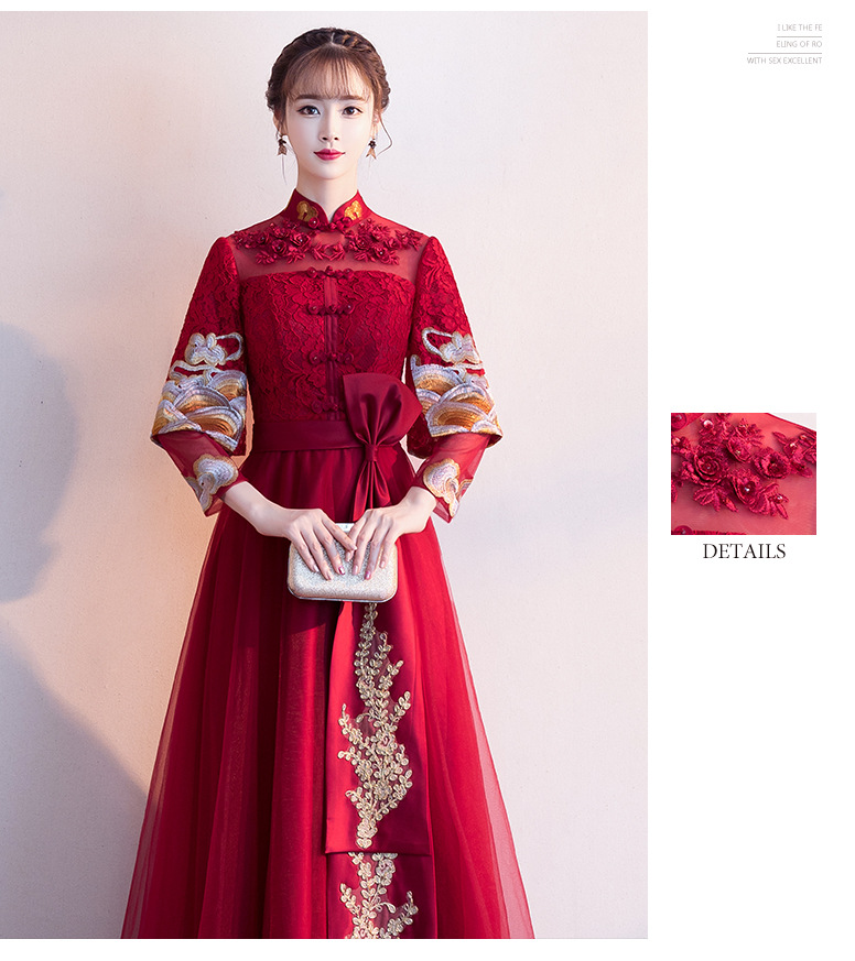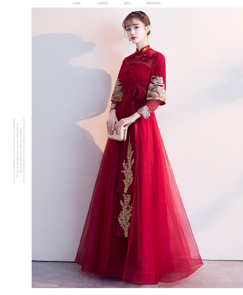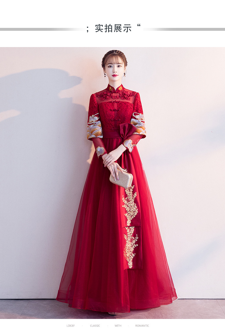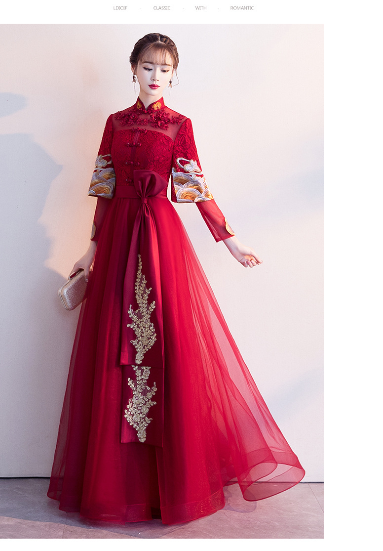 Pakaian Bersulang Pengantin Panjang 2025 Pernikahan Burgundy Gaun Perjamuan Cheongsam Gaya Cina Lengan Panjang Tiongkok Wanita Musim Panas