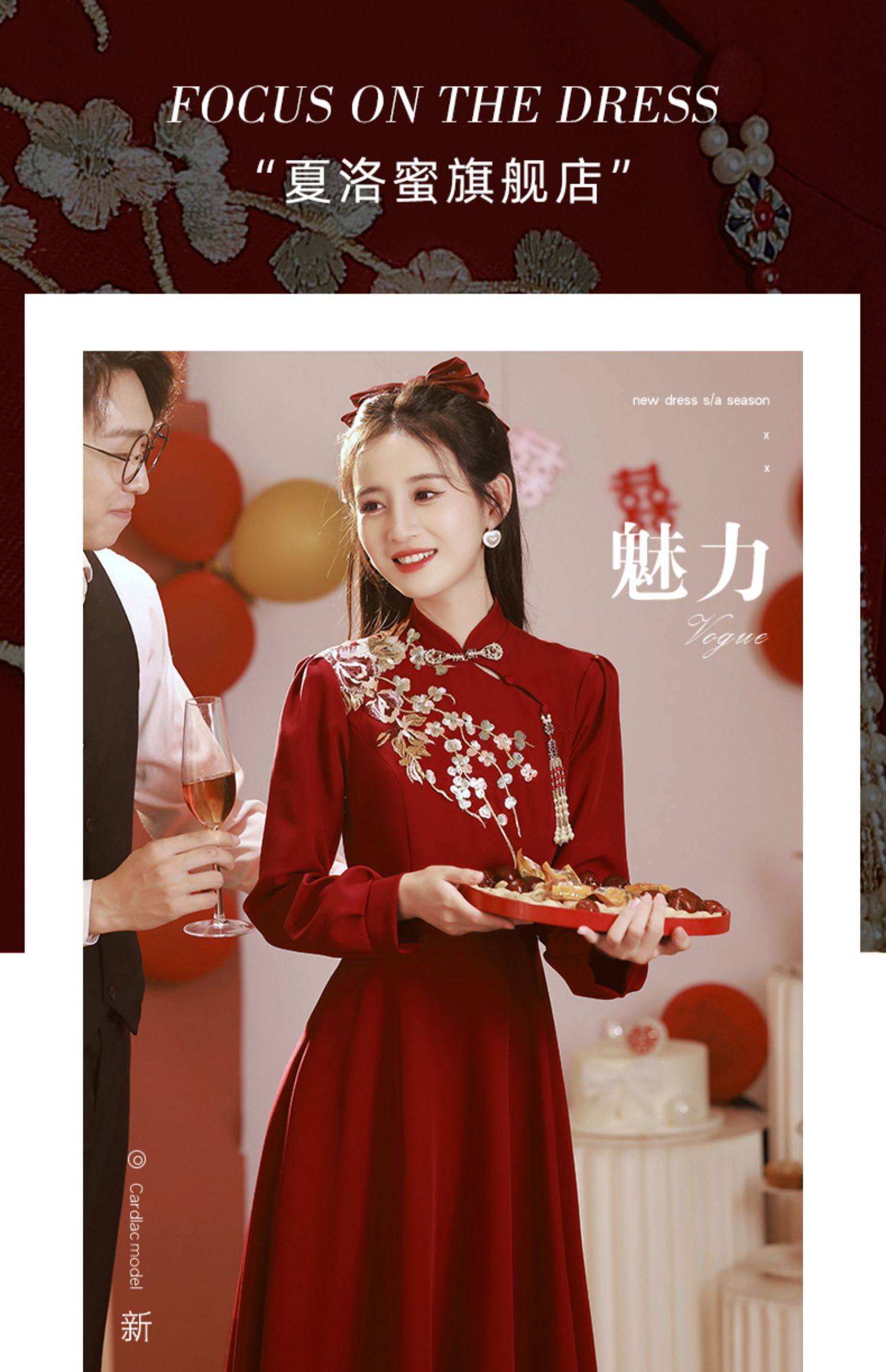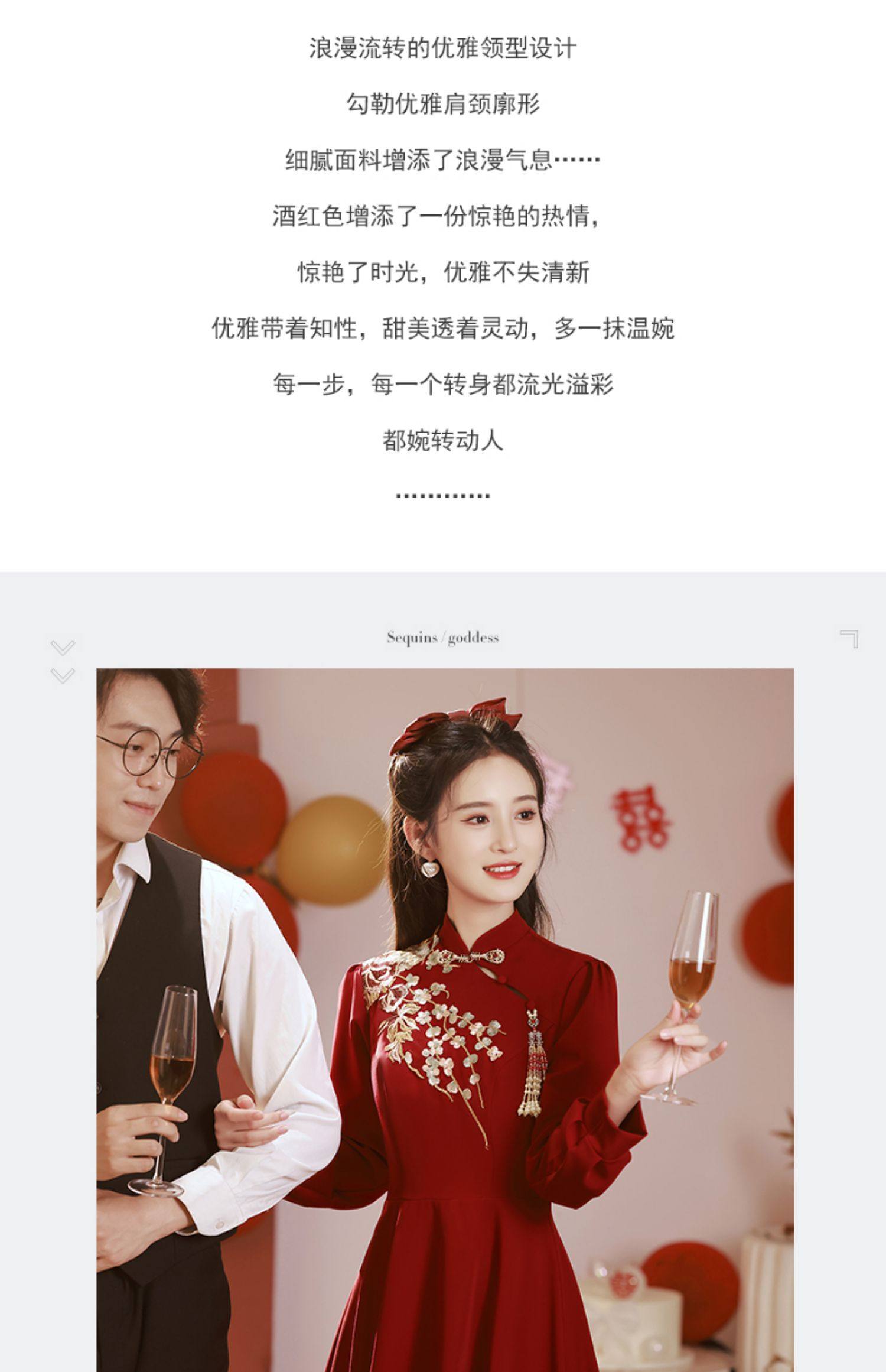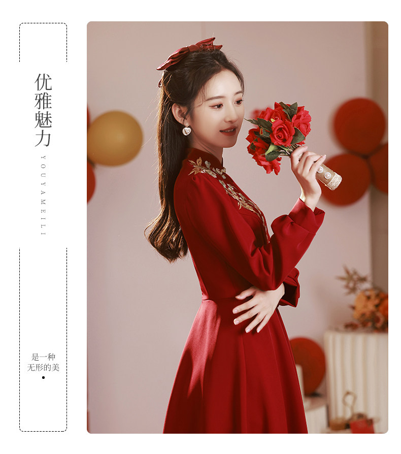 Gaun pengantin bersulang Cheongsam, gaun pertunangan musim dingin pengantin wanita lengan panjang merah baru musim gugur dan musim dingin 2023