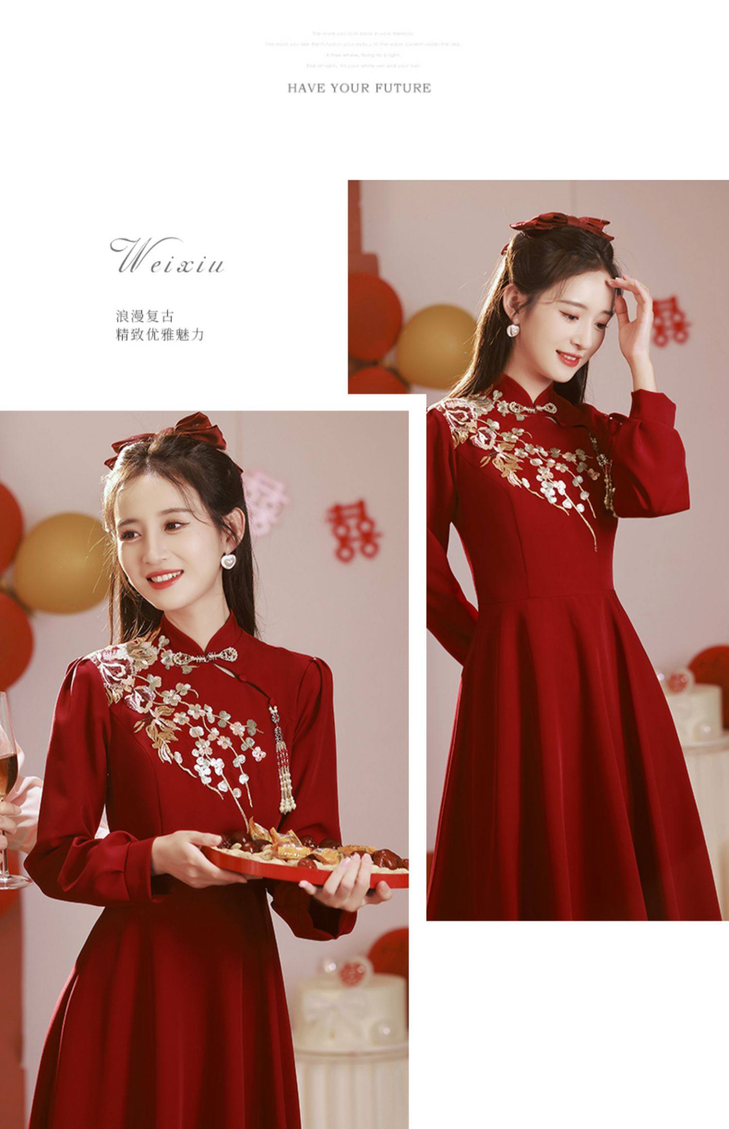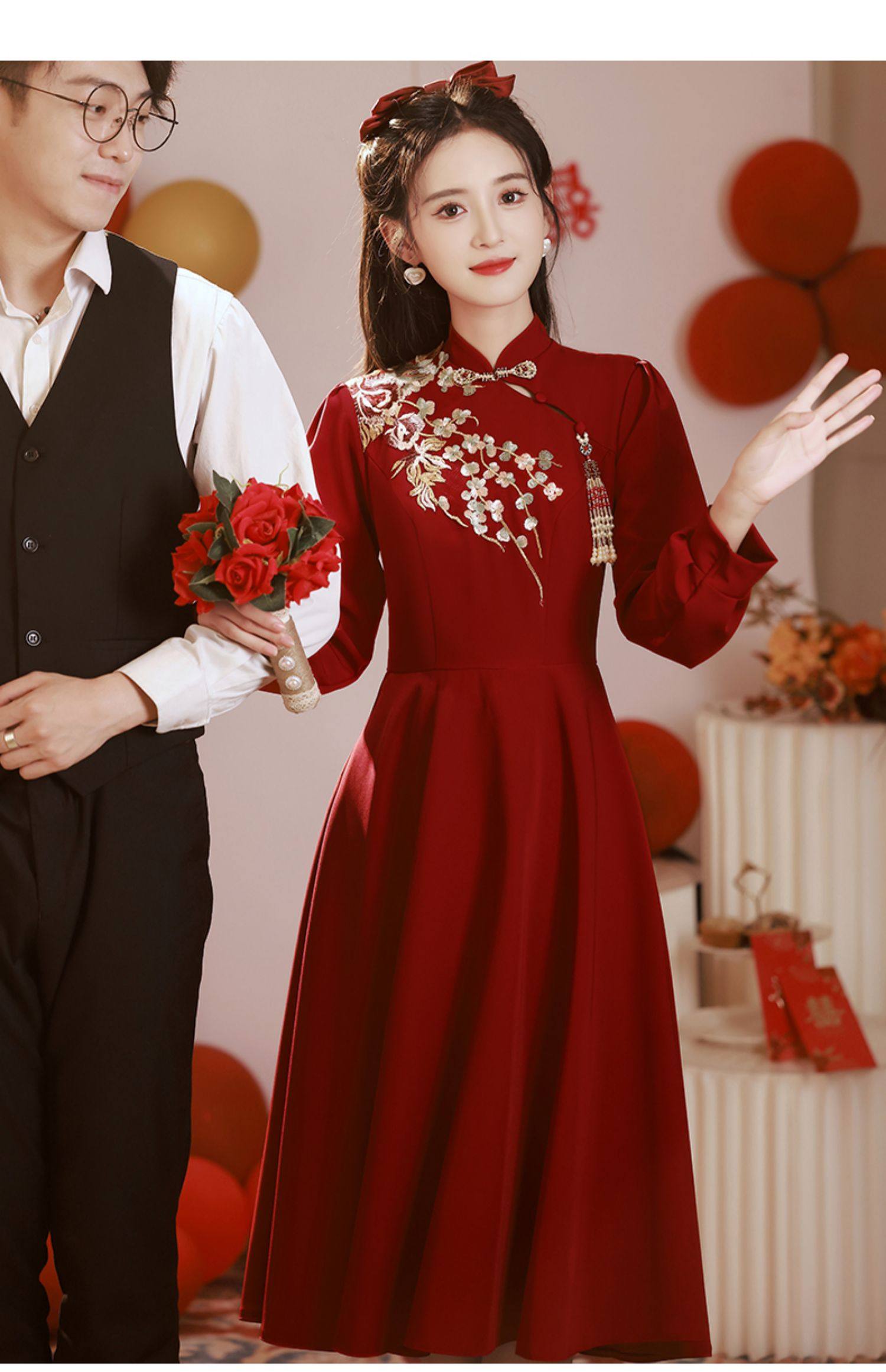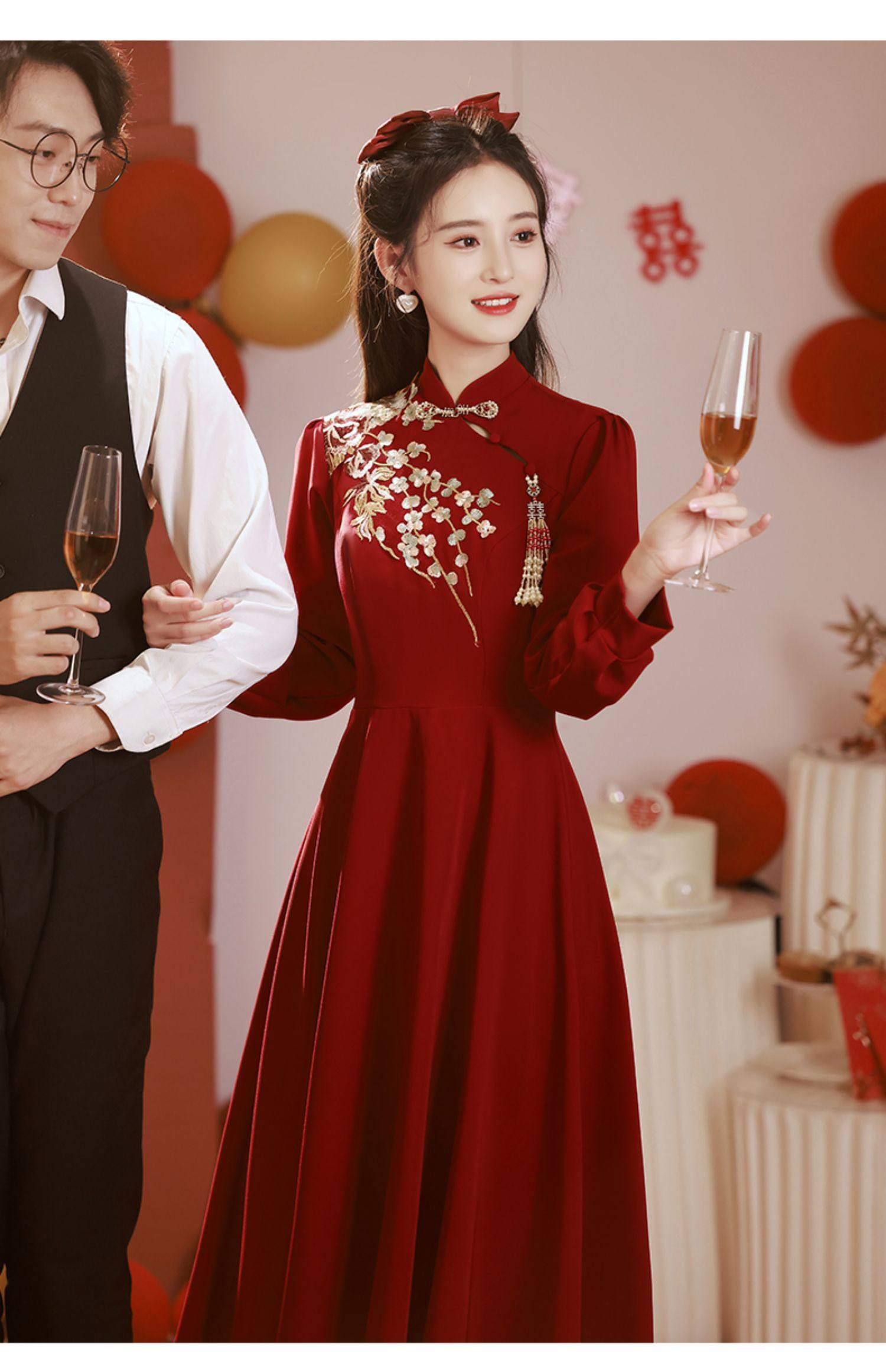 Gaun pengantin bersulang Cheongsam, gaun pertunangan musim dingin pengantin wanita lengan panjang merah baru musim gugur dan musim dingin 2023