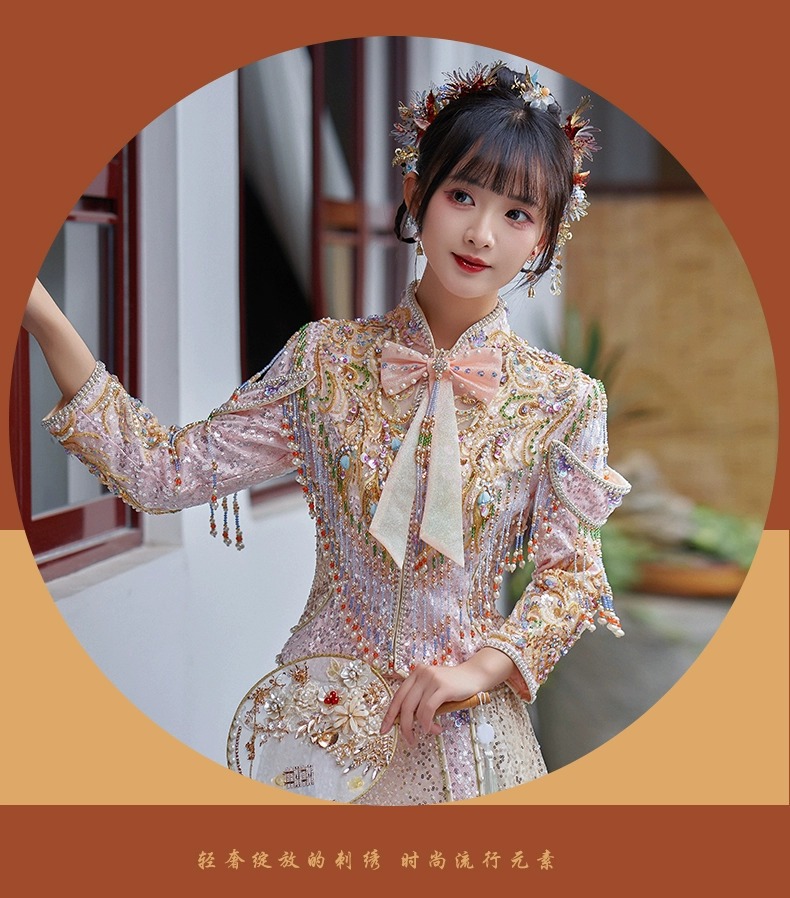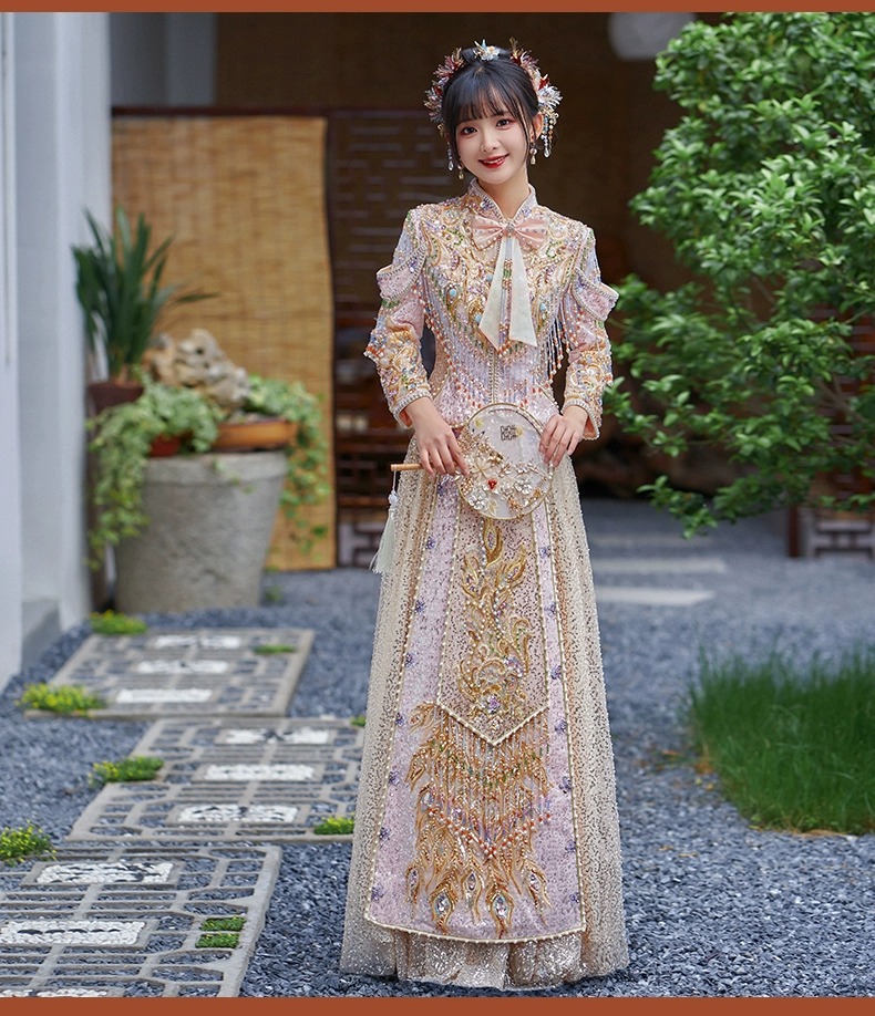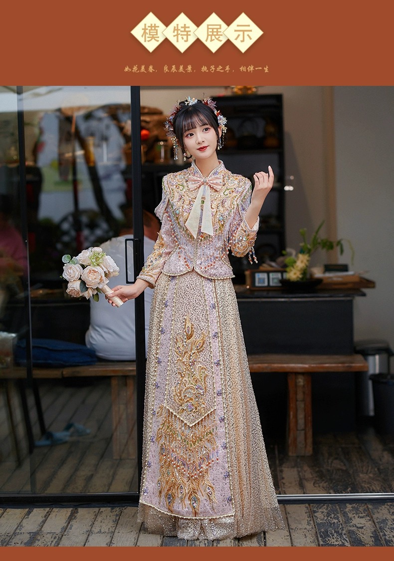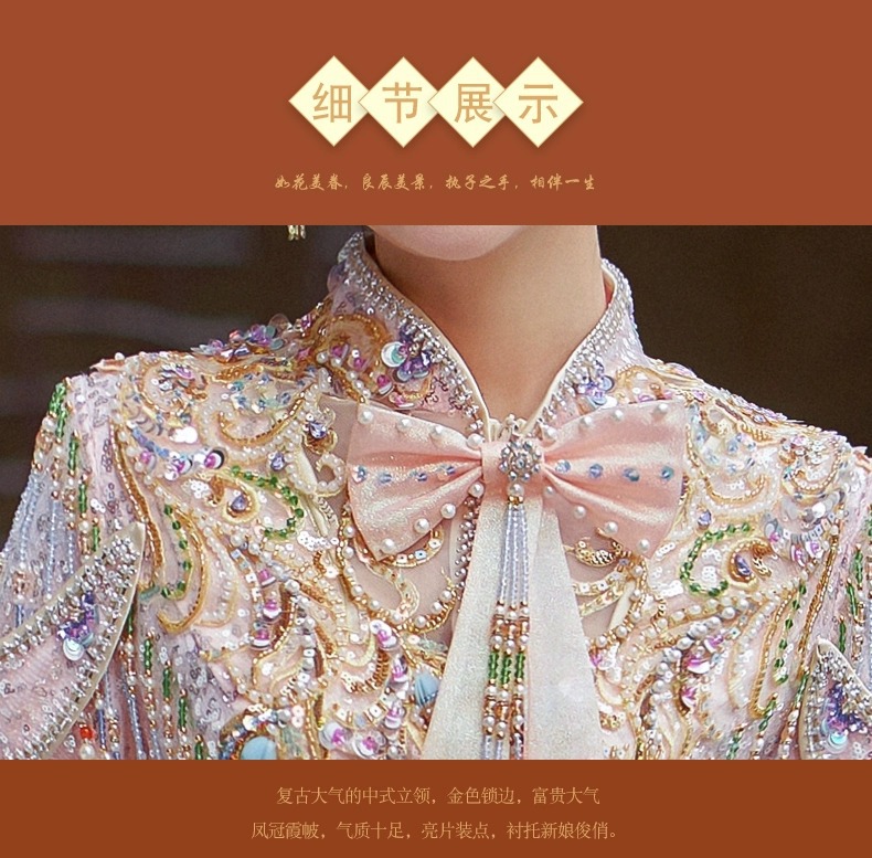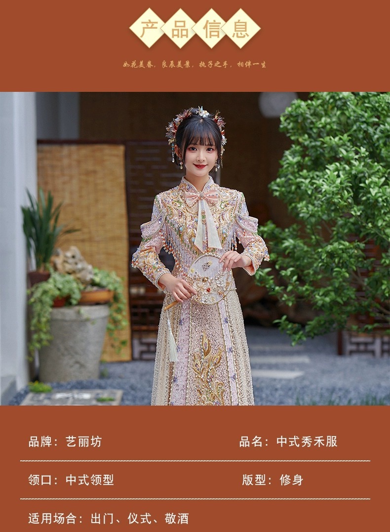 Gaun Xiuhe bergaya Cina baru untuk pengantin, gaun Xiuhe mewah kelas atas dengan pita manis musim panas baru 2026 dalam warna pink sampanye.
