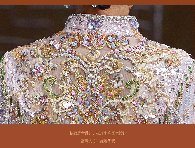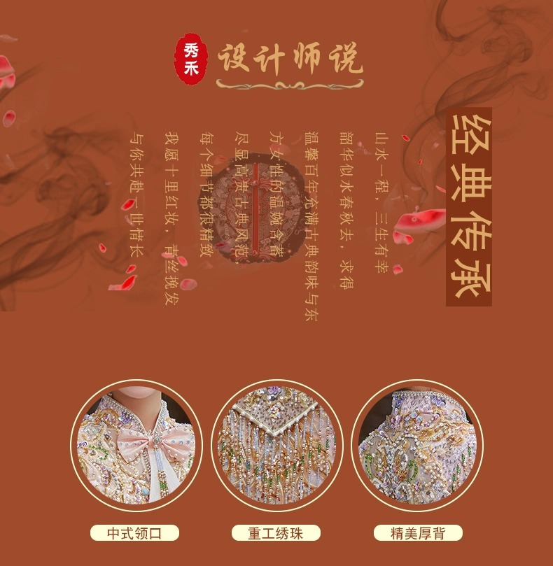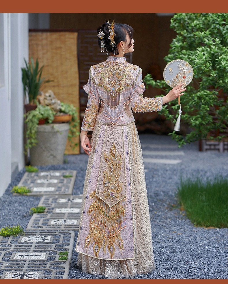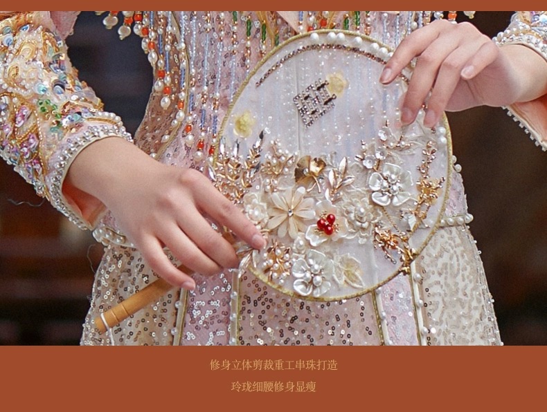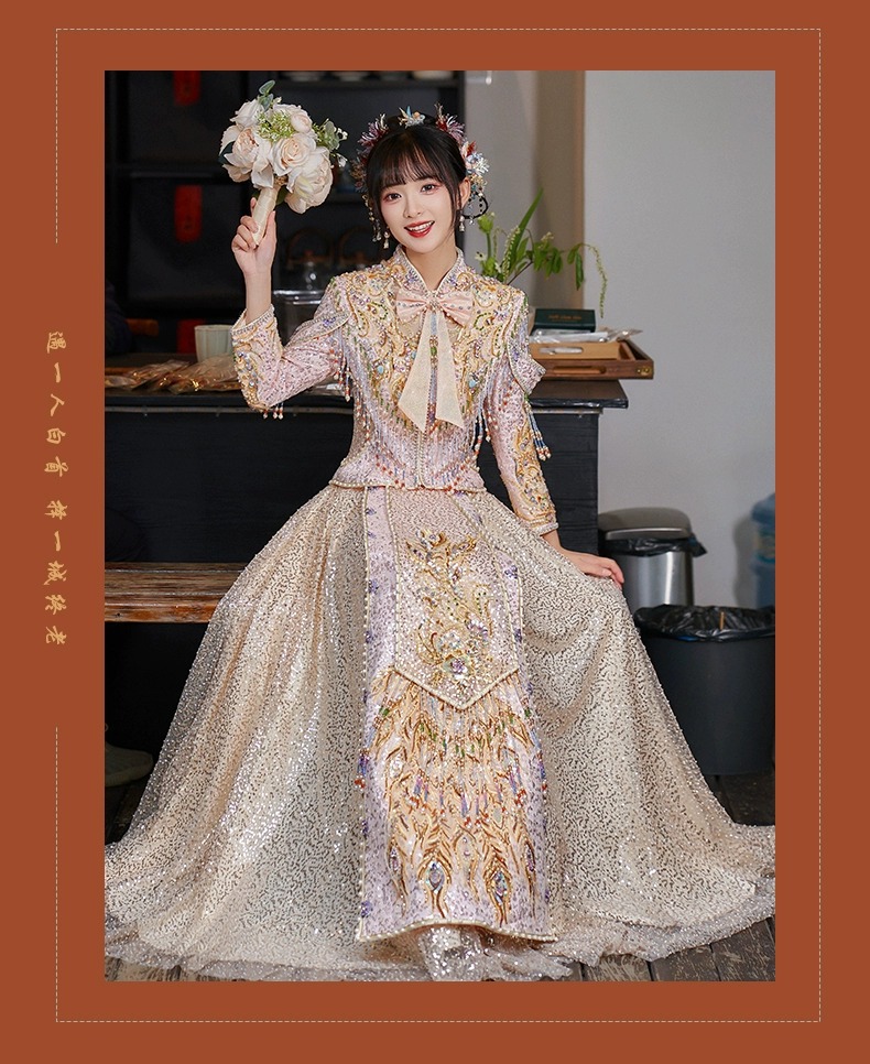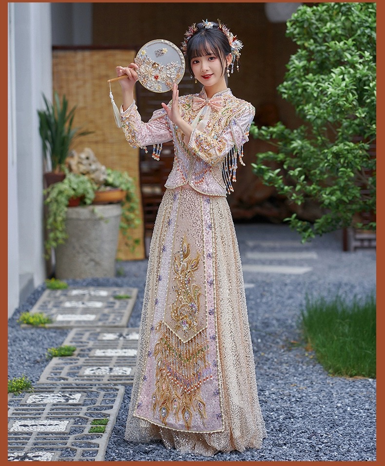 Gaun Xiuhe bergaya Cina baru untuk pengantin, gaun Xiuhe mewah kelas atas dengan pita manis musim panas baru 2026 dalam warna pink sampanye.