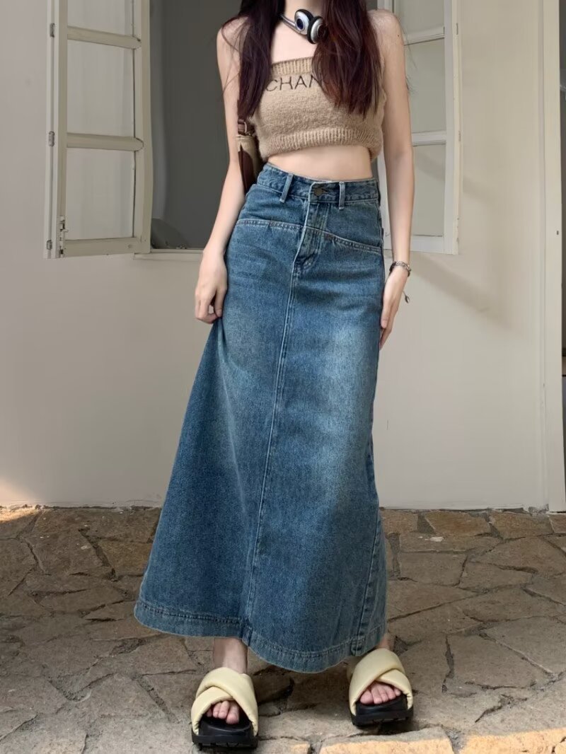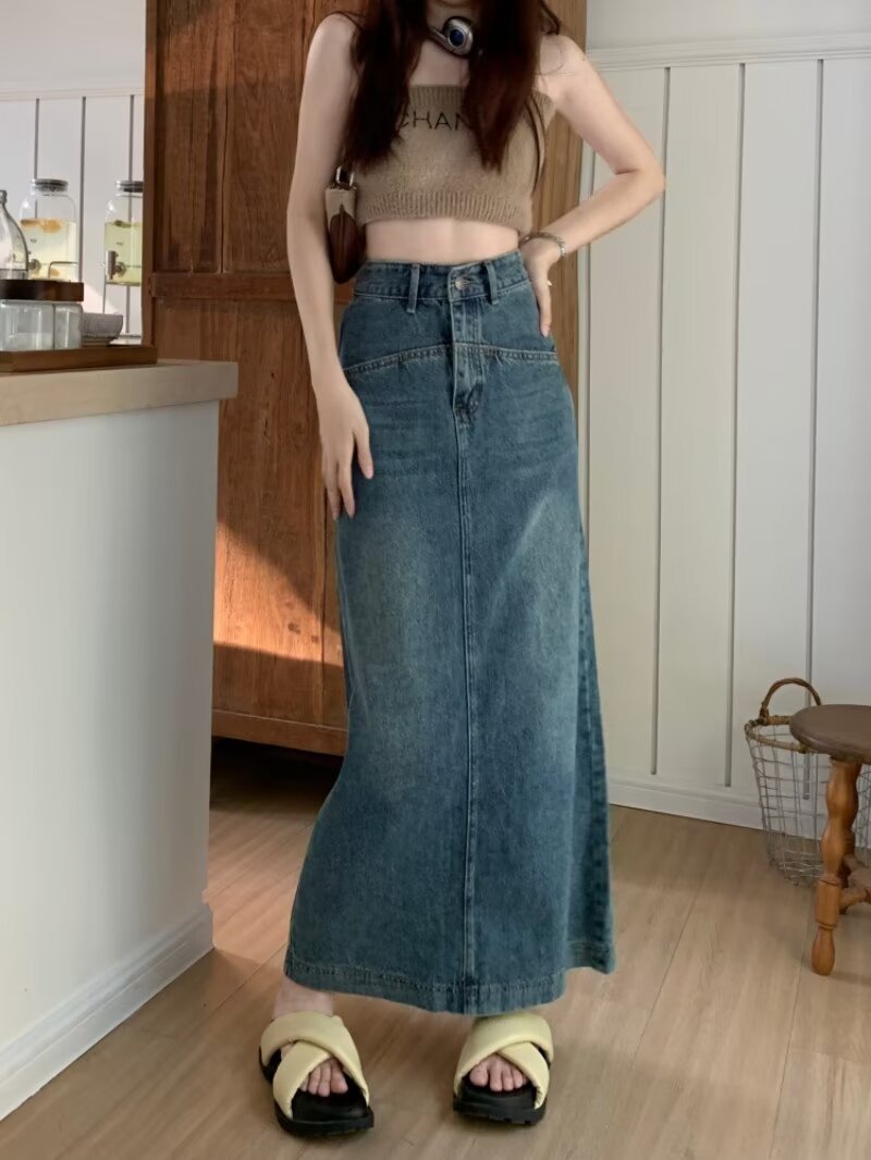 Rok Denim wanita ukuran besar, rok panjang baru 2024, pinggang tinggi, desain pelangsing, celah belakang indera, gaya Barat