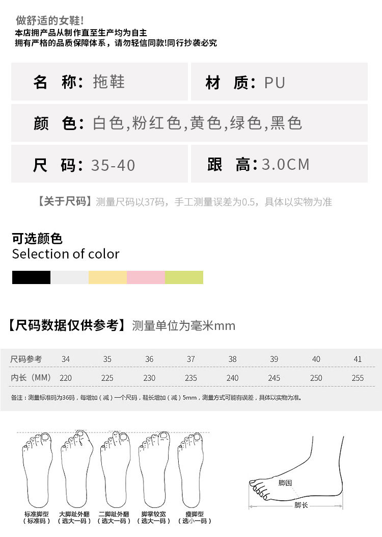本店发货前都会检查仔细,万一有落网之鱼,请及时找我们反馈,把有问题的拖鞋拍照留底提交给我们,我们会妥善处理。本店自产自销、批量生产,在质量上我们追求高要求,明显质量问题交由我们负责处理,小污点瑕疵、微小色差、气味等不影响使用非质量问题不属于售后范围,鞋子为发泡类产品,长度误差正负0.5cm,介意勿拍(拍下即认可本信息)。由于生产过程中鞋处于密封包装,少许新鞋气味,放置通风处些许时间即可散发。希望我们的全心全意跟努力能换回你们的5星好评,谢谢大家!