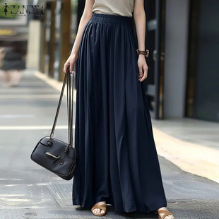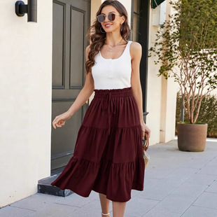 速卖通新款女士荷叶边春季休闲长裙素色裙子 复古风格褶皱半身裙