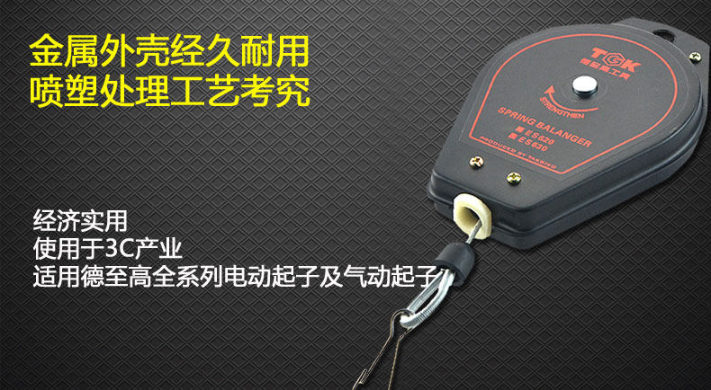 用于汽车模具,配件焊接、流水线及各种固定位置上工作量较集中,操作工具较笨重,使用工具持续时间较长的场合。无论在装配生产线或定工位工作的场合,凡是使用手动工具及吊携设备的场合均可使用,也可作提升工具的辅助工具使用,达到减轻劳动强度的目的。 该产品借助卷簧积蓄的能量,使所悬挂的操作工具处于无重状态。大大降低了操作工作的劳动的强度,提高了劳动生产效率。