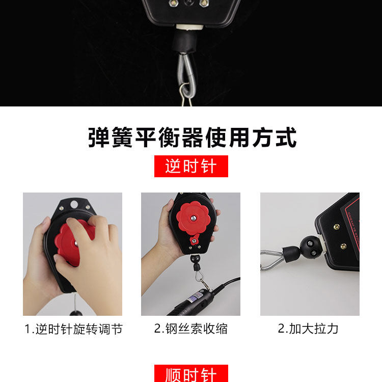 悬挂平衡器时,先连接好保险链。旋转调节蜗杆,使悬挂对象平衡,逆向减少平衡力,顺向增加平衡力。平衡器未悬挂对象时,请勿空拉空反放,以免造成钢丝绳突然回收伤人。