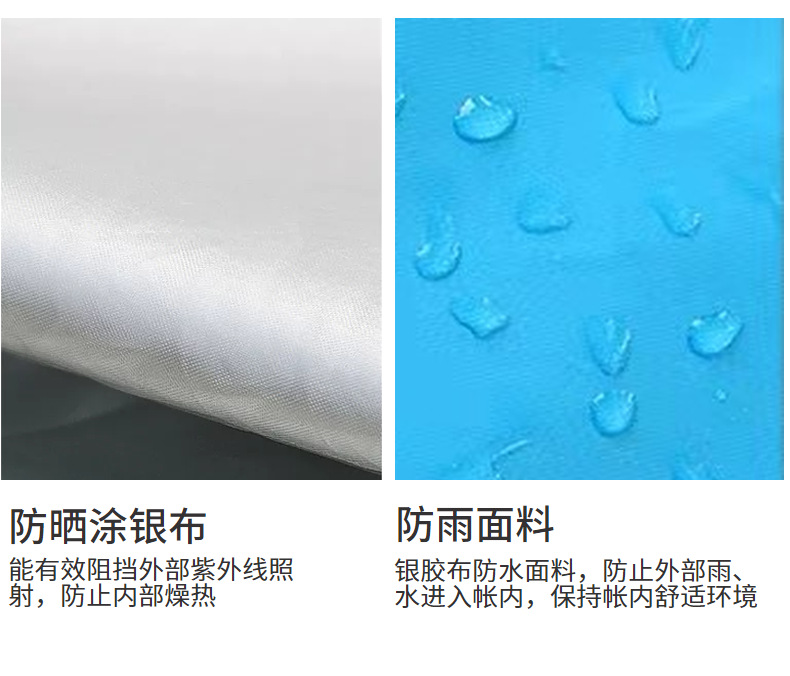 拉链卡顿时,用蜡烛或石蜡润滑,切勿强行拉扯,铝杆用干布擦拭后存放,若关节处有泥沙需清理干净,防止卡顿,地钉生锈可用砂纸打磨,涂抹少量润滑油防锈,每季度取出通风一次,保持面料弹性!