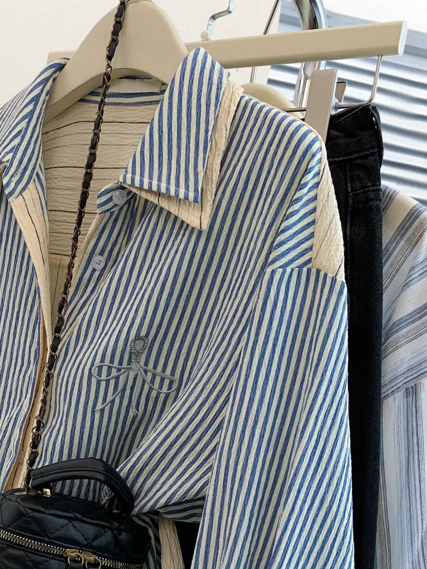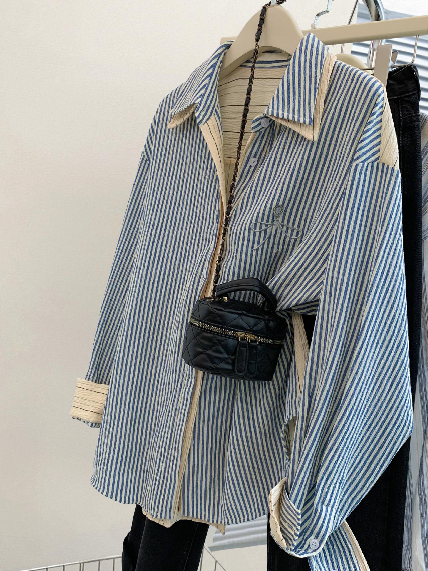 Jaket Kemeja Dua Potong Palsu Bahu Garis Atasan Kemeja Lengan Panjang Pria Kecil Kelas Atas Gaya Korea Musim Gugur dan Musim Dingin Wanita