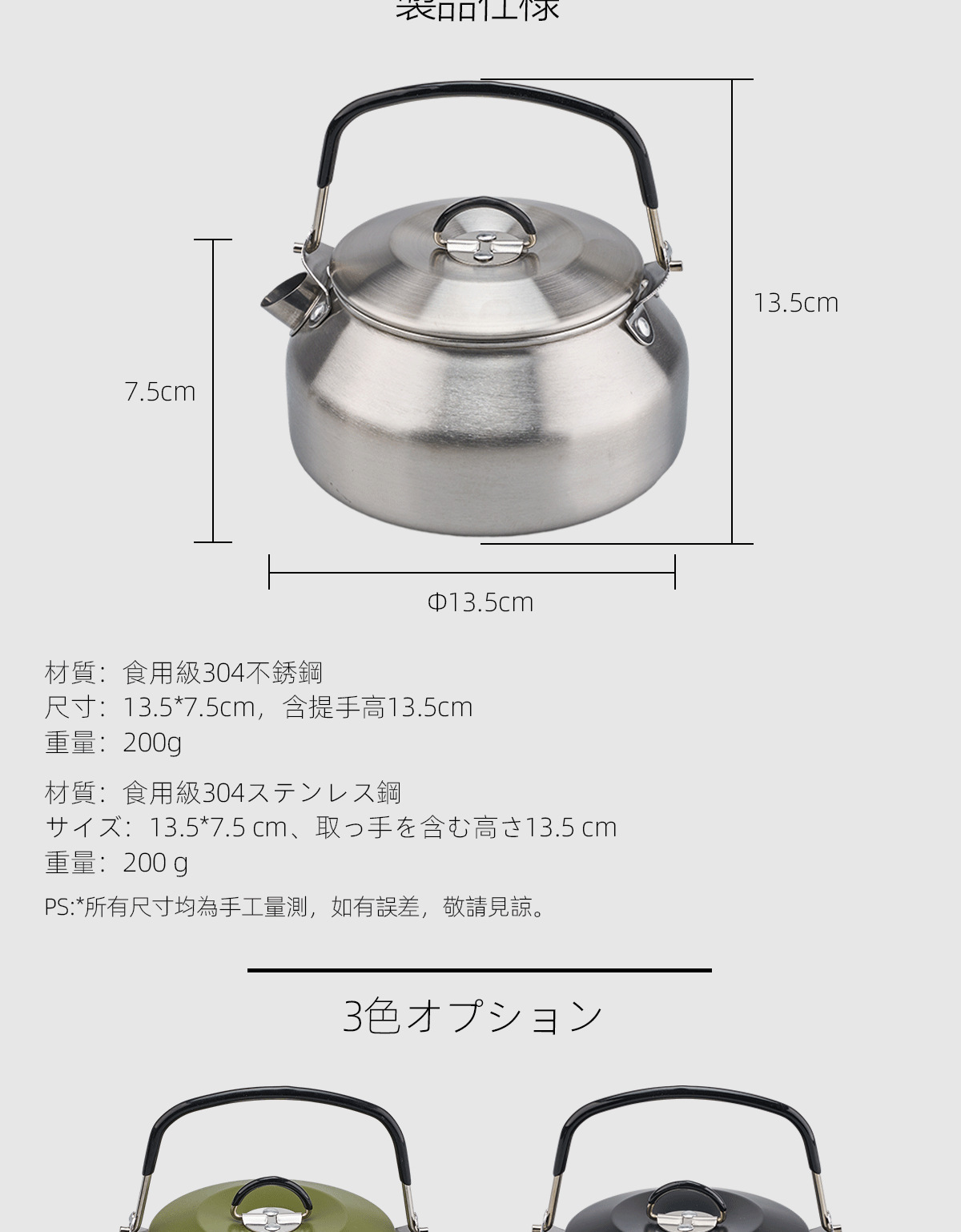 0.8L户外野营烧水壶304不锈钢便携式茶壶野外煮水泡茶开水壶咖啡
