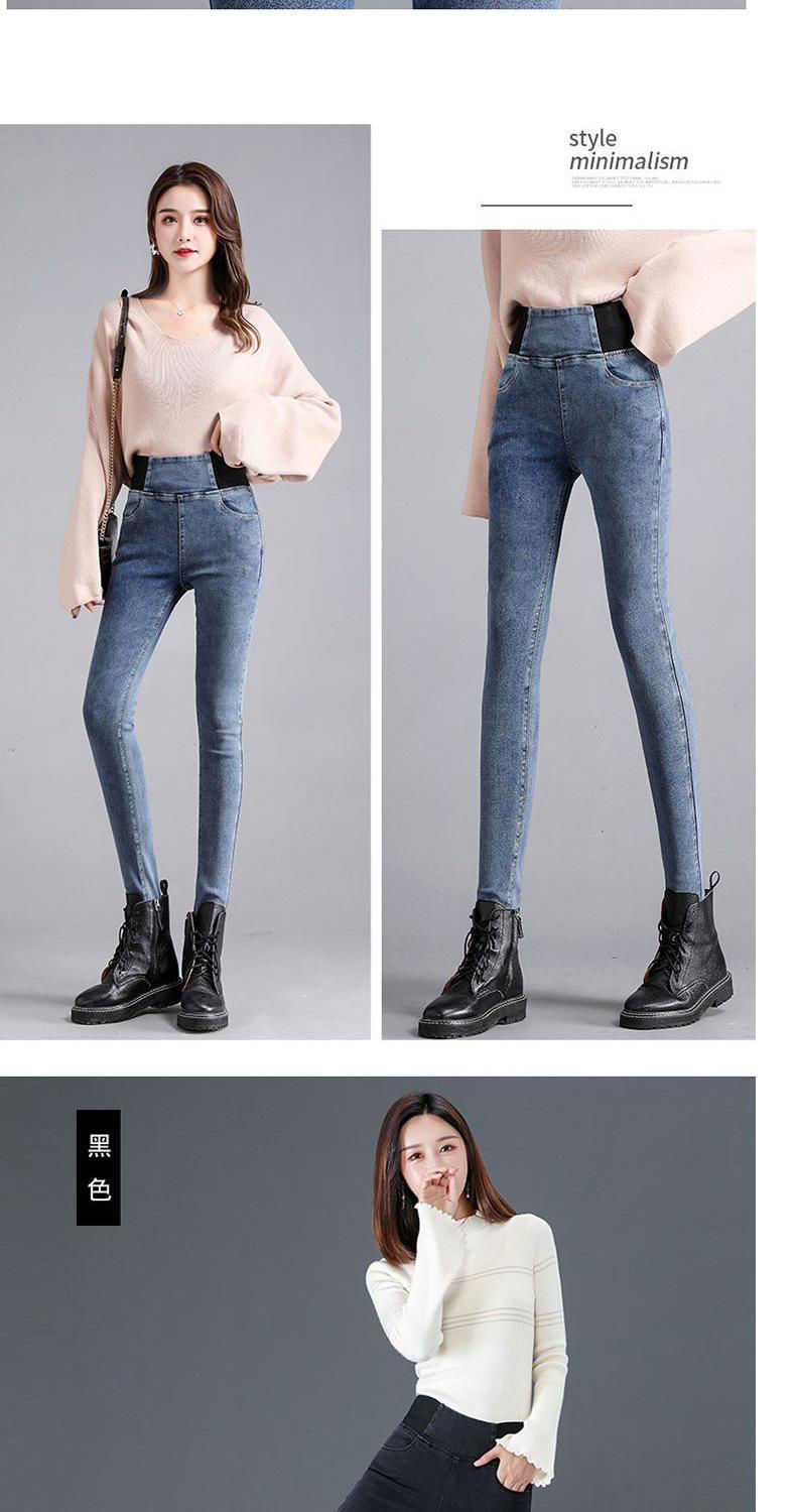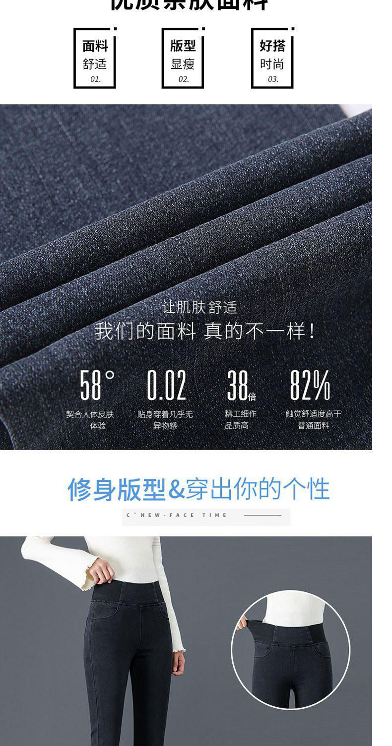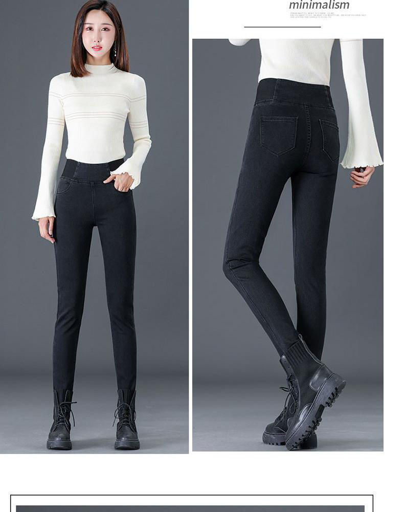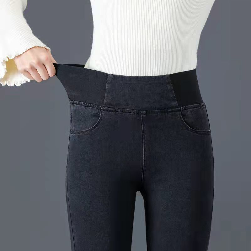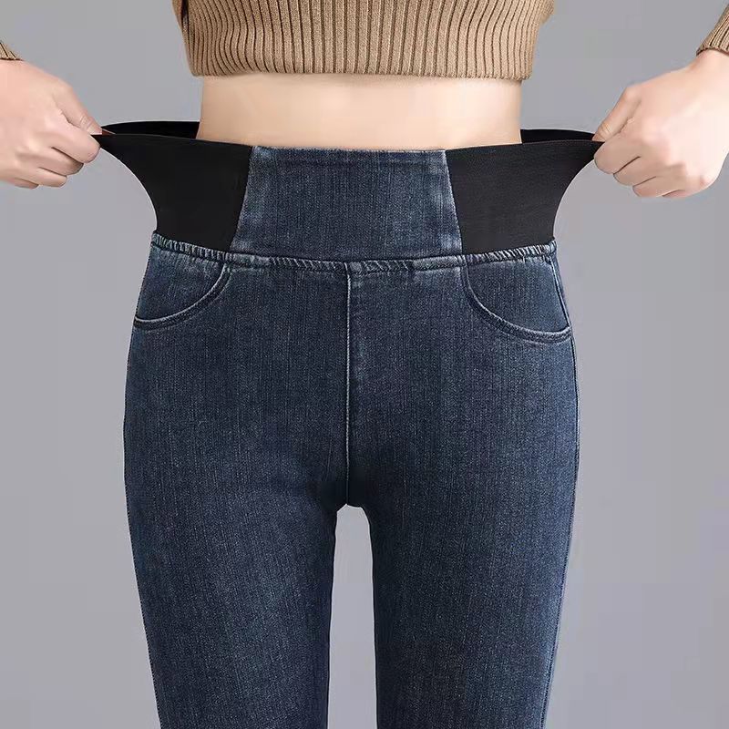 Celana jins pinggang elastis wanita, celana jins pinggang tinggi berlapis bulu, elastis, ukuran besar, pakaian luar musim gugur dan musim dingin, celana pensil ikat perut