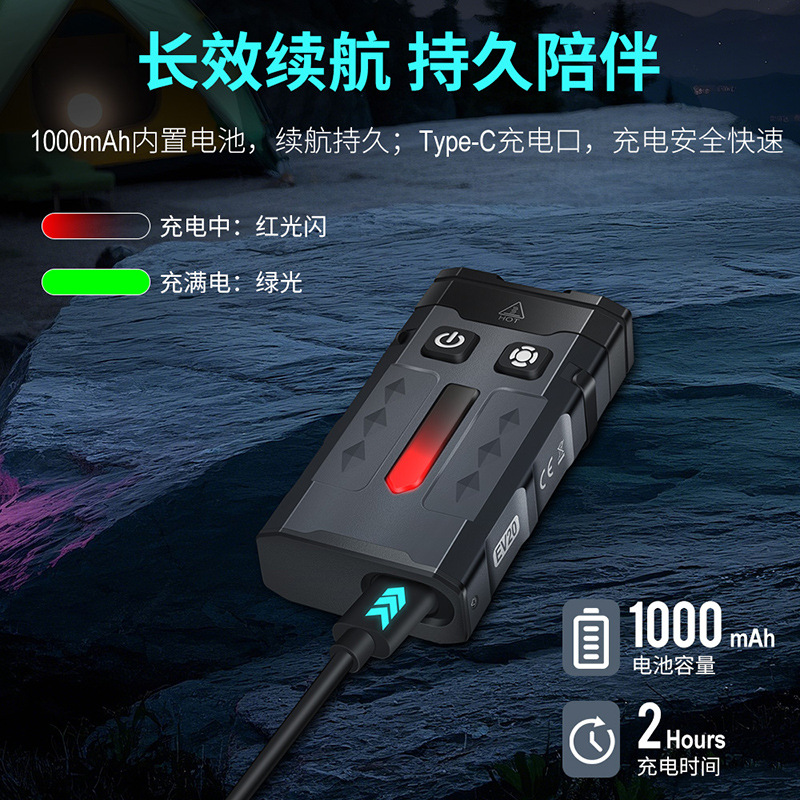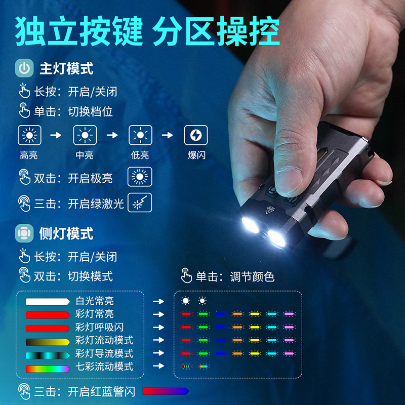 在任何模式下,单击可切换颜色,或都流动速度。 长按右边开关进入附灯后: 三击,进入警示灯红蓝对闪模式。