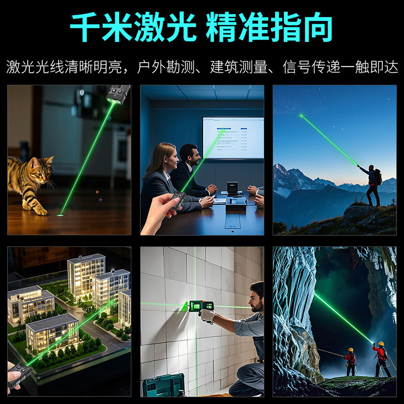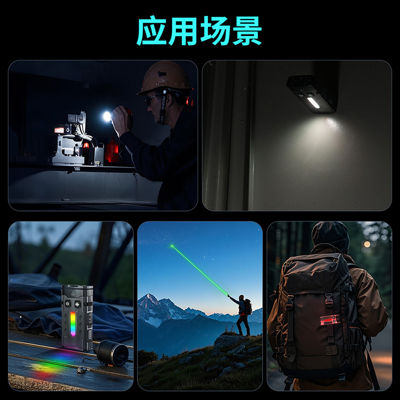 长按左开关:高-中-低-爆闪(循环),(长按关闭)带有记忆。三击进入:绿激光-长按关闭。
