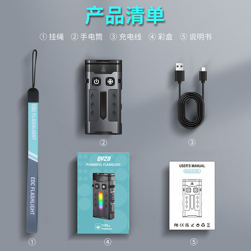 全套配置:手电筒+夹子+0.5米黑色充电线+说明书+彩盒+绳子
