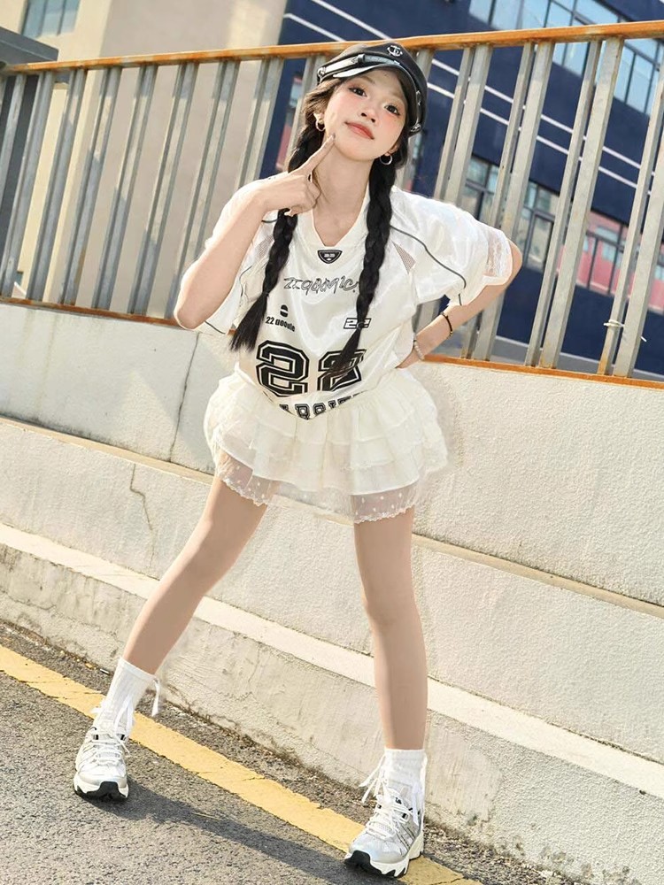 Kaus Wanita Kerah V Retro Gaya Amerika Atasan Gaya Olahraga Longgar Lengan Pendek Pasangan Kombinasi Renda Musim Panas Atasan Desain