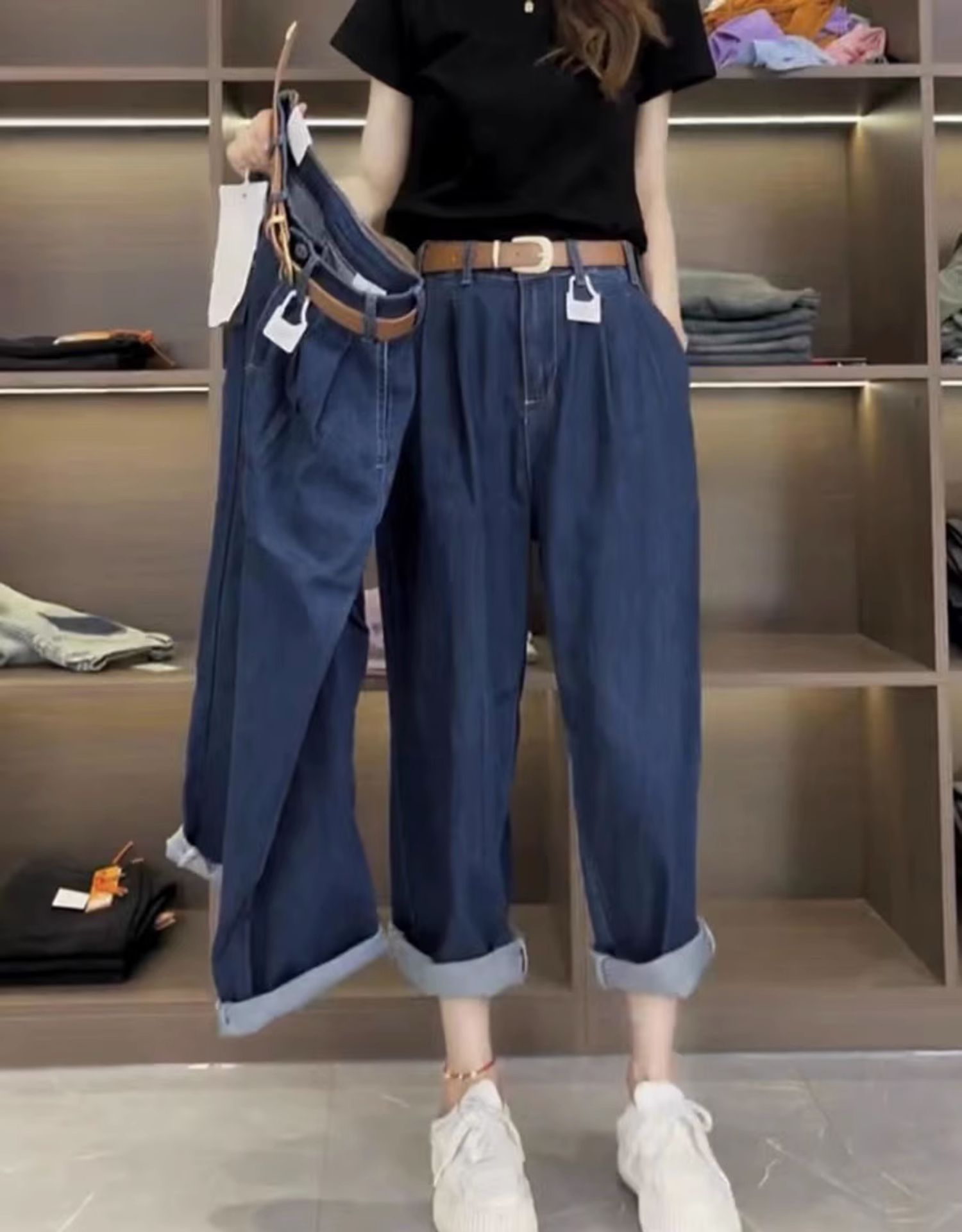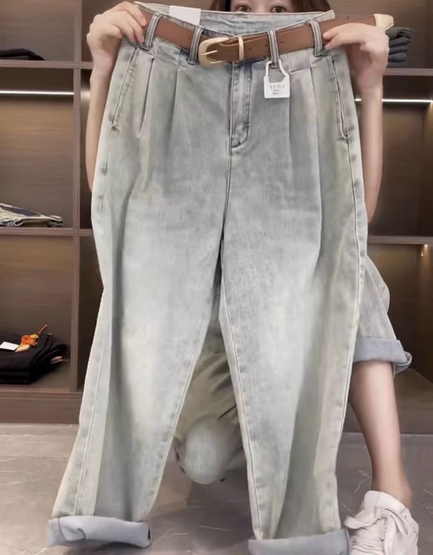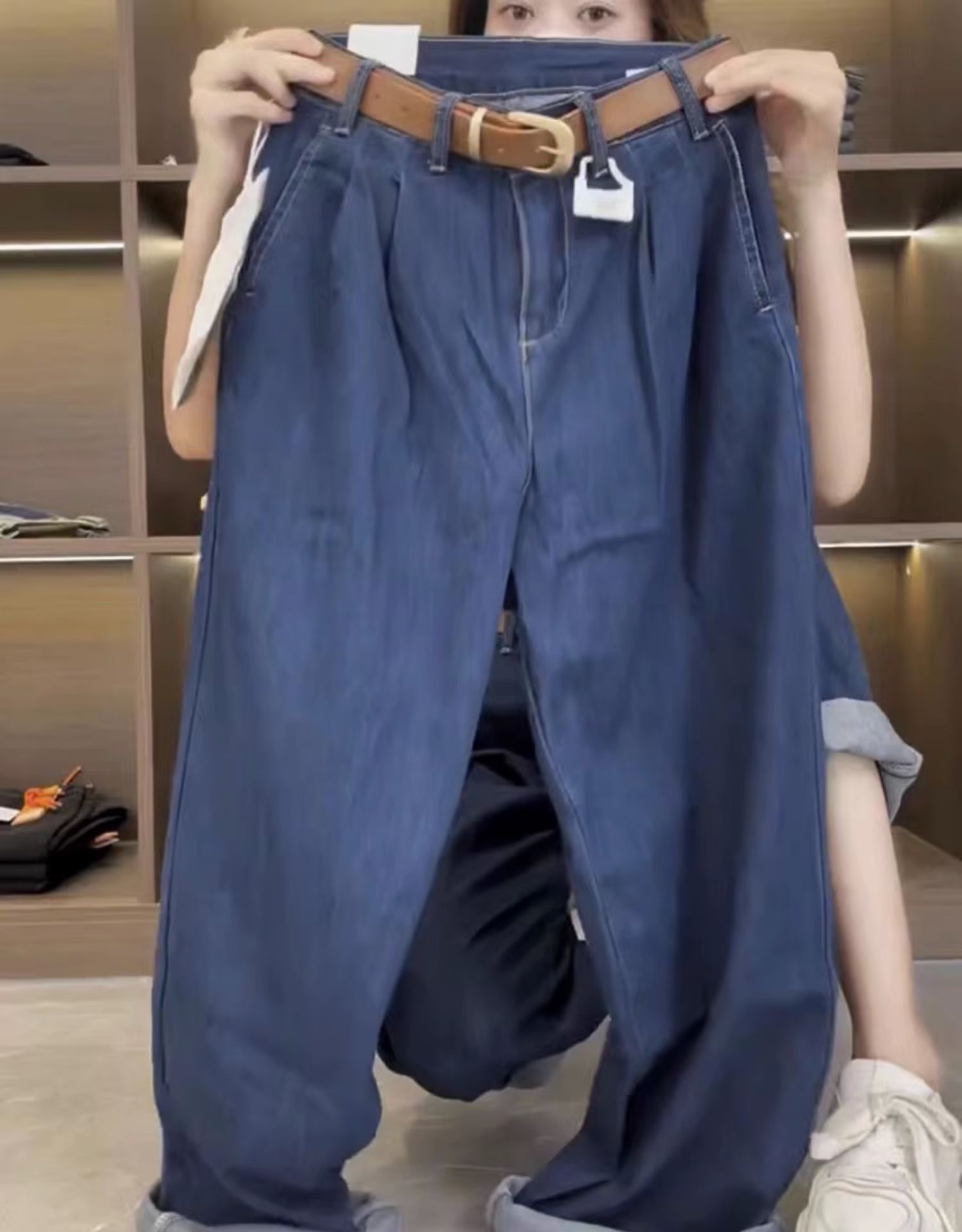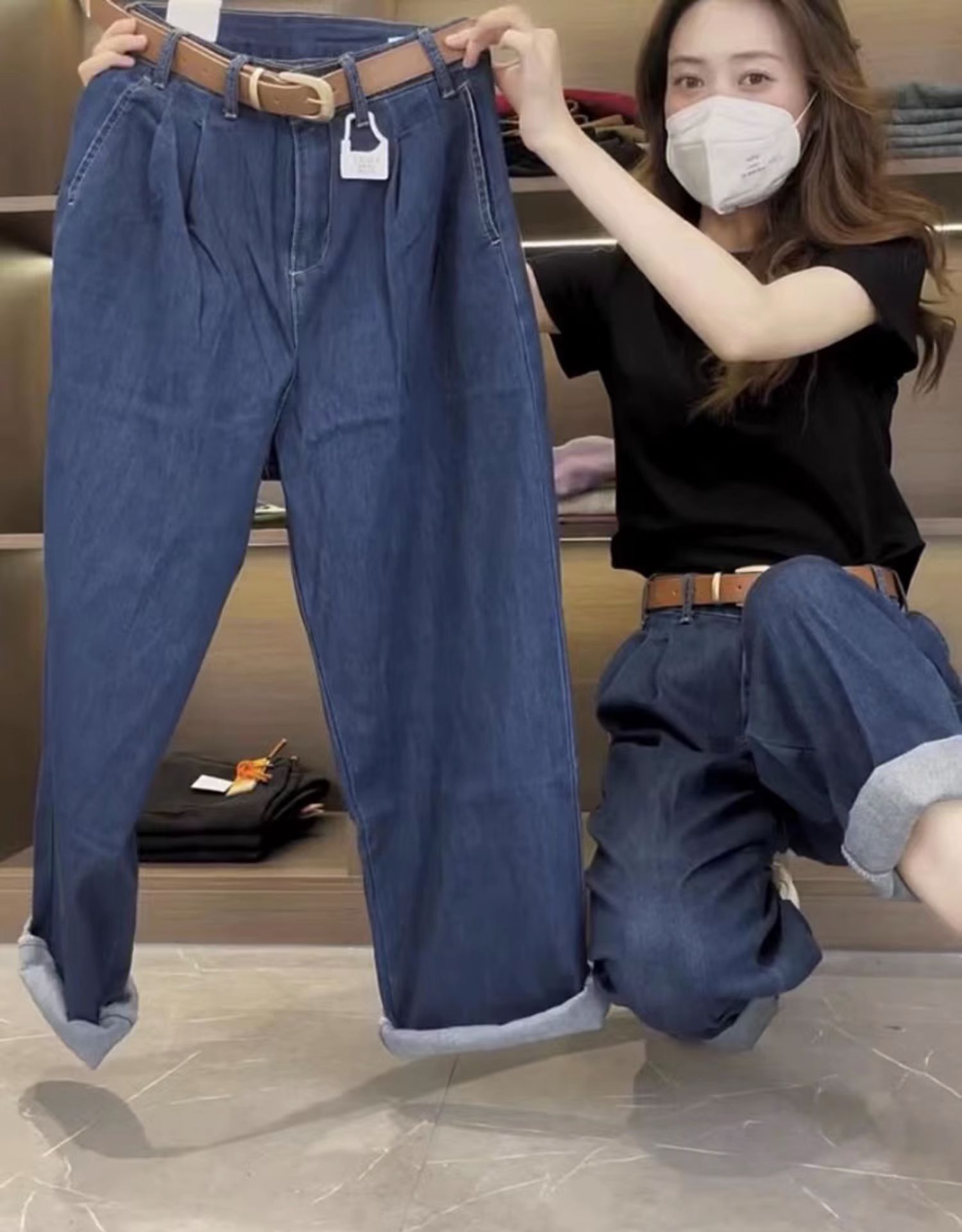 Celana jins harem elastis ukuran Plus wanita, celana Jin kaki lebar lurus ramping pinggang tinggi musim gugur musim dingin, celana jins longgar ukuran besar untuk wanita