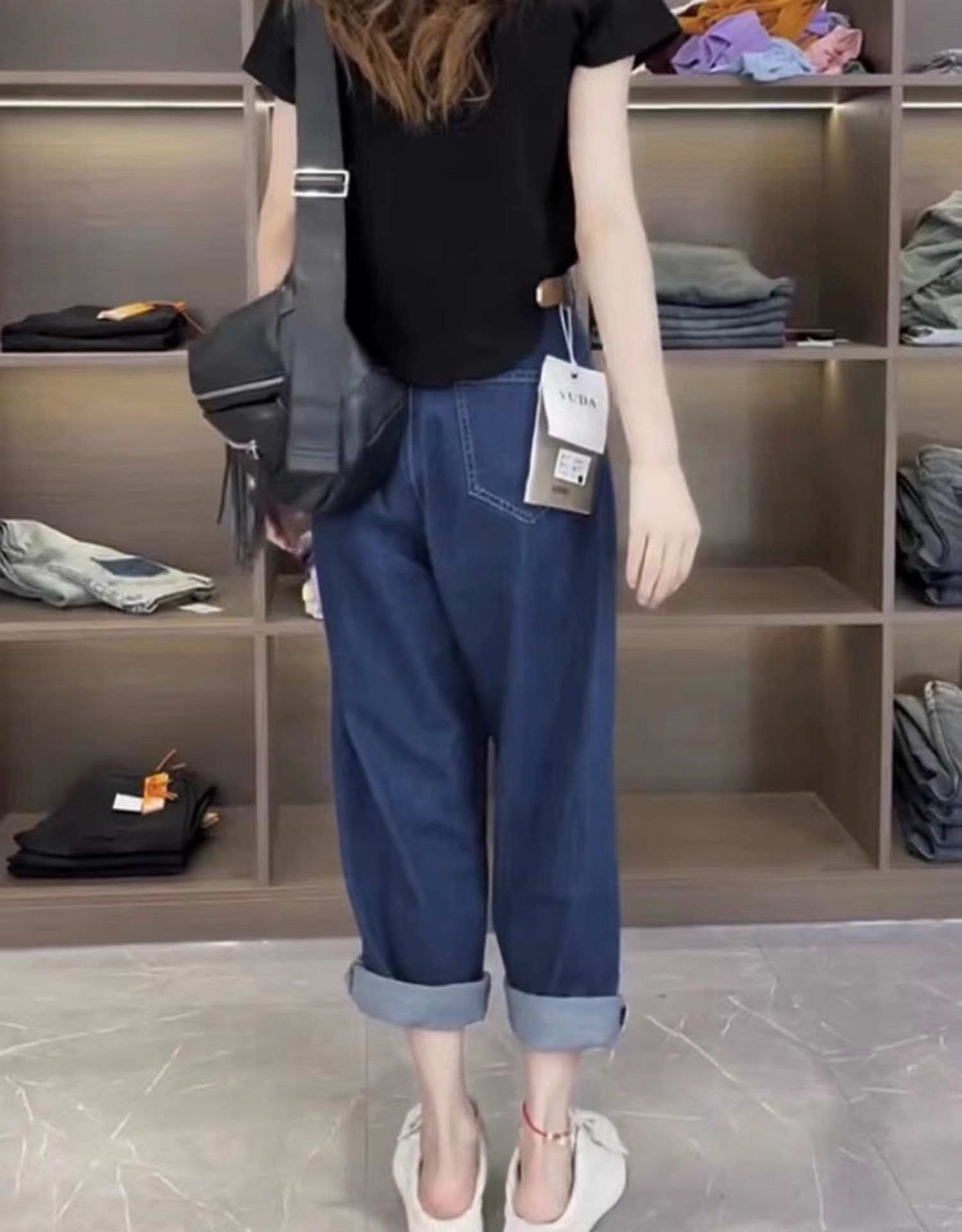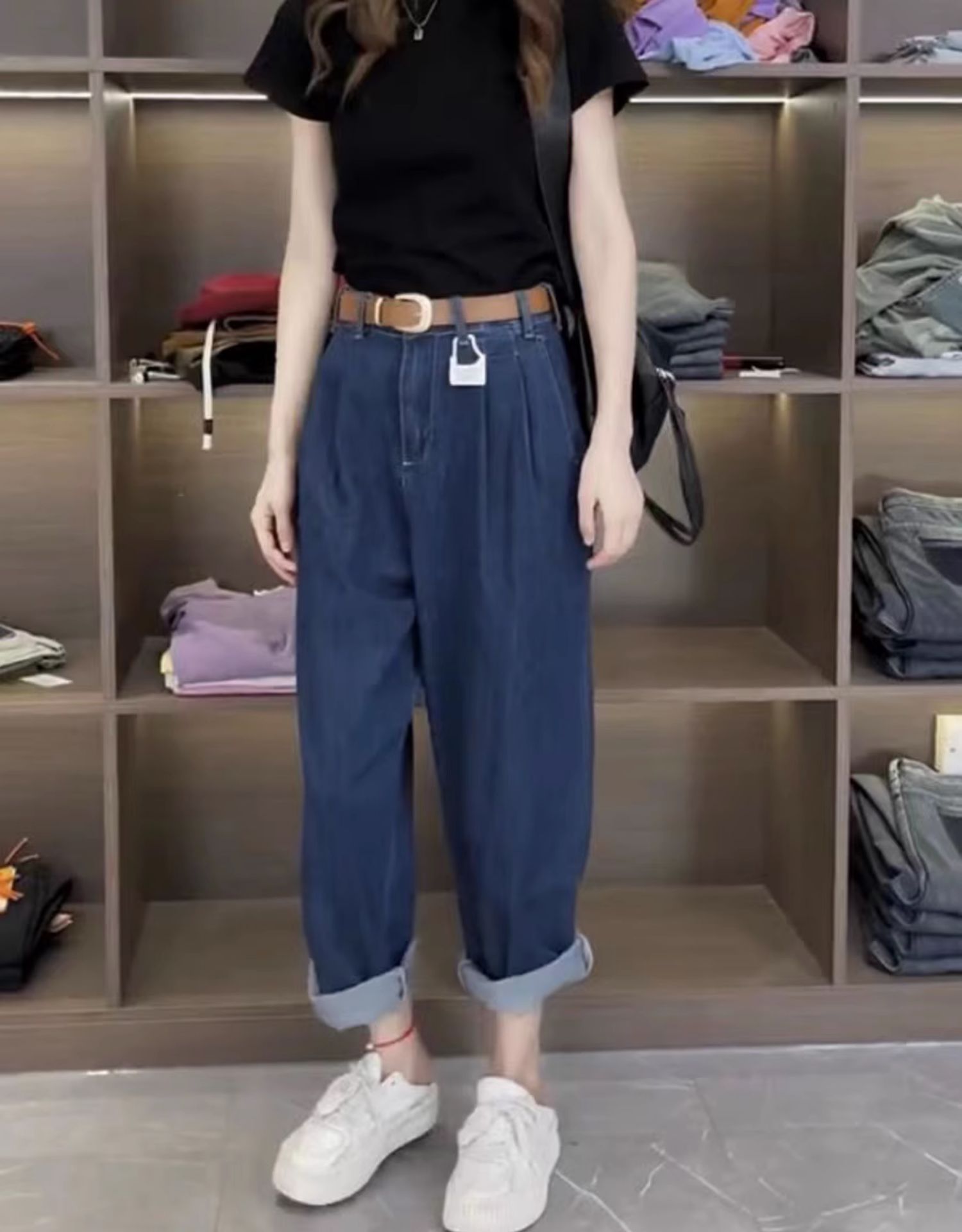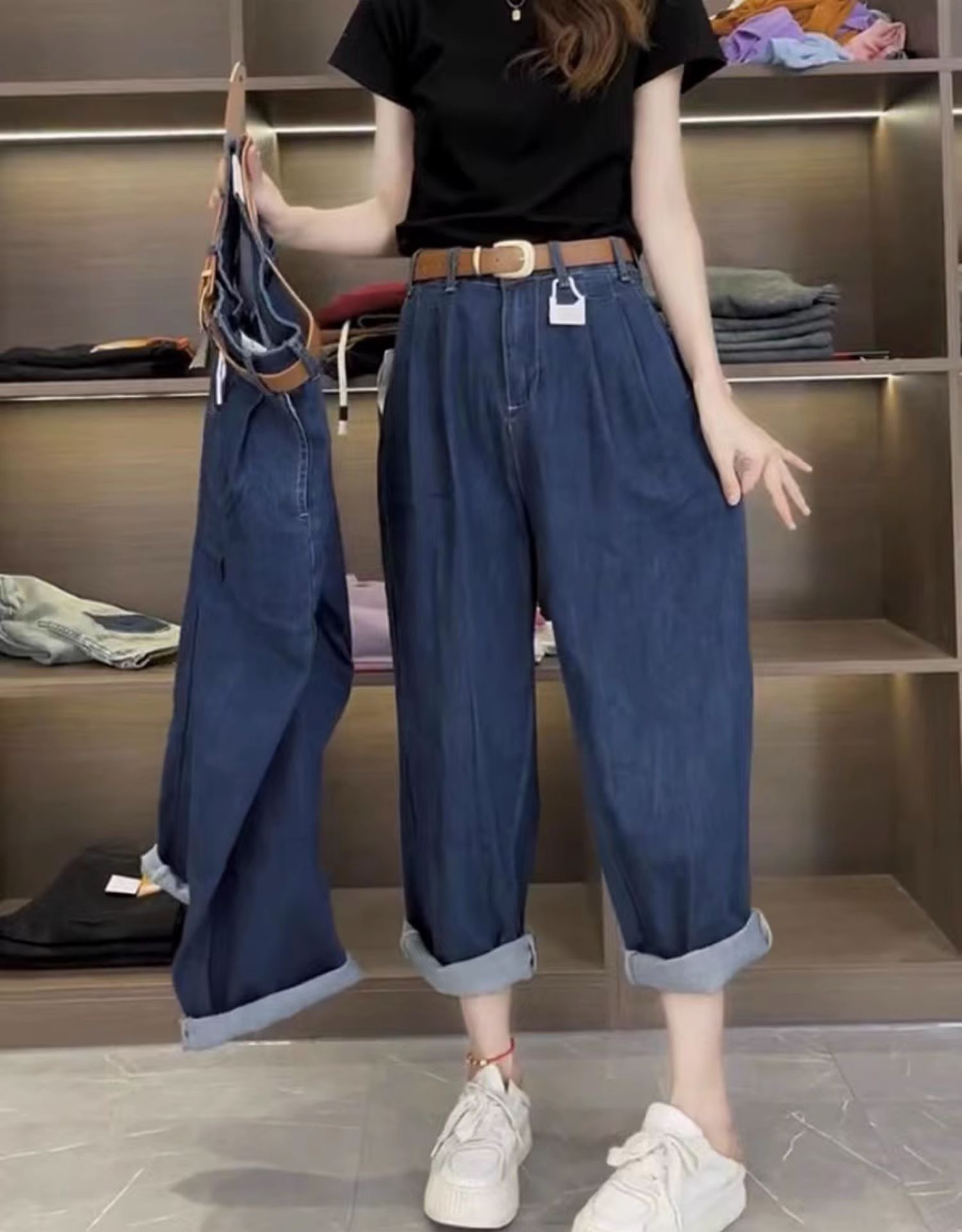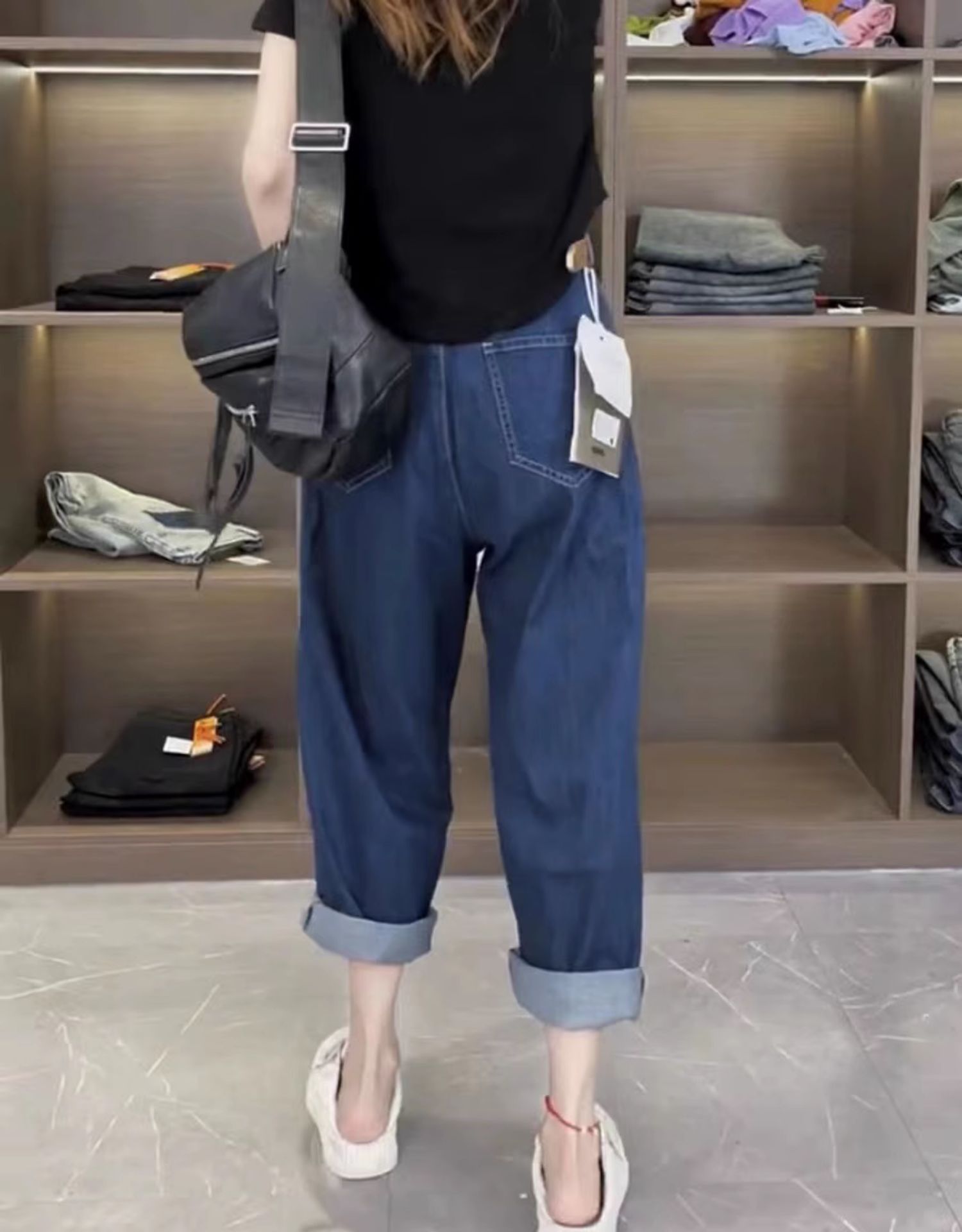Celana jins harem elastis ukuran Plus wanita, celana Jin kaki lebar lurus ramping pinggang tinggi musim gugur musim dingin, celana jins longgar ukuran besar untuk wanita