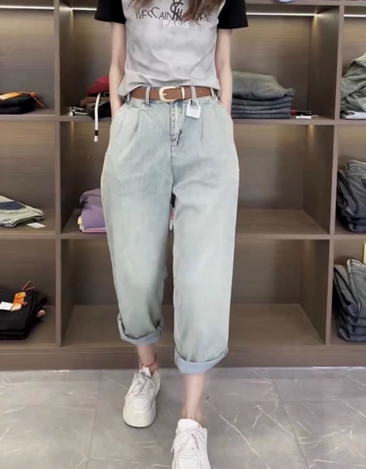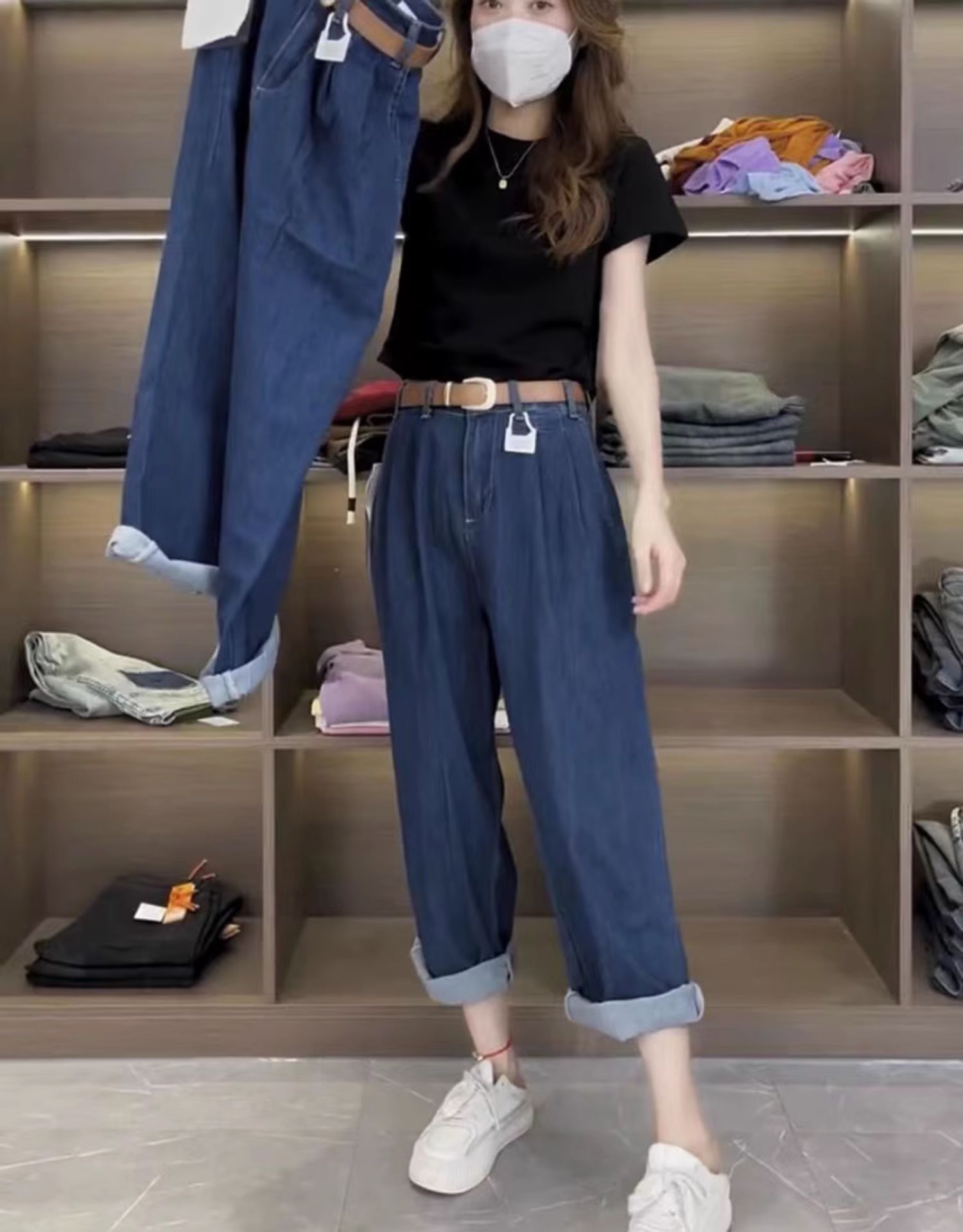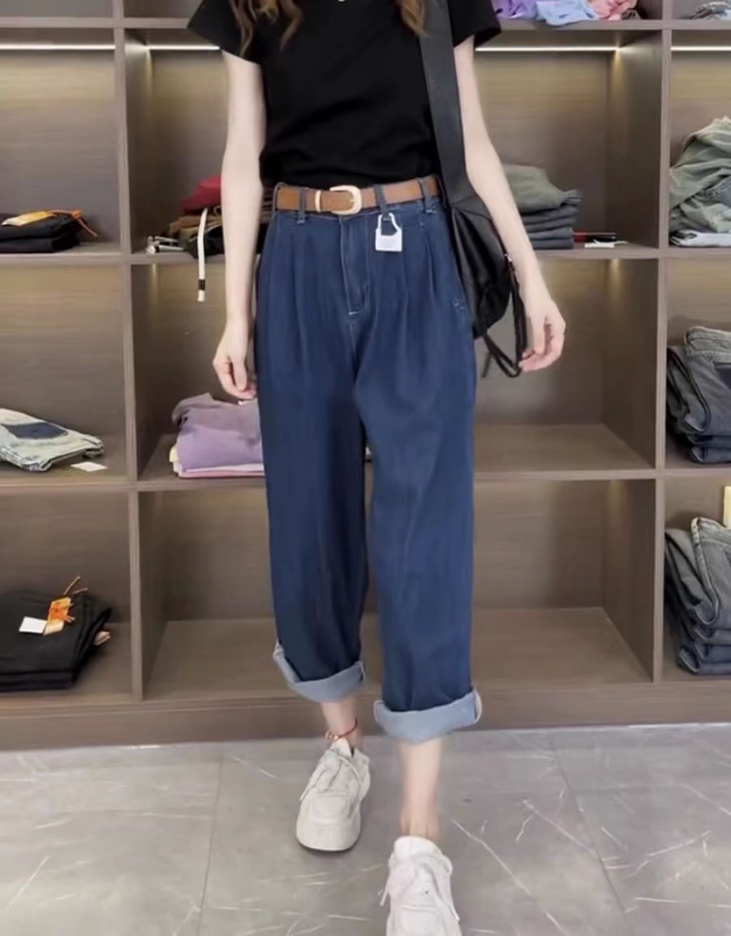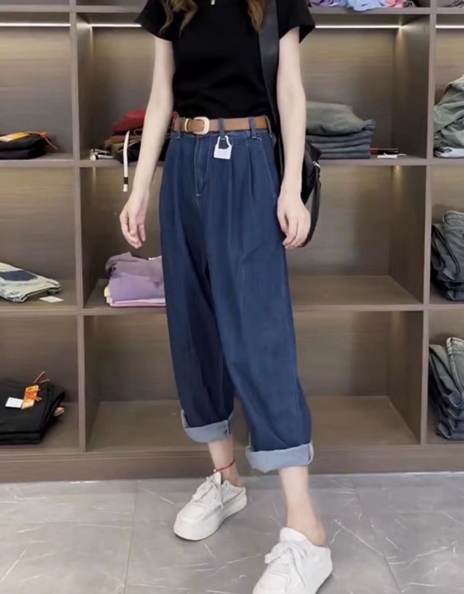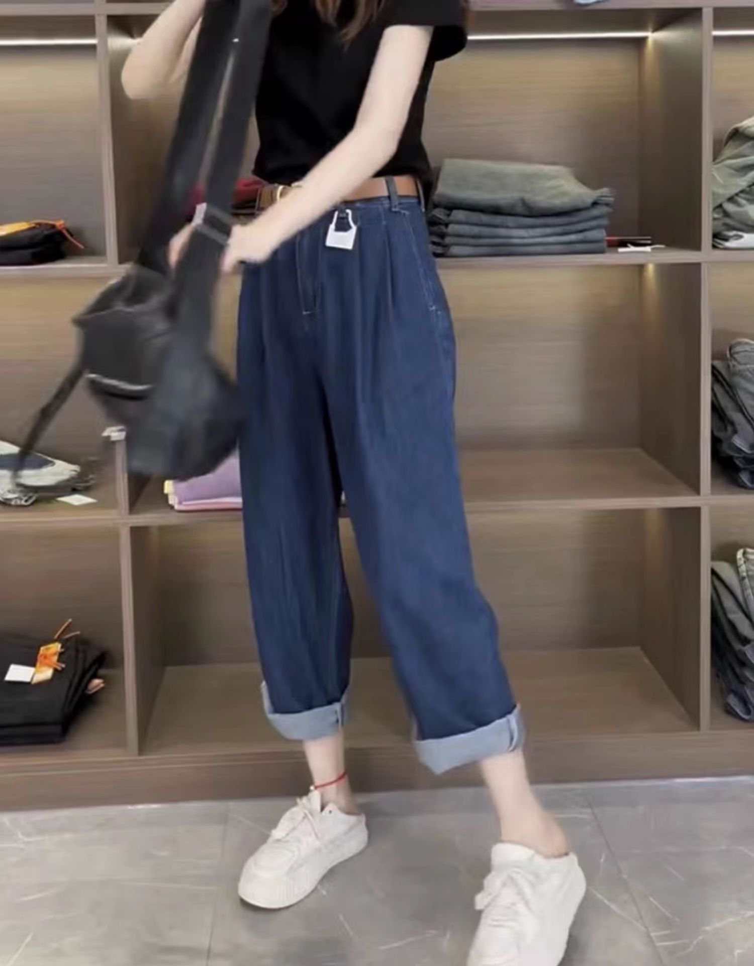 Celana jins harem elastis ukuran Plus wanita, celana Jin kaki lebar lurus ramping pinggang tinggi musim gugur musim dingin, celana jins longgar ukuran besar untuk wanita