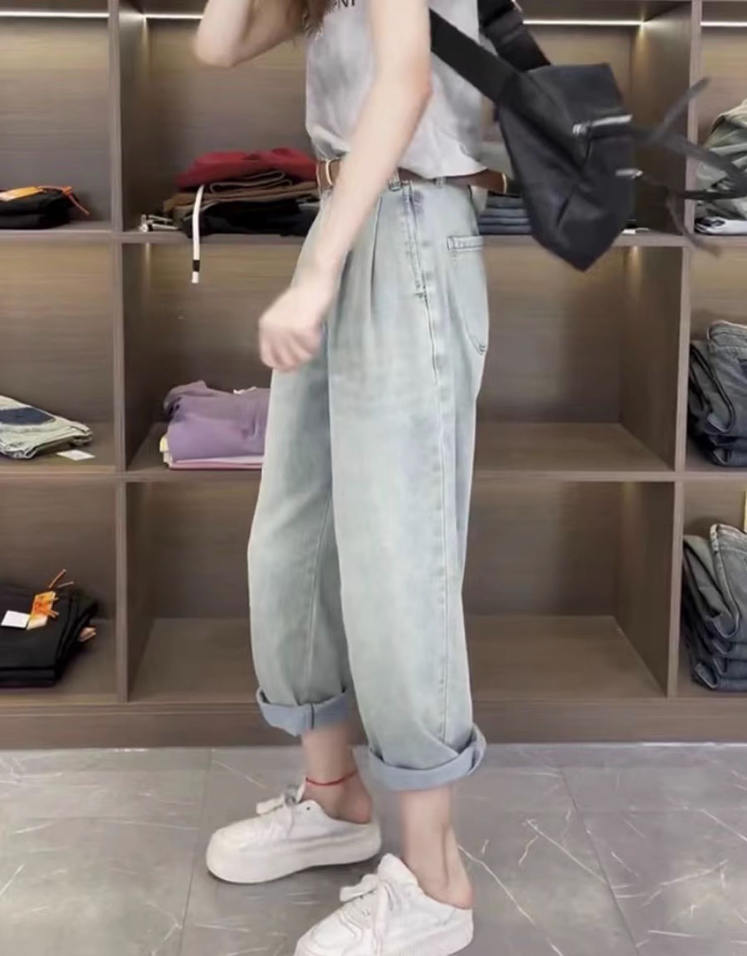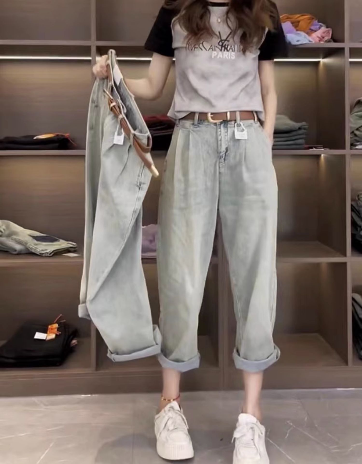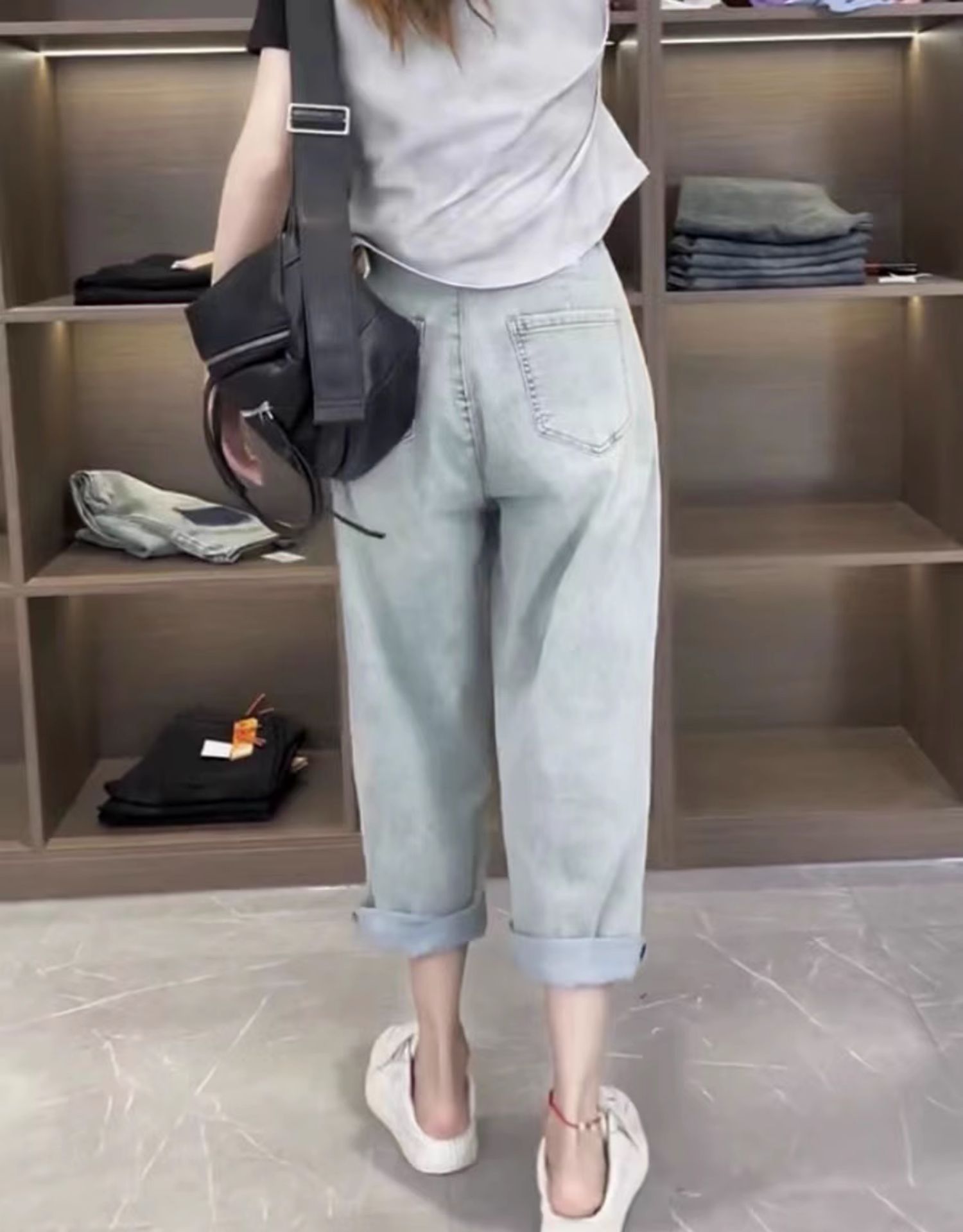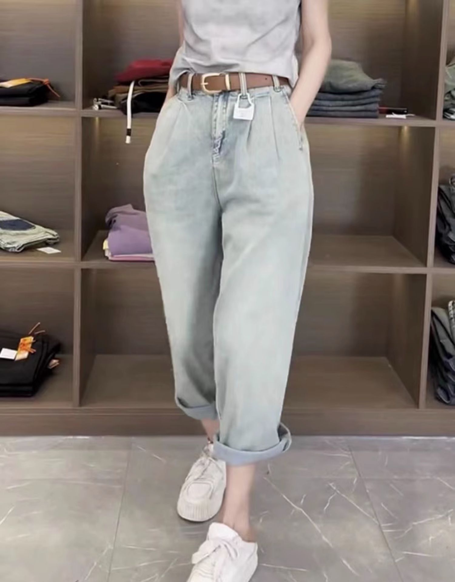 Celana jins harem elastis ukuran Plus wanita, celana Jin kaki lebar lurus ramping pinggang tinggi musim gugur musim dingin, celana jins longgar ukuran besar untuk wanita