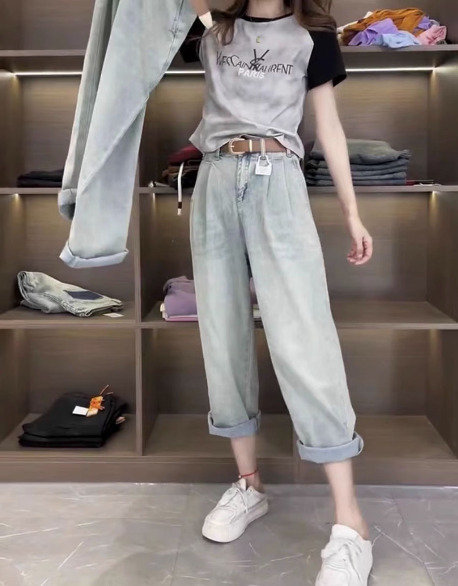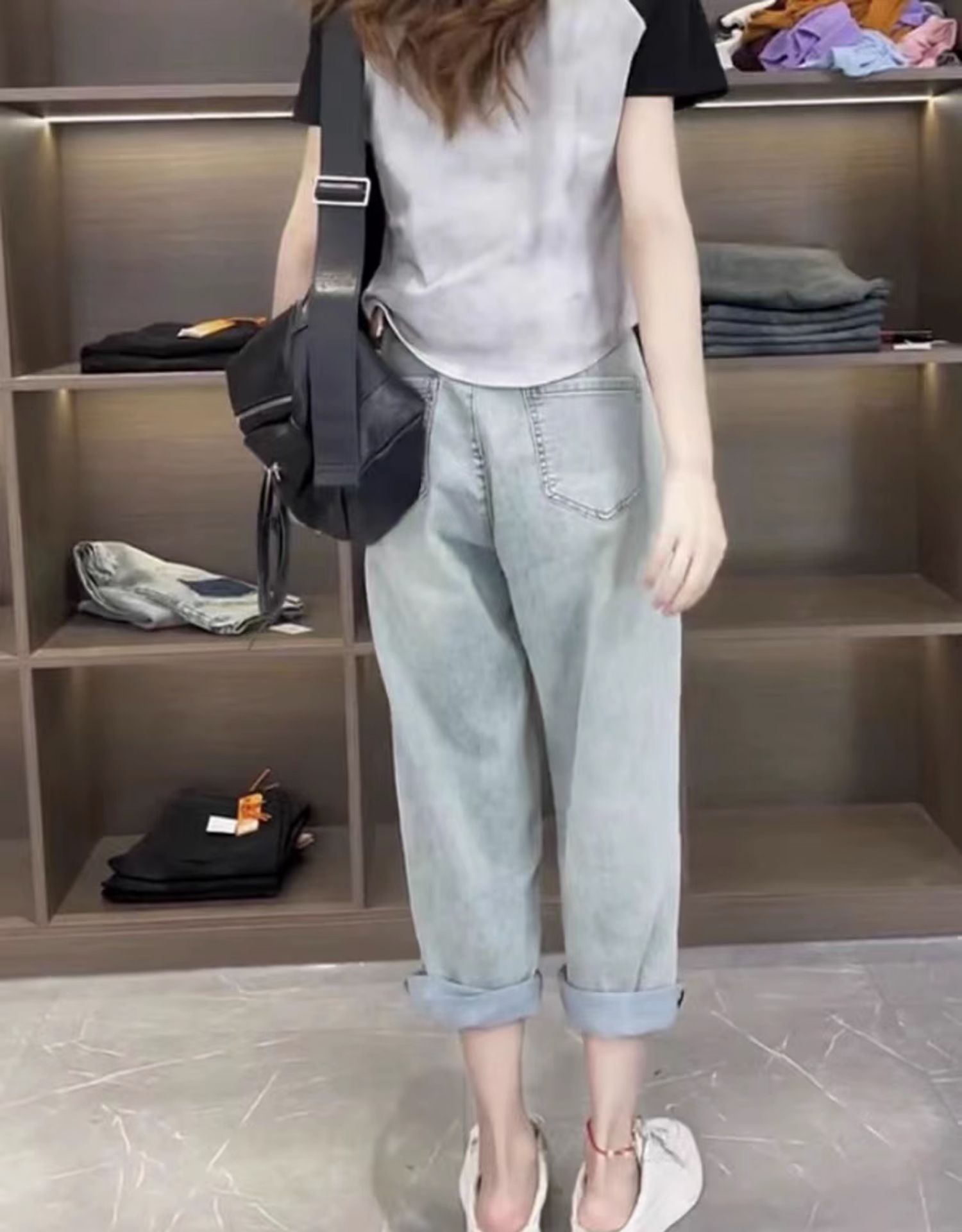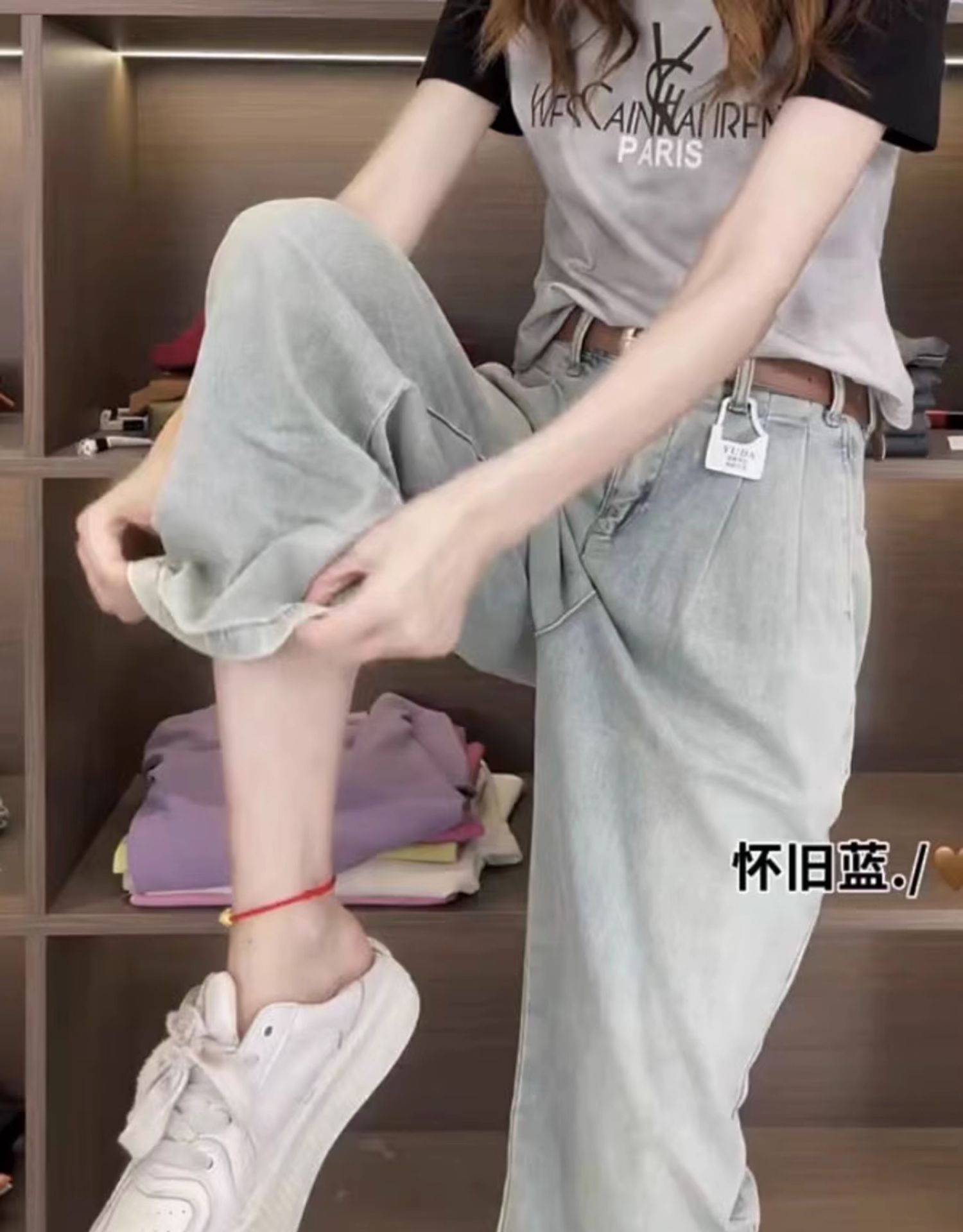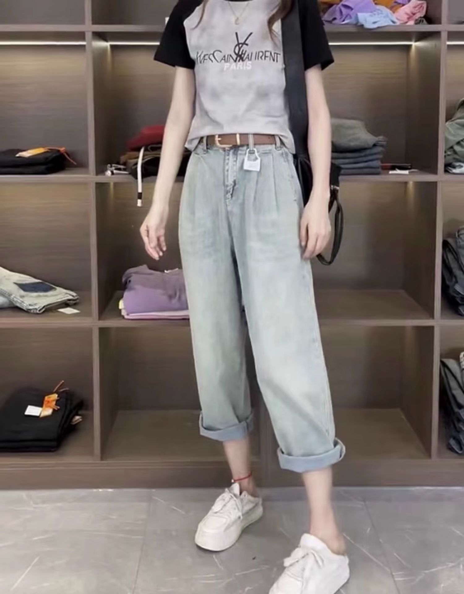 Celana jins harem elastis ukuran Plus wanita, celana Jin kaki lebar lurus ramping pinggang tinggi musim gugur musim dingin, celana jins longgar ukuran besar untuk wanita