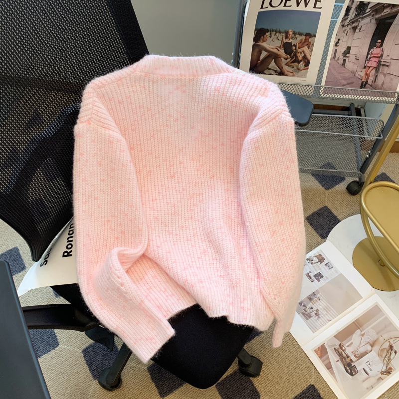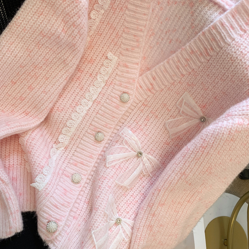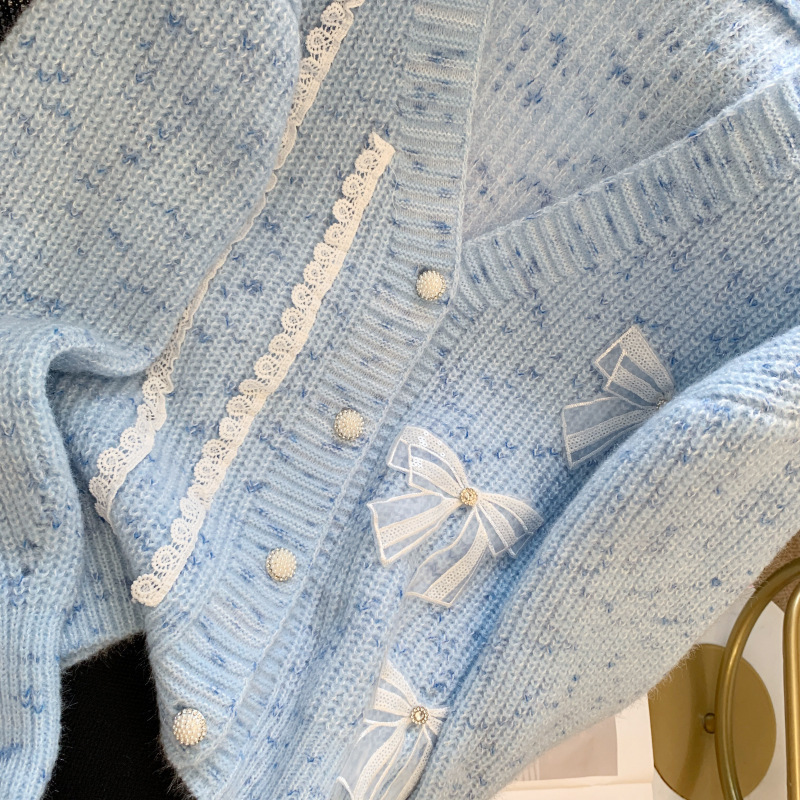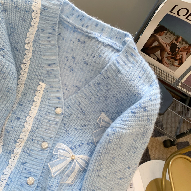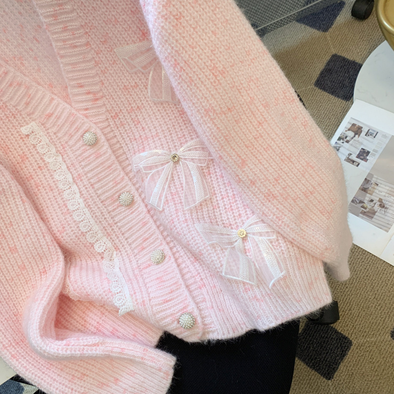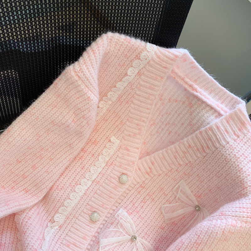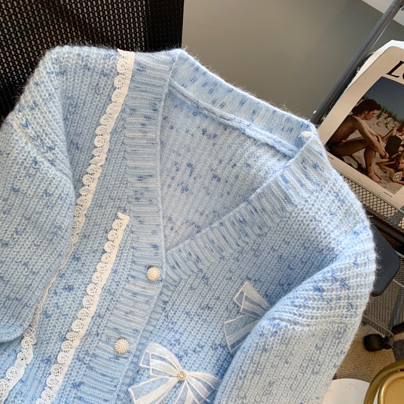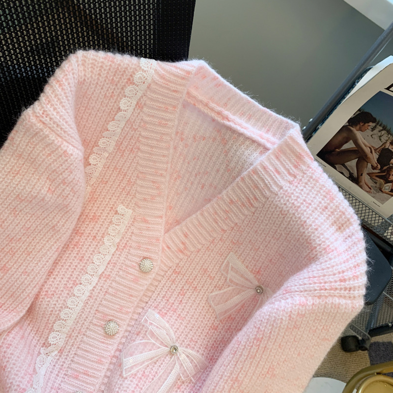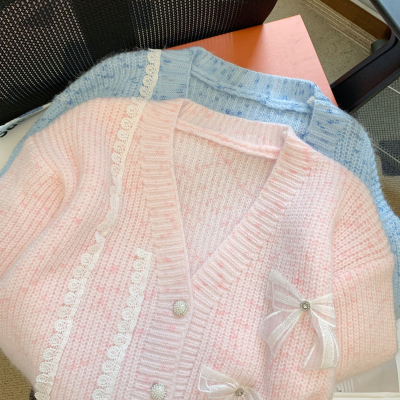 韩系秋冬新款温柔清新宽松慵懒风蕾丝蝴蝶结毛衣开衫女针织衫外套
