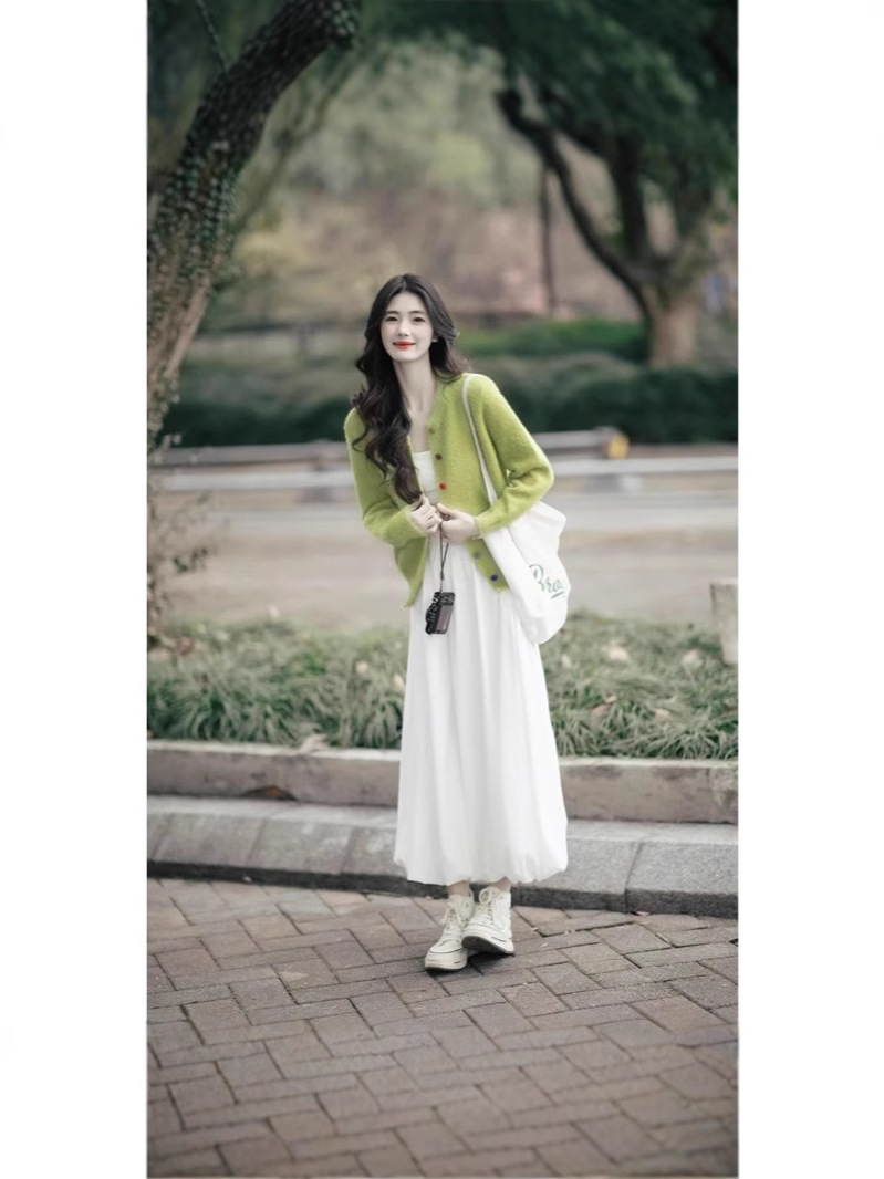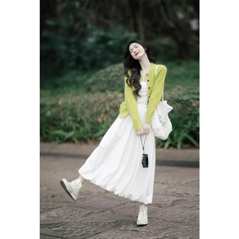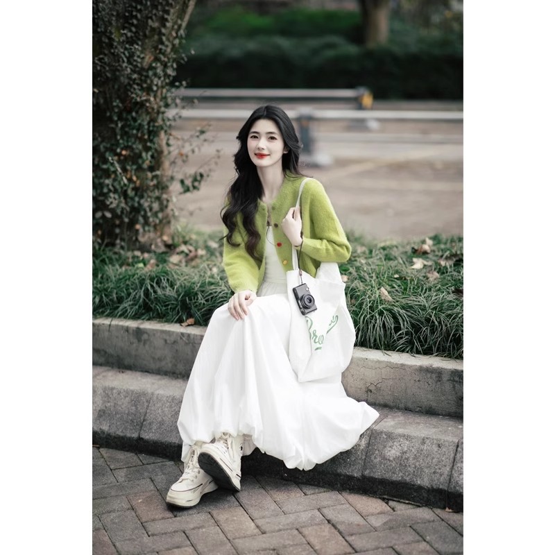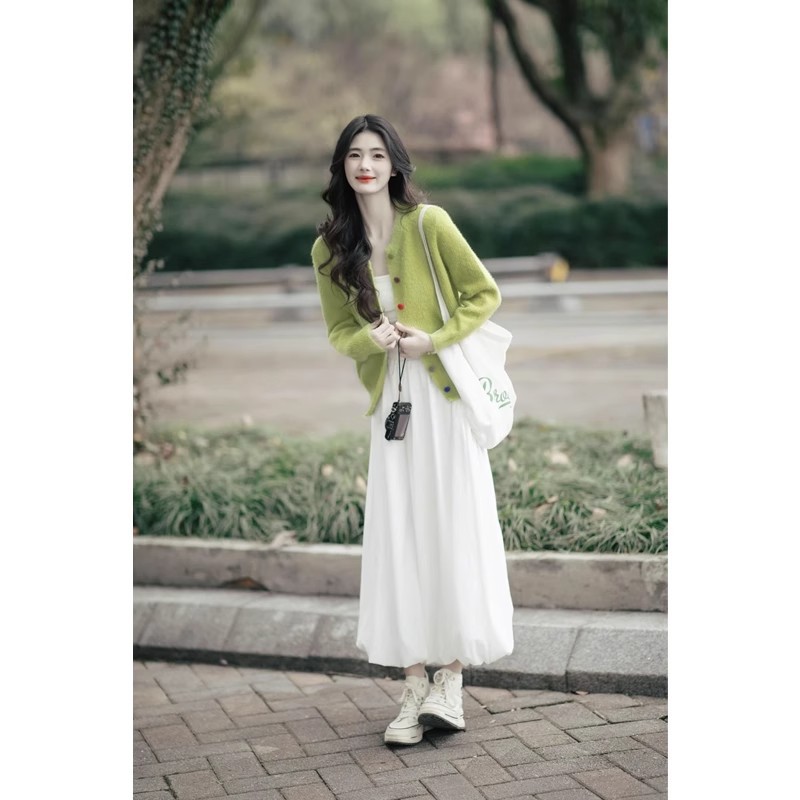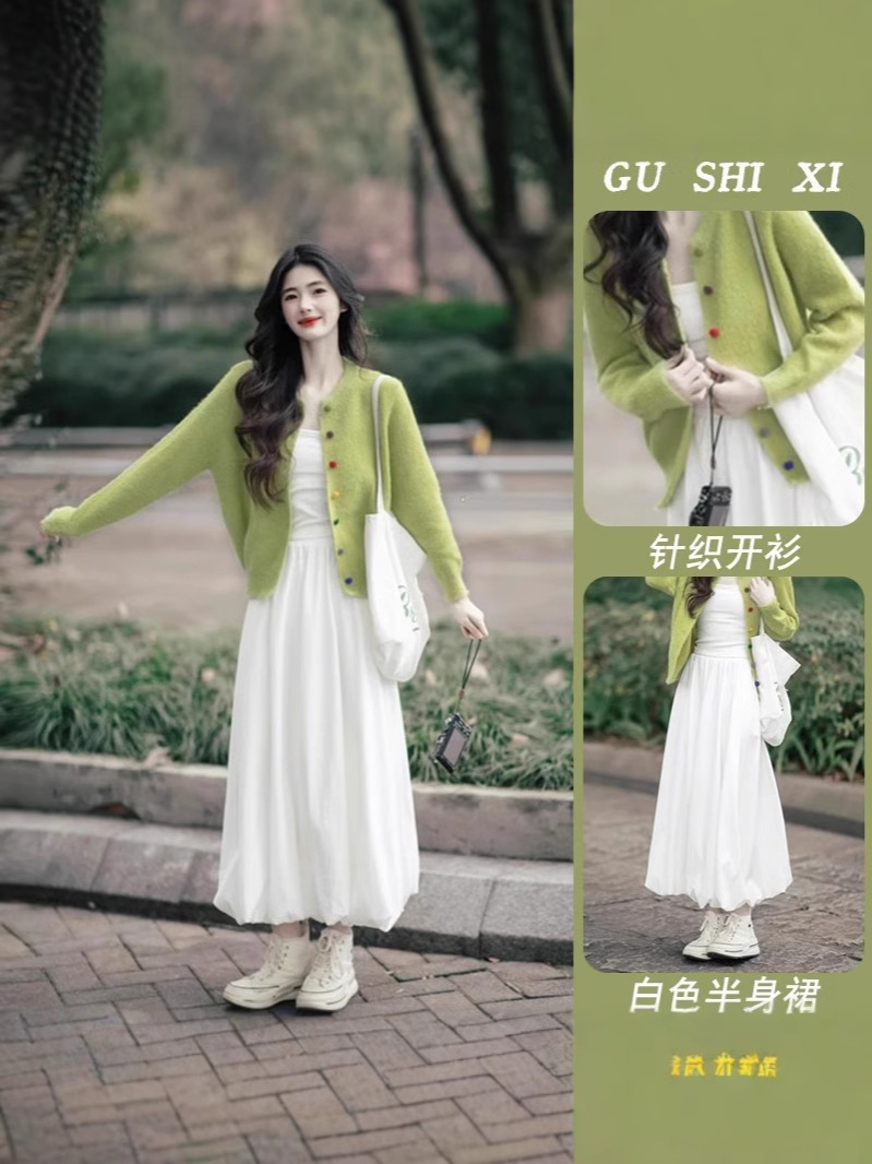 Set Dua Set Kardigan Rajutan Gaya Korea Dipakai di Kaichun Set Dua Potong Pakaian Wanita Modis Mengurangi Usia Model Baru 2025