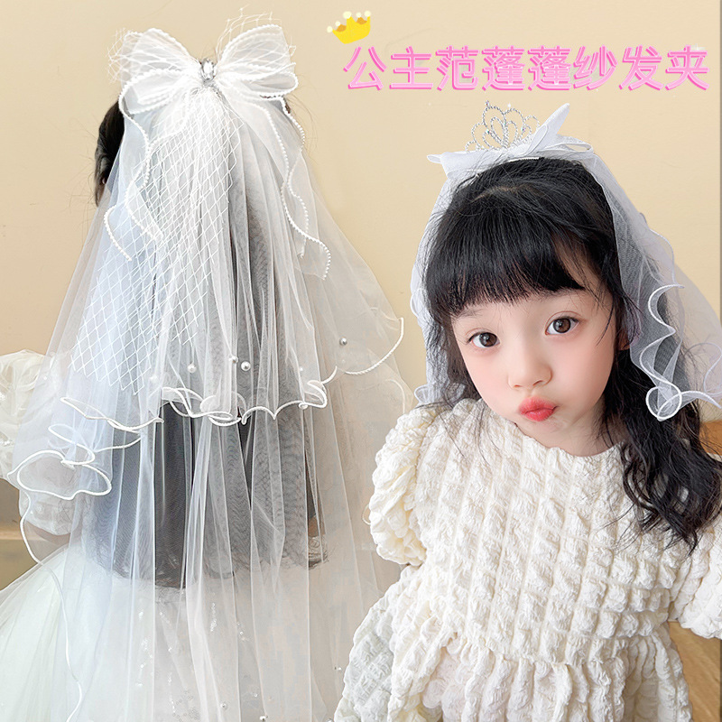 女童头纱公主发饰生日皇冠冰雪儿童节发夹头饰蝴蝶结飘带网纱发卡
