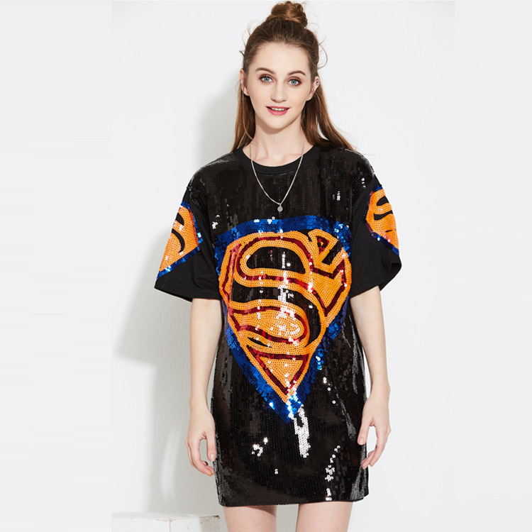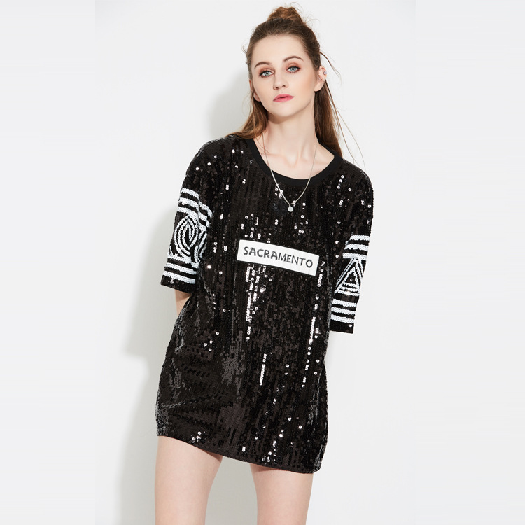 速卖通亚马逊热卖欧美潮流嘻哈亮片T恤衫大码套头宽松短袖上衣女