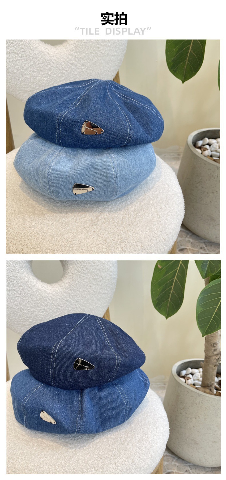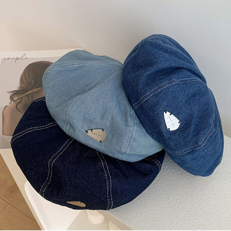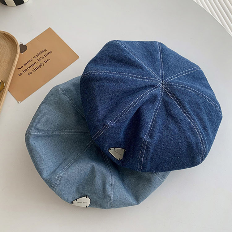 Topi Baret Denim Logam Topi Awan Kecil Terlihat Wajah Lingkar Kepala Besar Retro Inggris Wanita Topi Pelukis Octagon Kasual Manis
